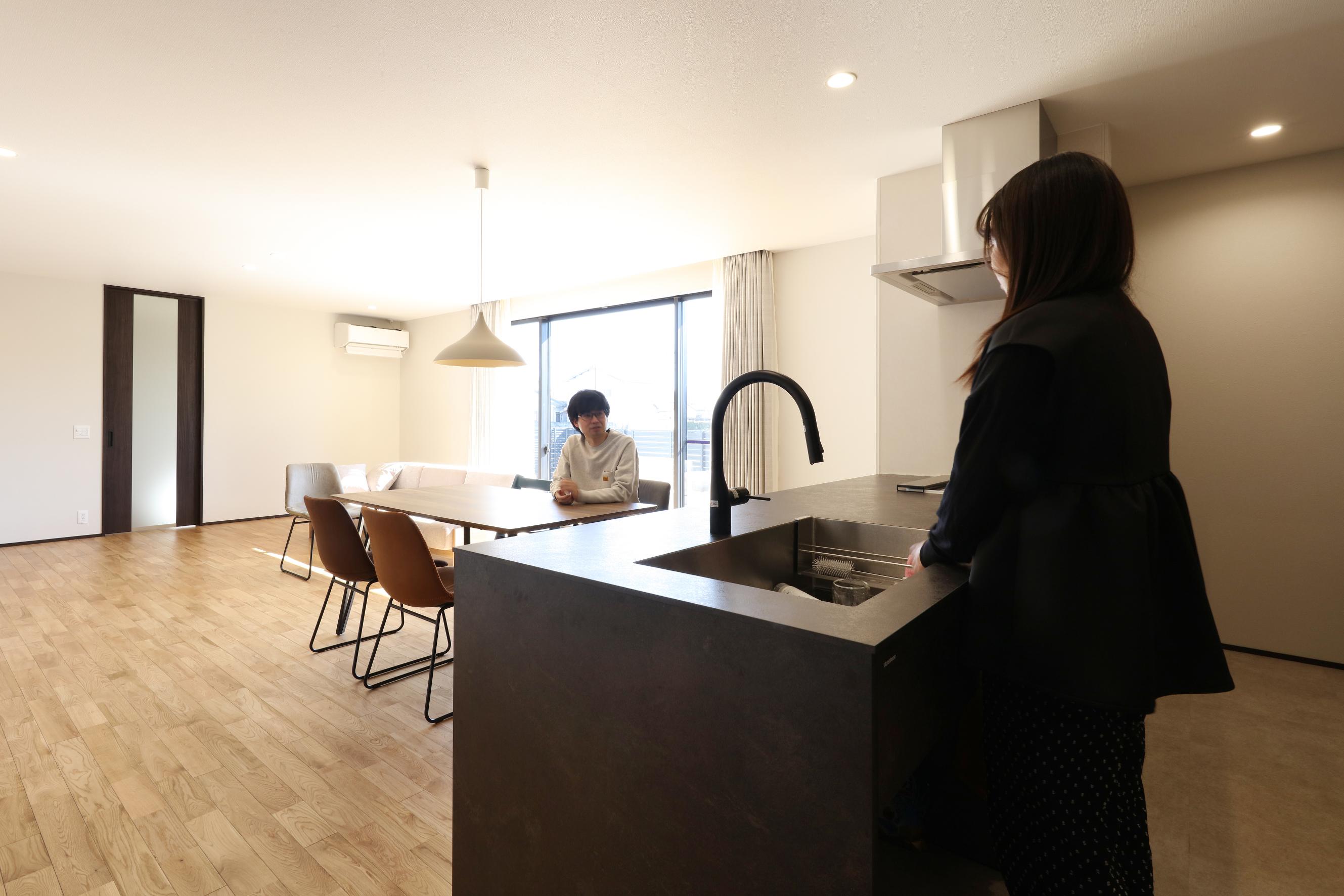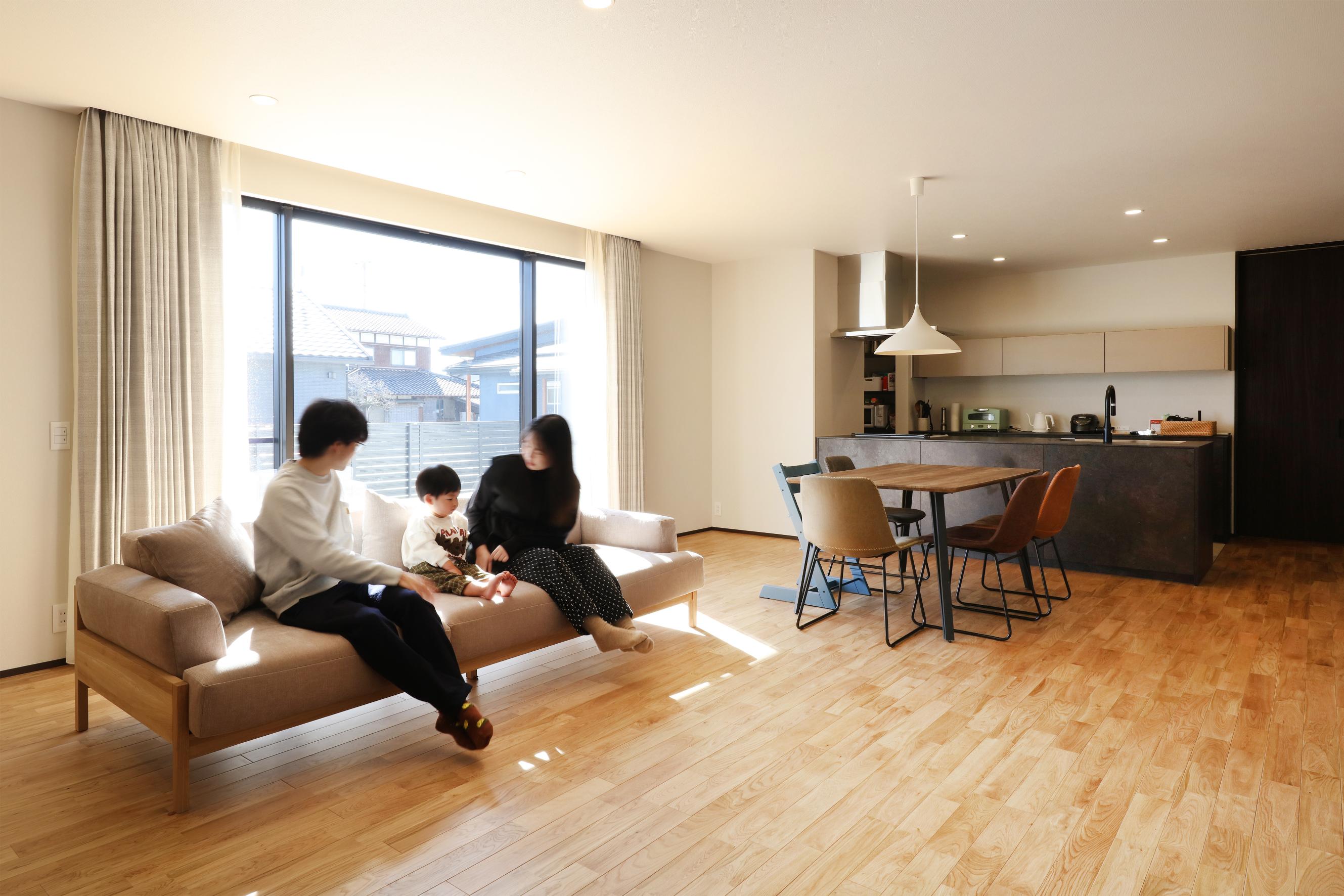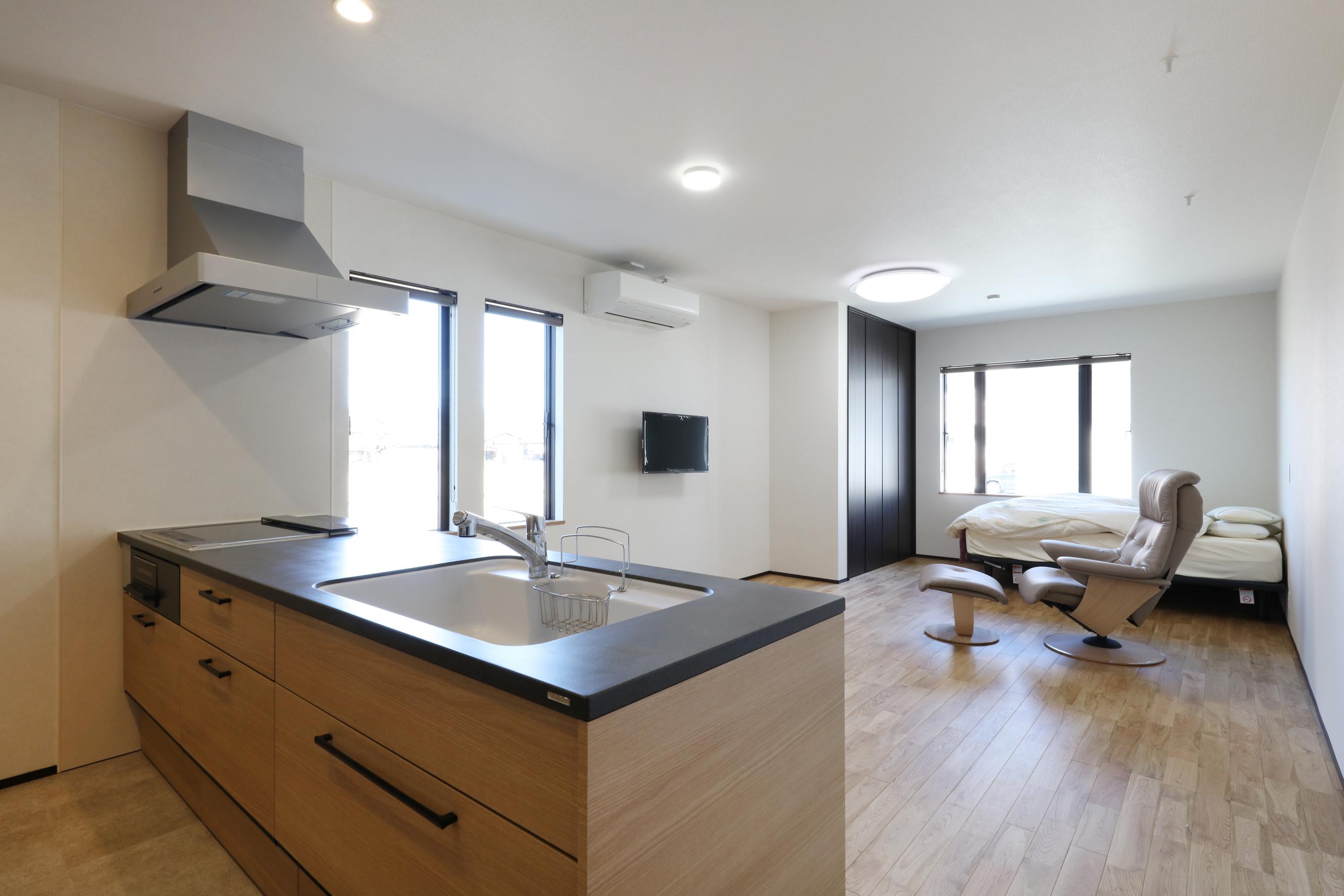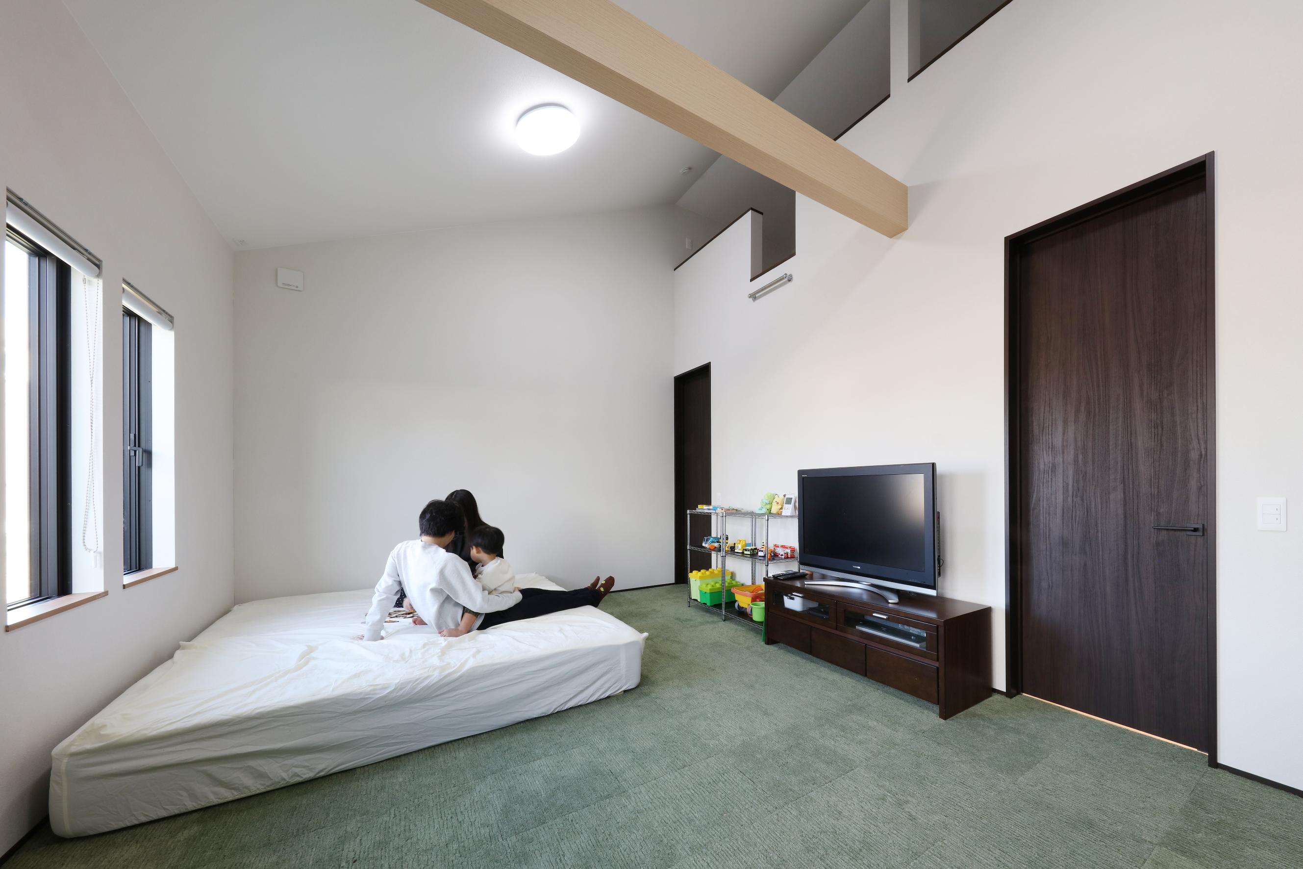 リビングを住まいの中心に据え、家族のつながりを自然に感じられる動線計画としました。 ビルトインガレージを備え、天候に左右されず快適に出入りができるのも魅力のひとつです。 寝室の上部には、遊び心を取り入れた多目的なスペースを設け、暮らしに楽しさとゆとりをプラス。 平屋ならではの広い屋根面積を活かし、太陽光発電を搭載することで、環境にも家計にもやさしいエコな住まいを実現しました。 機能性と遊び心、そして持続可能な暮らしをバランスよく取り入れた一邸です。