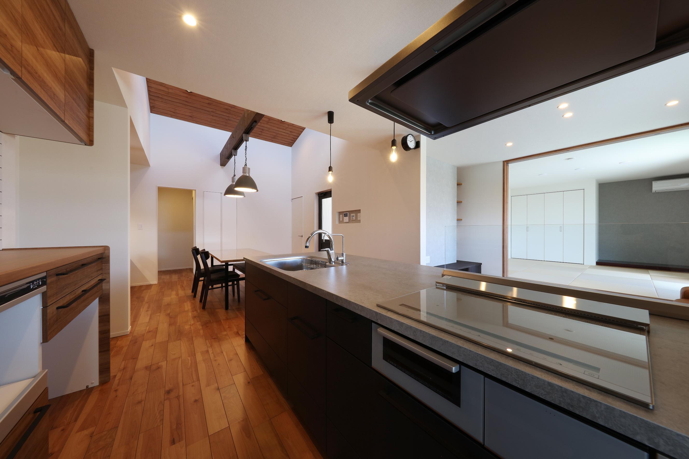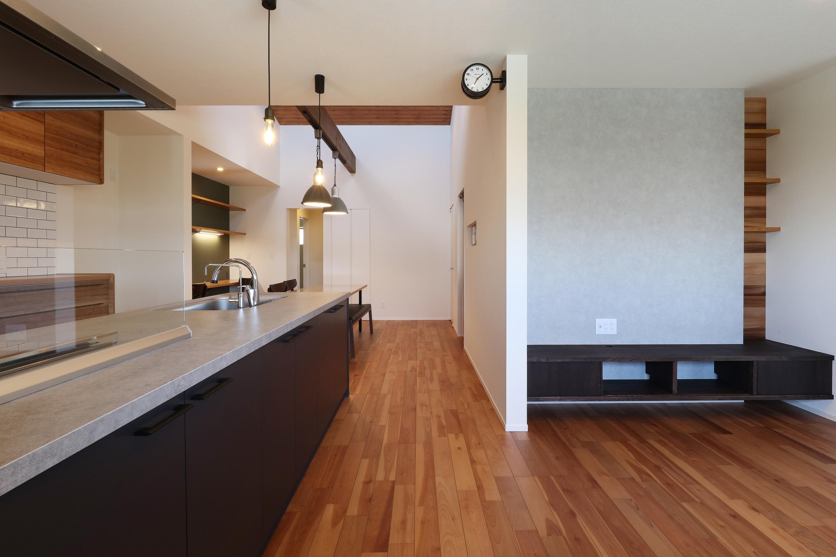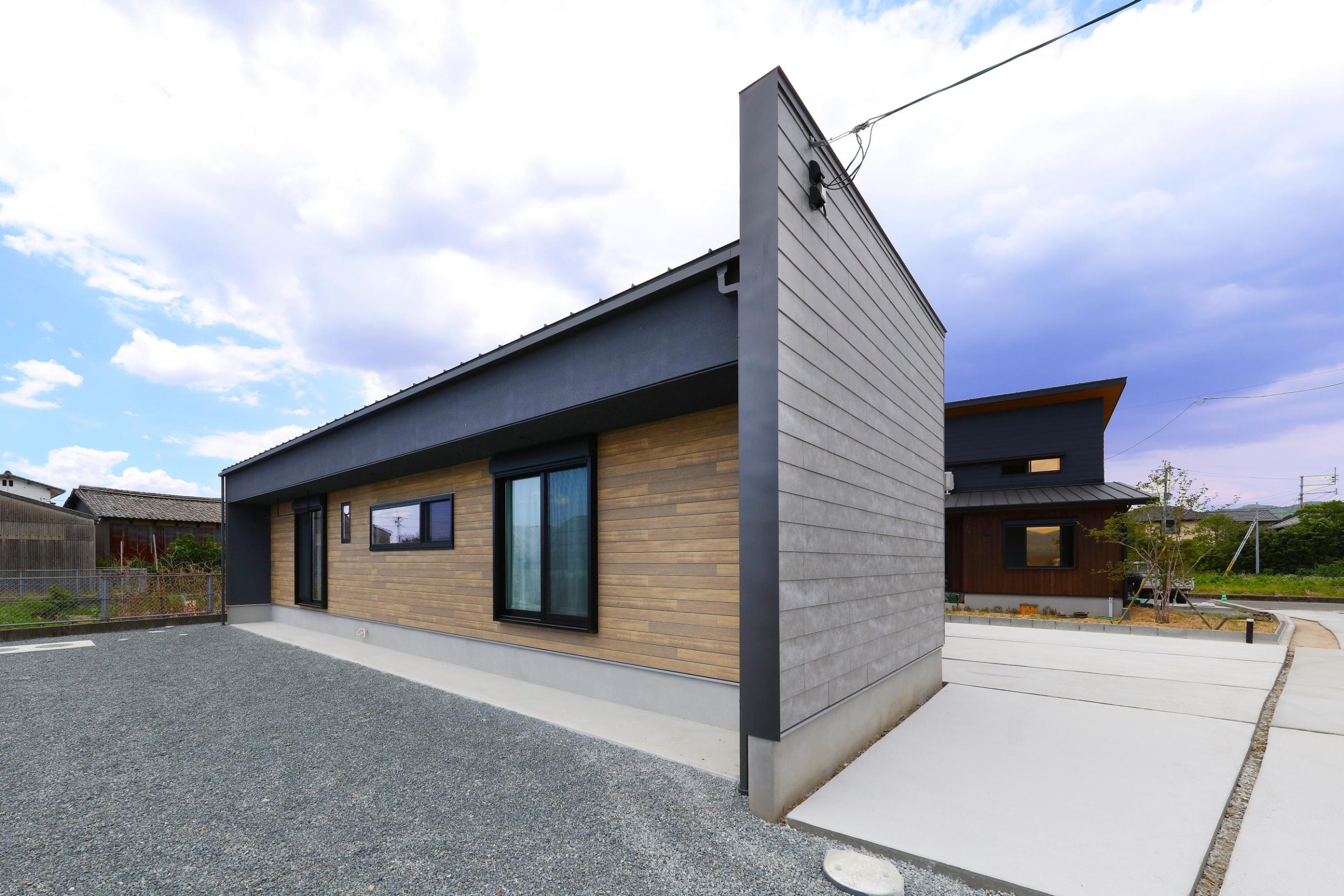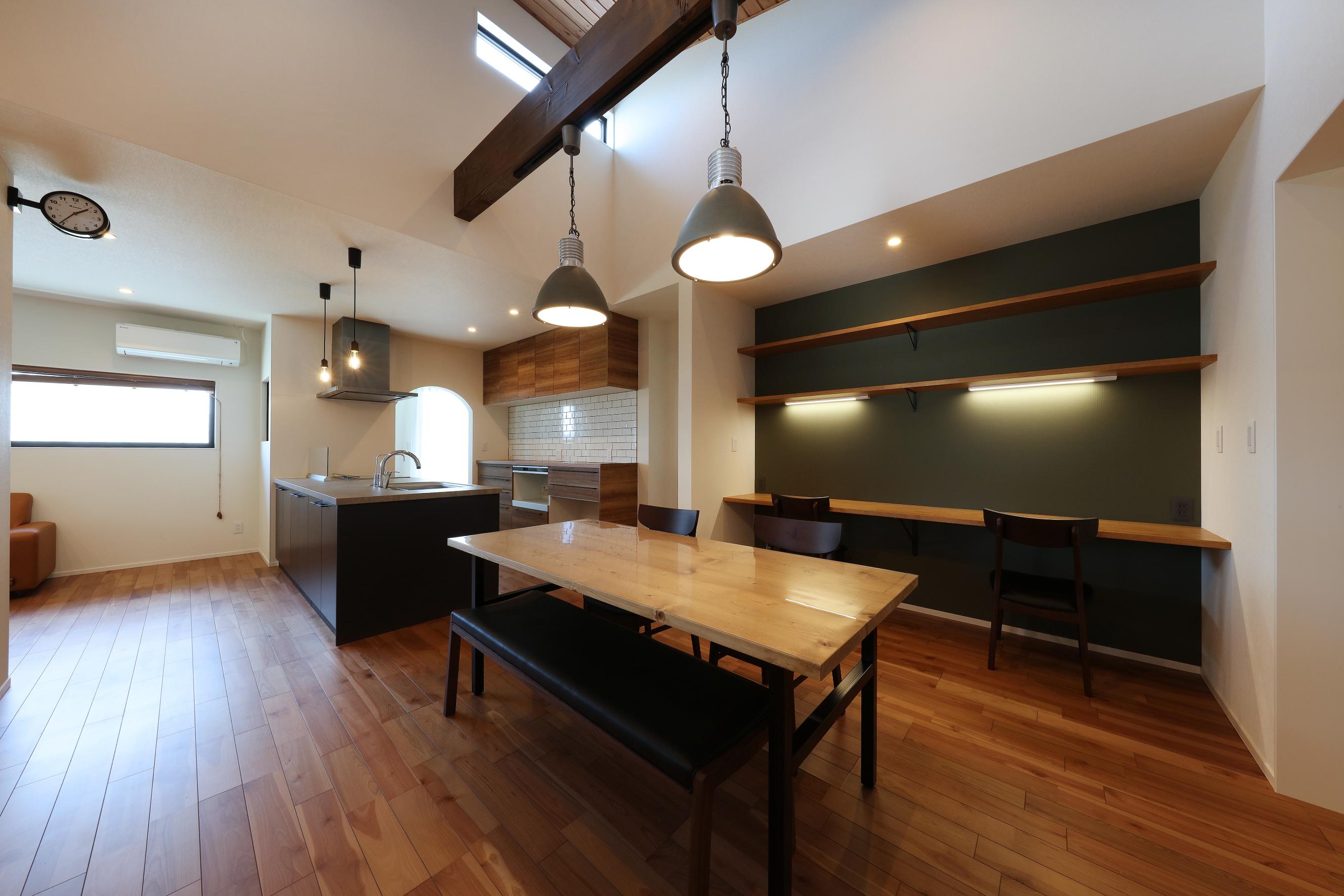 モダンヴィンテージのテイストをベースに、随所に遊び心とこだわりを散りばめた平屋住宅です。 空間ごとに表情のある素材や色合いを取り入れ、住まい全体に落ち着きと個性をバランスよくまとめました。 造作の棚やデスクを各所に設え、暮らしにフィットする使いやすさと居心地の良さを実現。 照明計画にもこだわり、ひとつひとつの照明器具を丁寧にセレクト。住まう人の自分らしさが映える雰囲気を演出しています。
