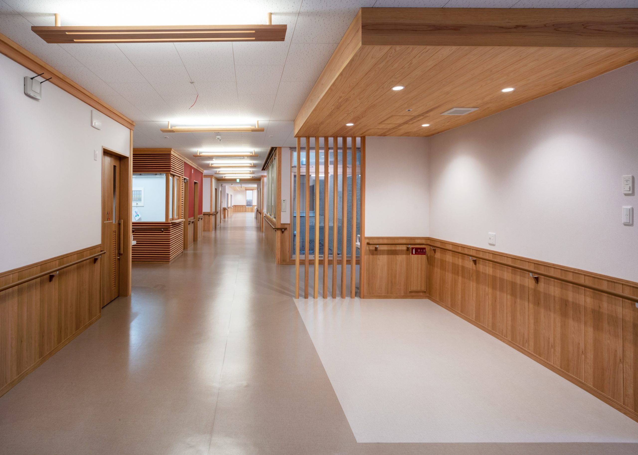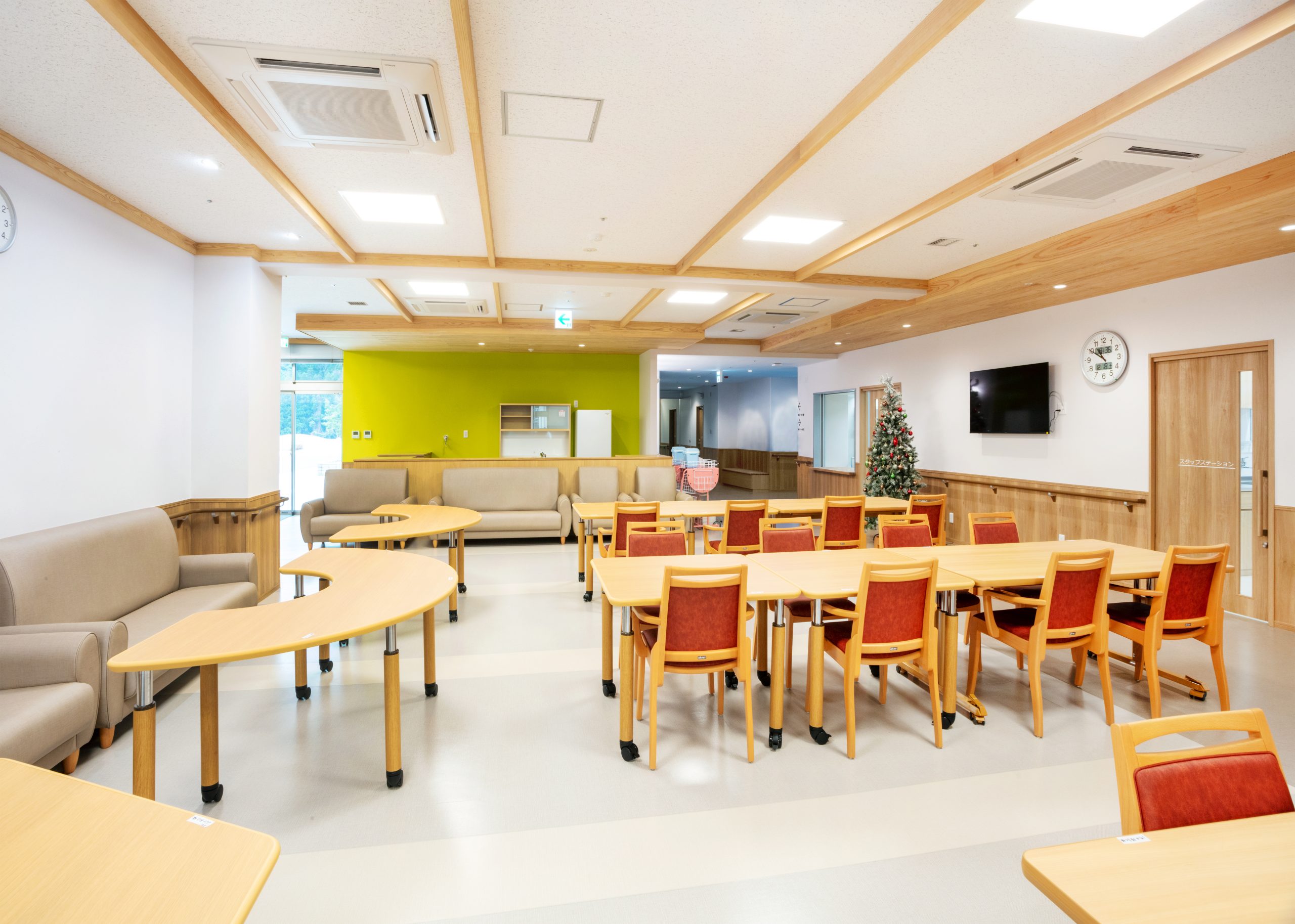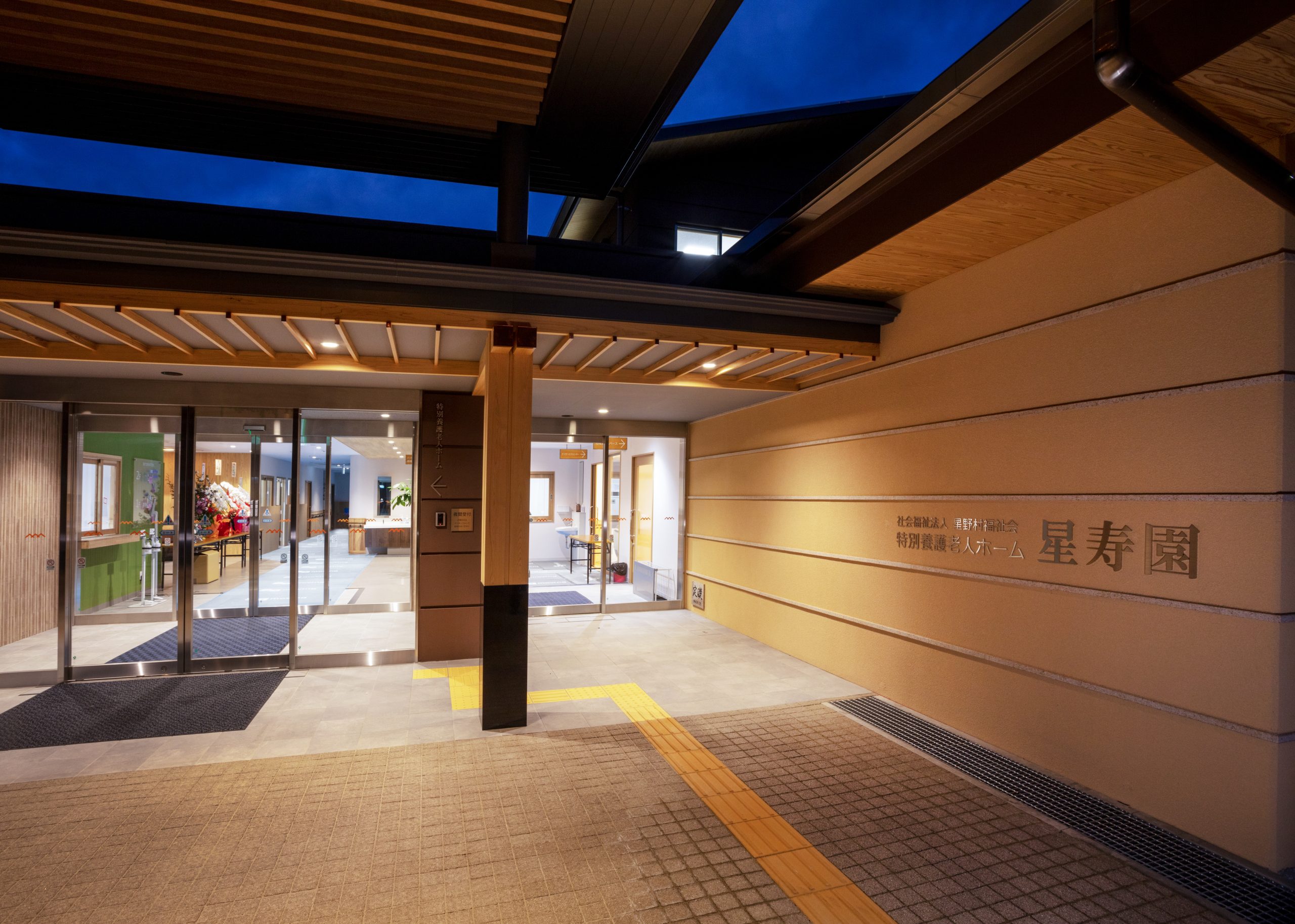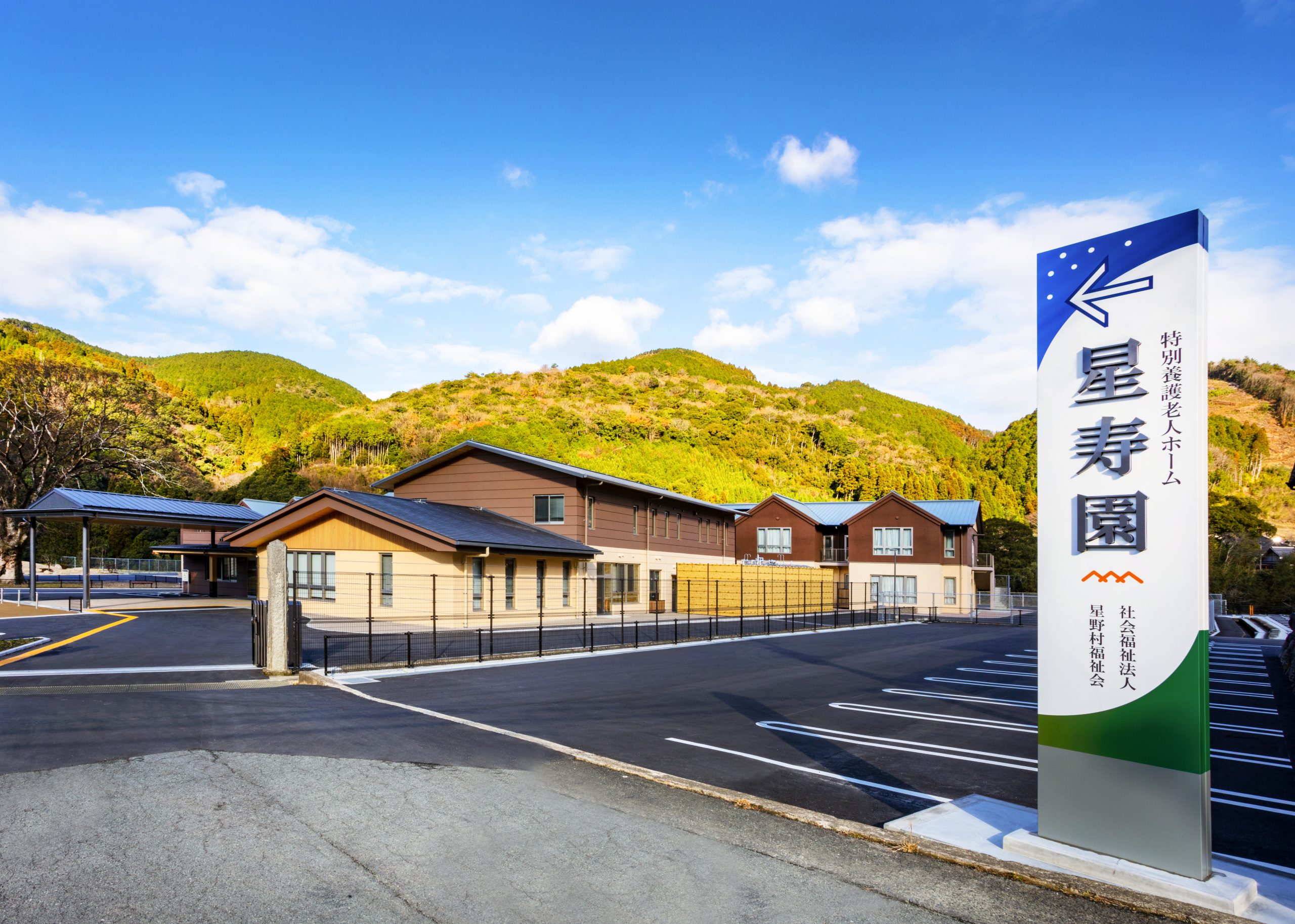 ”日本で最も美しい村”福岡県八女市星野村に、弊社が施工した『特別養護老人ホーム 星寿園』が移転開設しました。 「星野村の風景と地域に寄り添い、すまいと交流の拠点となる施設」がコンセプトで、外観は星野村の集落をイメージし、木をふんだんに使った切妻屋根の小さなお家が寄り集まったようなつくりです。 居住棟2階は、木造とし(その他の構造は鉄筋コンクリート造+一部鉄骨造)、内部空間もできるだけ木質化するなど、日常的に木の温もりを感じることができます。 個室の設置、多床室には木製のパーテーションを設けることで感染症対策、プライバシーの確保ができるように工夫され、ベッドサイドには窓があり明るい空間となっています。 (※八女市星野村は「日本で最も美しい村連合」に加盟)
