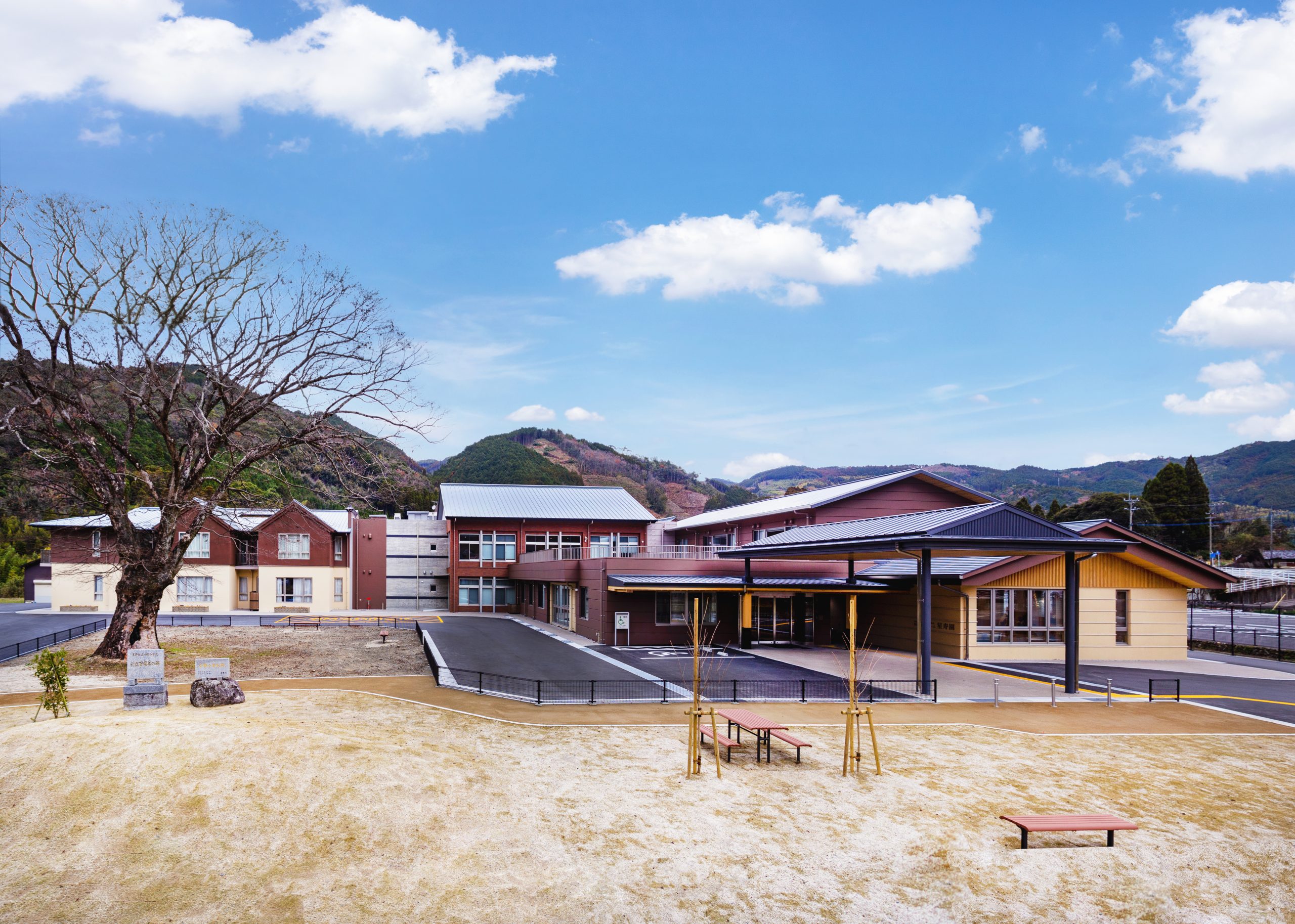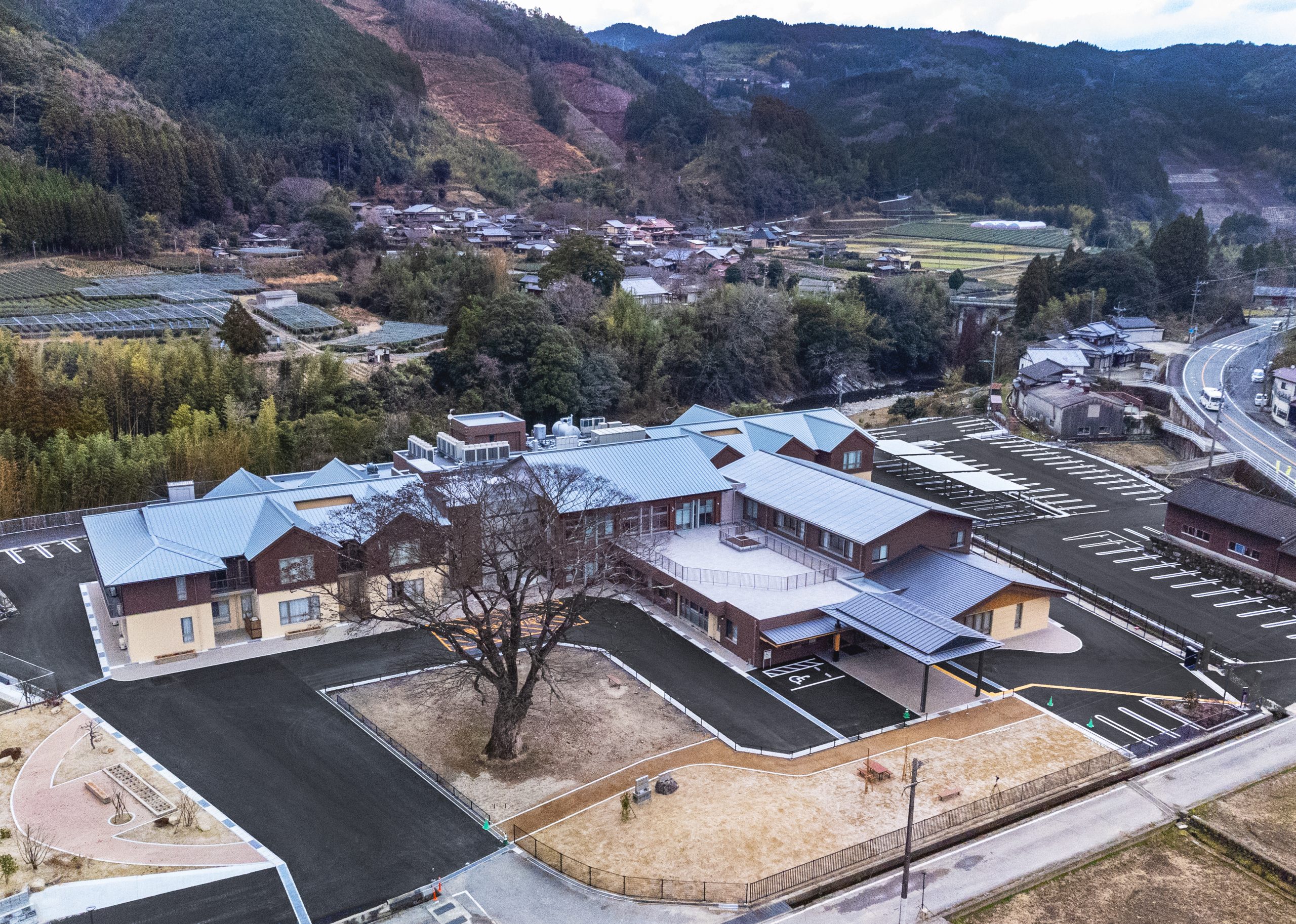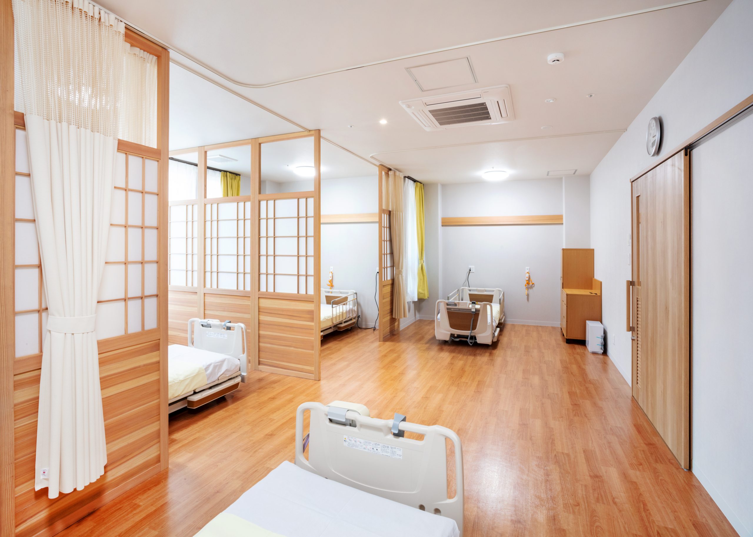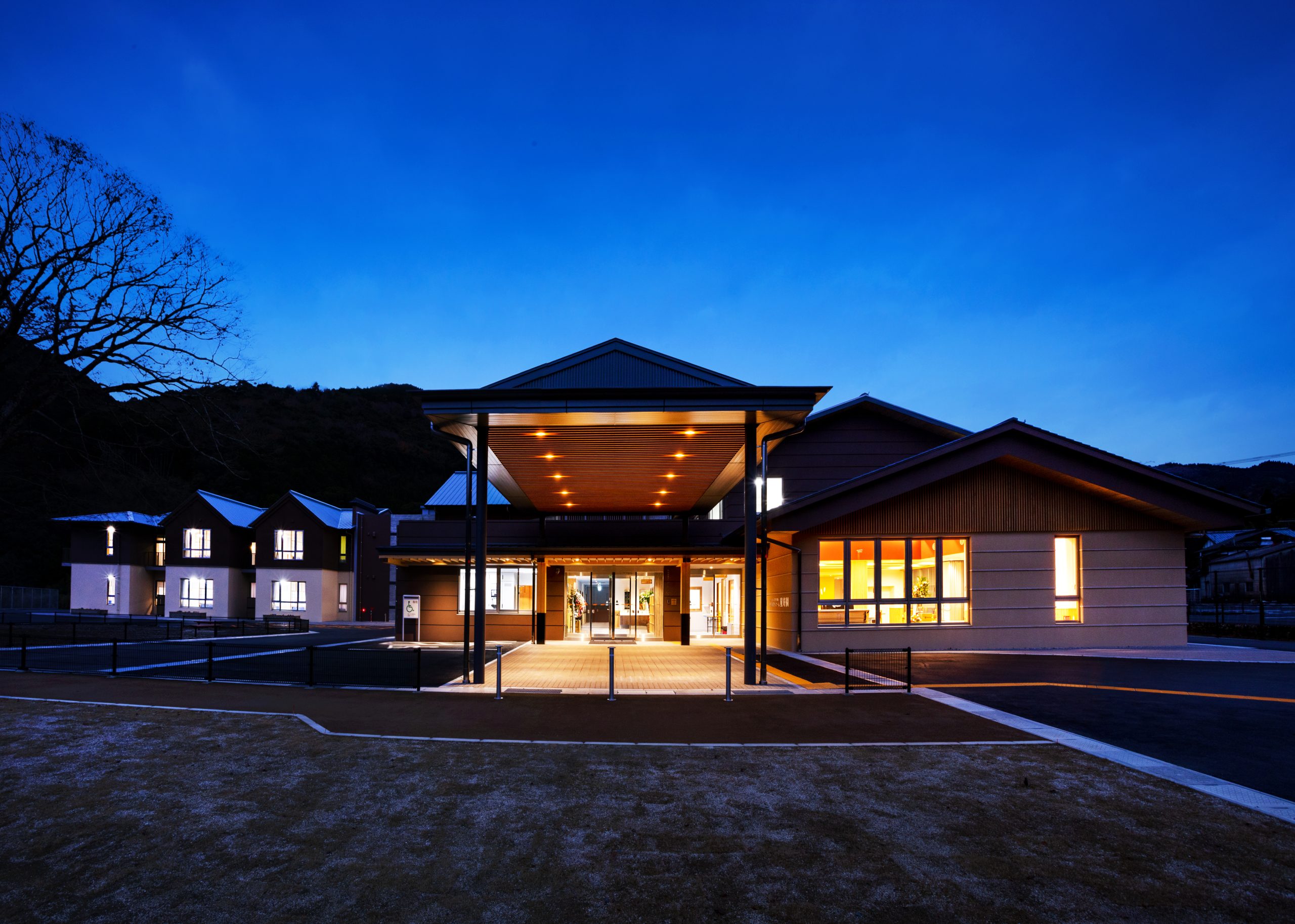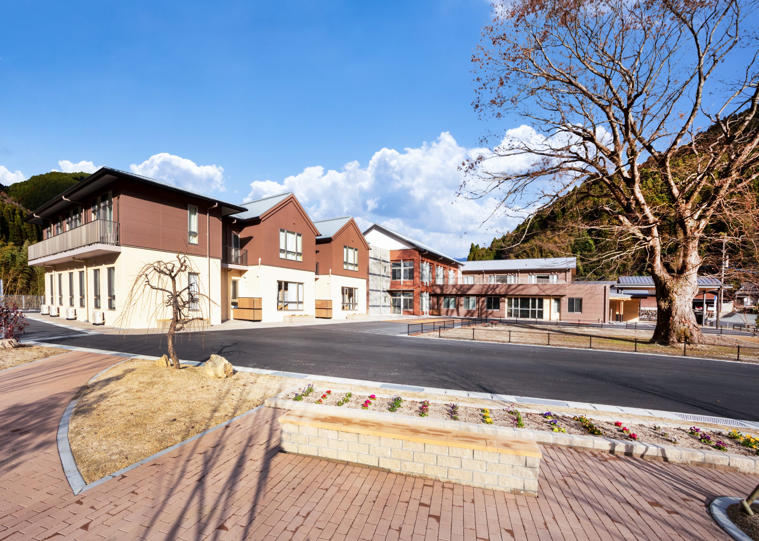 ”日本で最も美しい村”福岡県八女市星野村に、弊社が施工した『特別養護老人ホーム 星寿園』が移転開設しました。 「星野村の風景と地域に寄り添い、すまいと交流の拠点となる施設」がコンセプトで、外観は星野村の集落をイメージし、木をふんだんに使った切妻屋根の小さなお家が寄り集まったようなつくりです。 居住棟2階は、木造とし(その他の構造は鉄筋コンクリート造+一部鉄骨造)、内部空間もできるだけ木質化するなど、日常的に木の温もりを感じることができます。 個室の設置、多床室には木製のパーテーションを設けることで感染症対策、プライバシーの確保ができるように工夫され、ベッドサイドには窓があり明るい空間となっています。 (※八女市星野村は「日本で最も美しい村連合」に加盟)