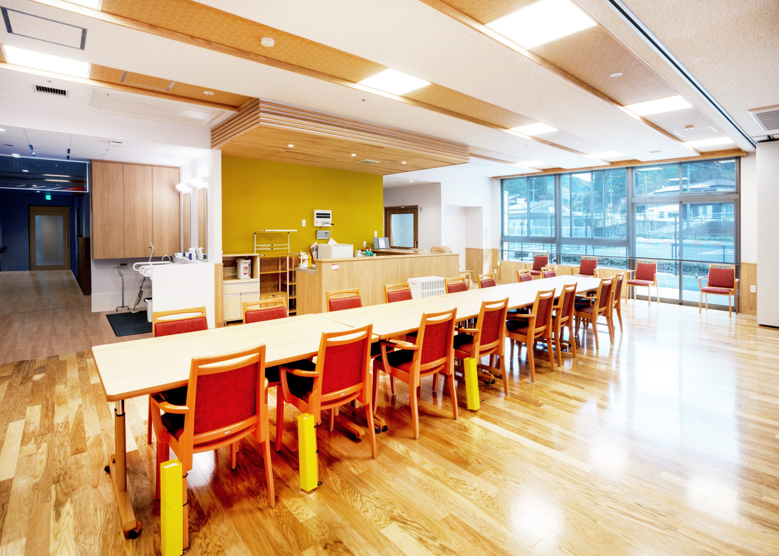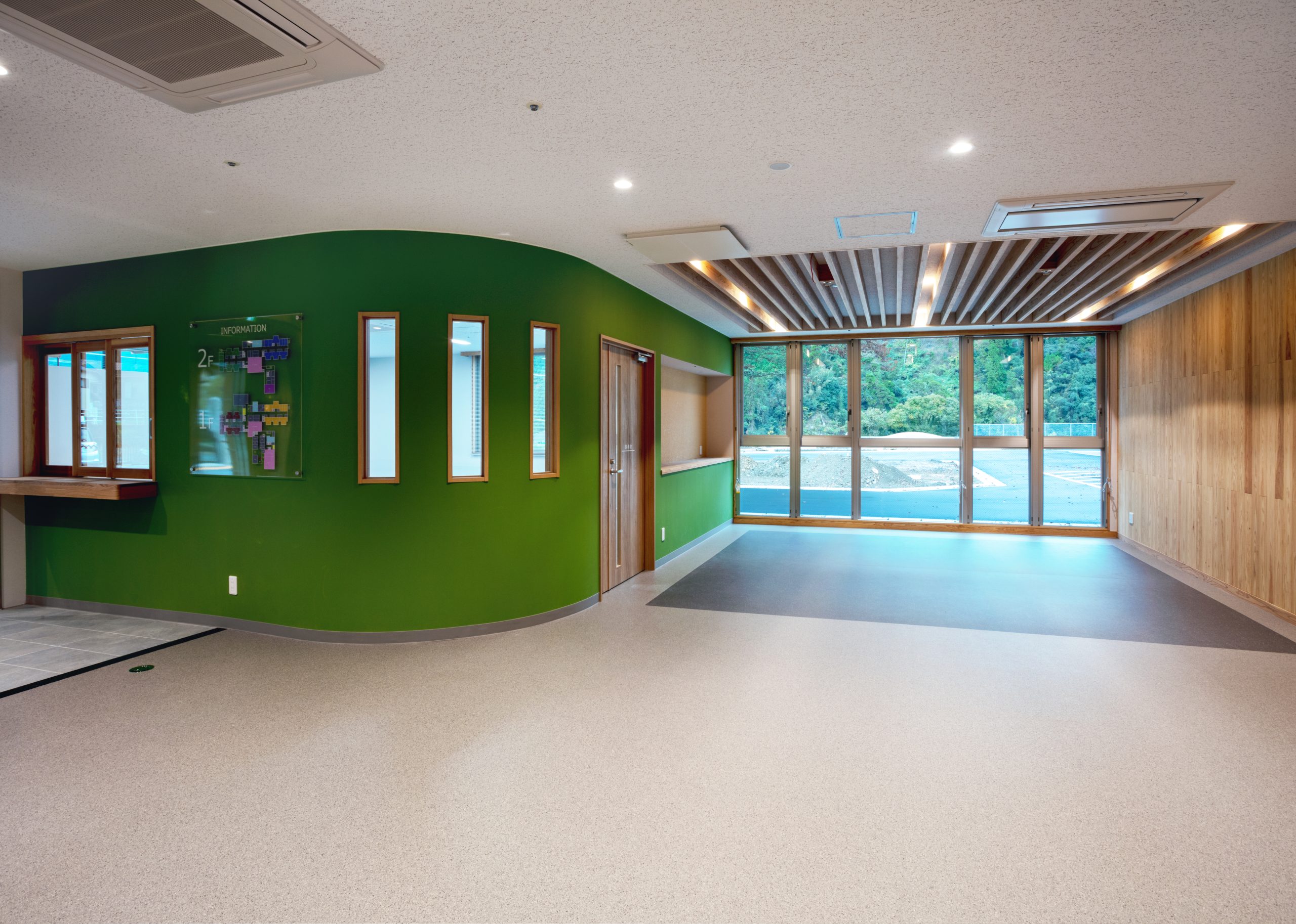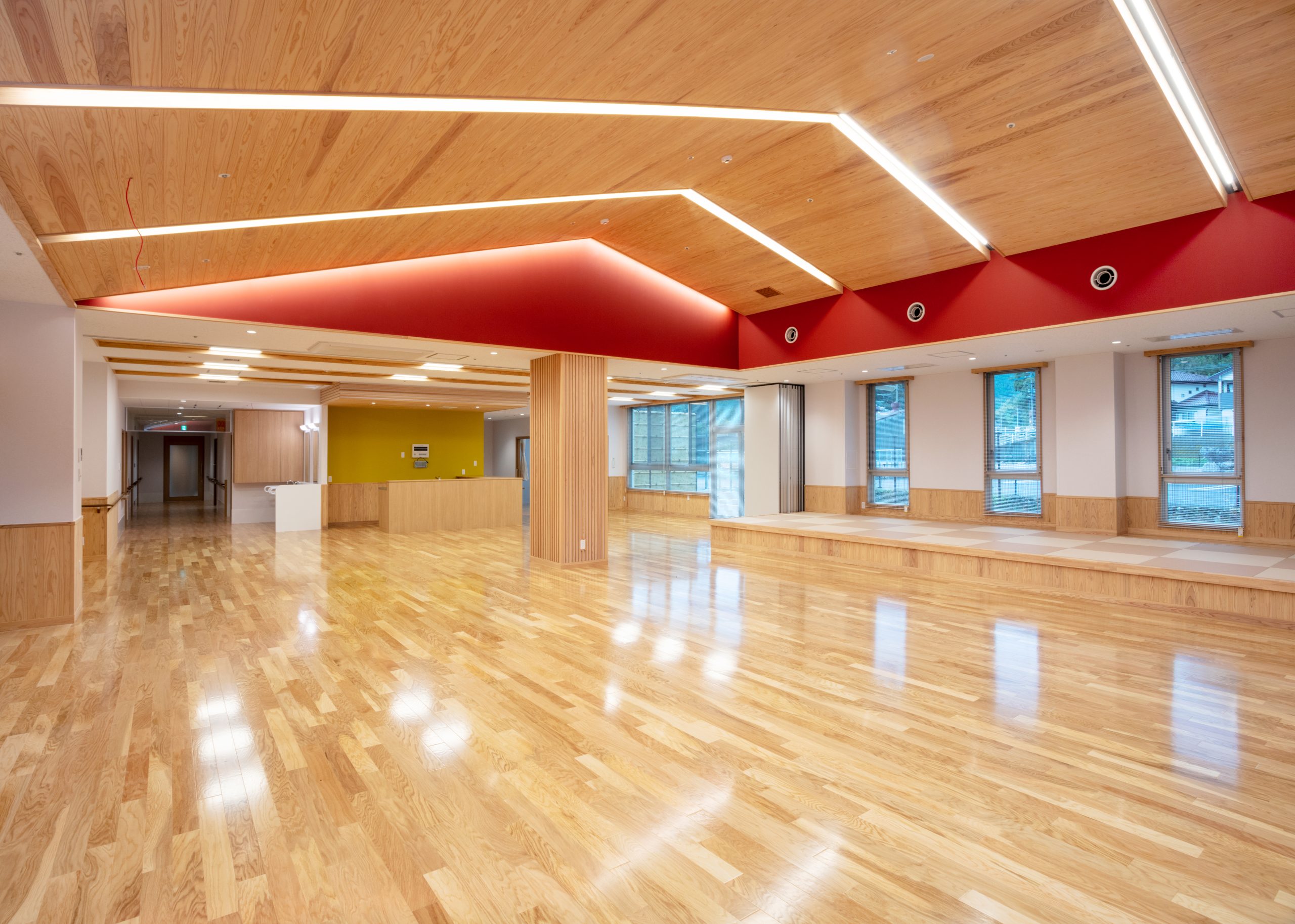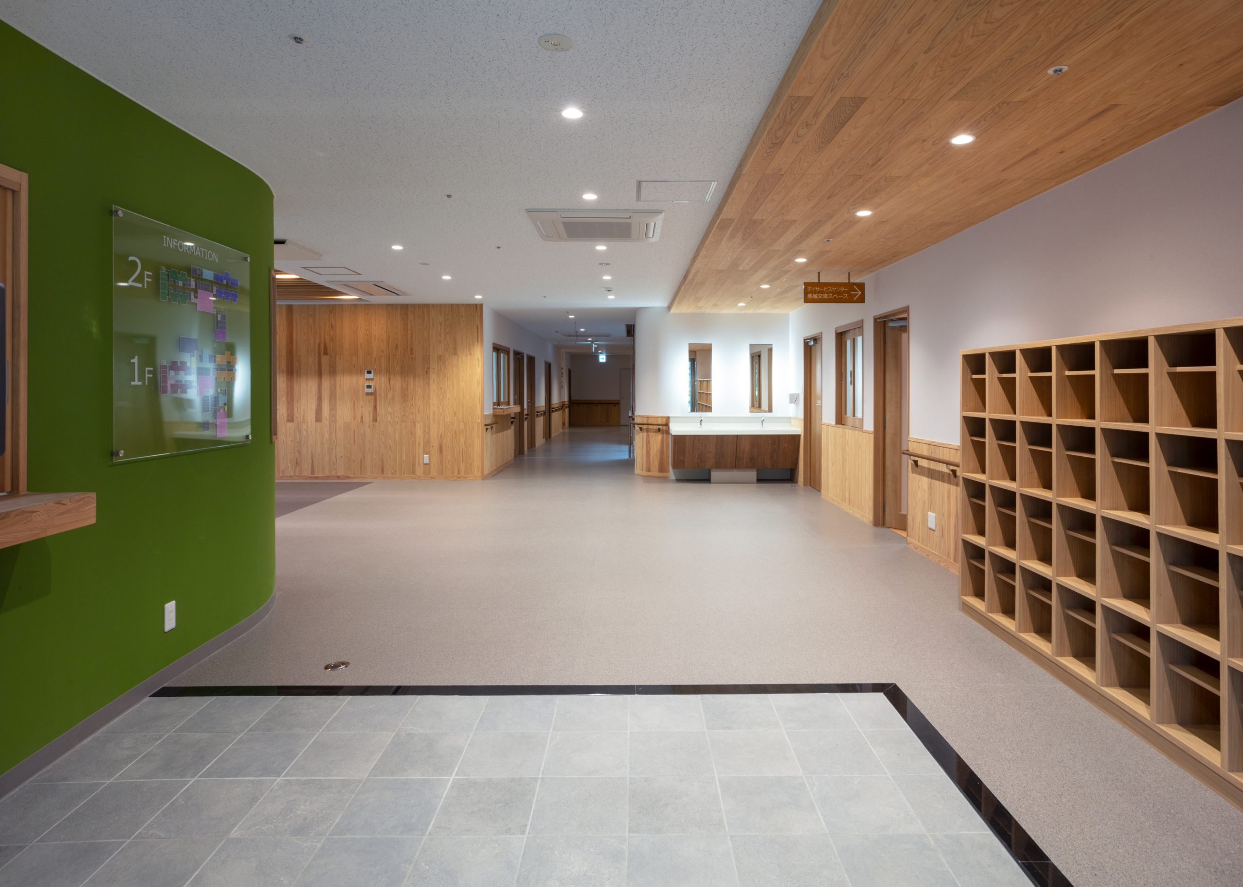 ”日本で最も美しい村”福岡県八女市星野村に、弊社が施工した『特別養護老人ホーム 星寿園』が移転開設しました。 「星野村の風景と地域に寄り添い、すまいと交流の拠点となる施設」がコンセプトで、外観は星野村の集落をイメージし、木をふんだんに使った切妻屋根の小さなお家が寄り集まったようなつくりです。 居住棟2階は、木造とし(その他の構造は鉄筋コンクリート造+一部鉄骨造)、内部空間もできるだけ木質化するなど、日常的に木の温もりを感じることができます。 個室の設置、多床室には木製のパーテーションを設けることで感染症対策、プライバシーの確保ができるように工夫され、ベッドサイドには窓があり明るい空間となっています。 (※八女市星野村は「日本で最も美しい村連合」に加盟)