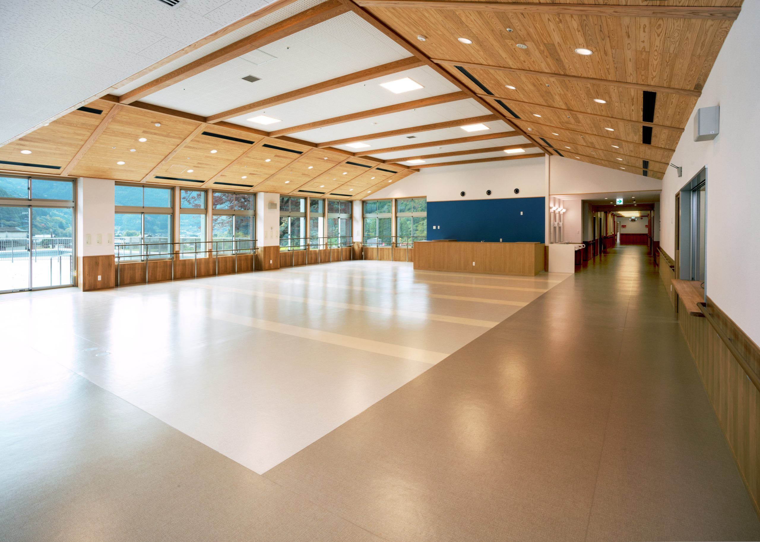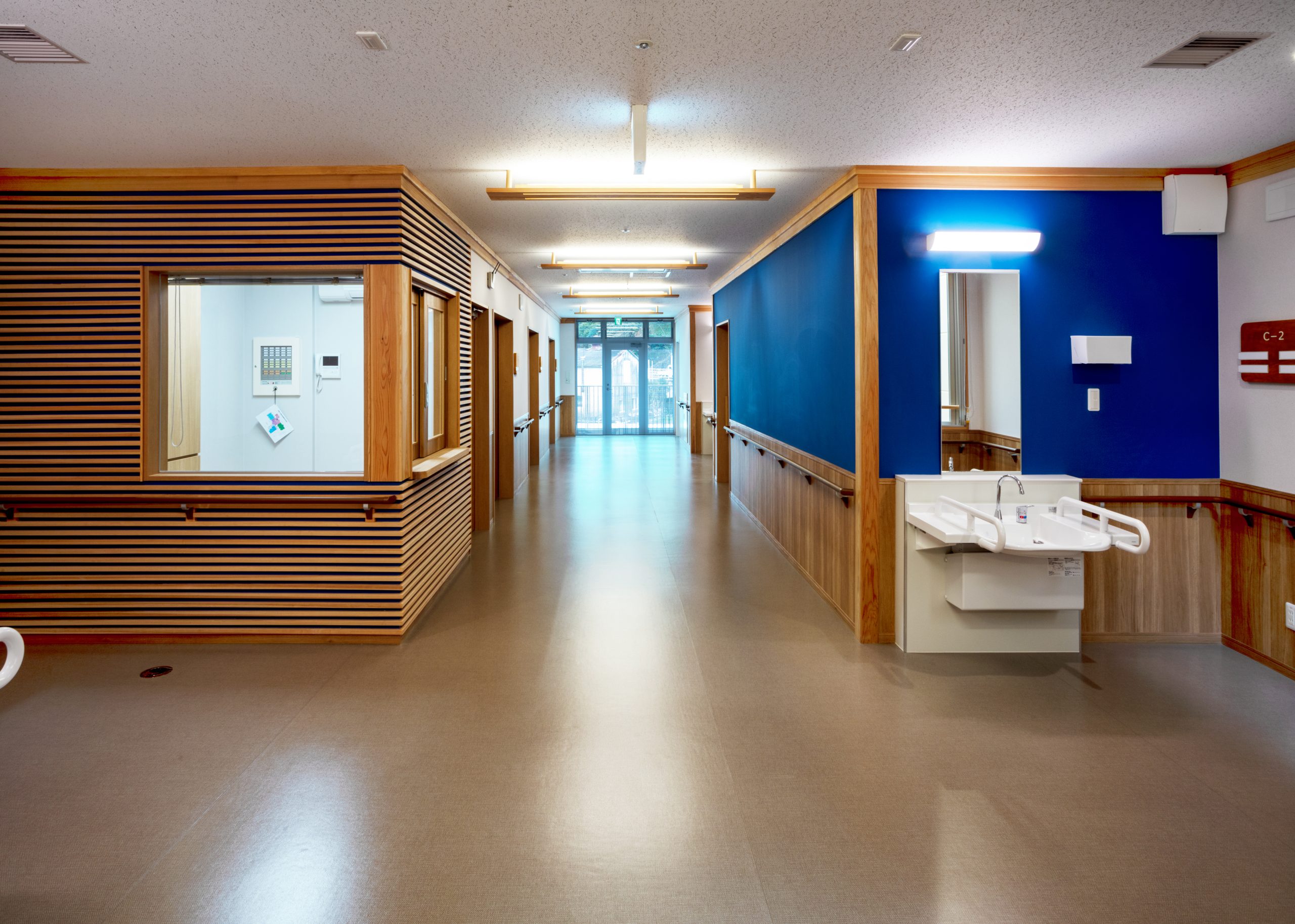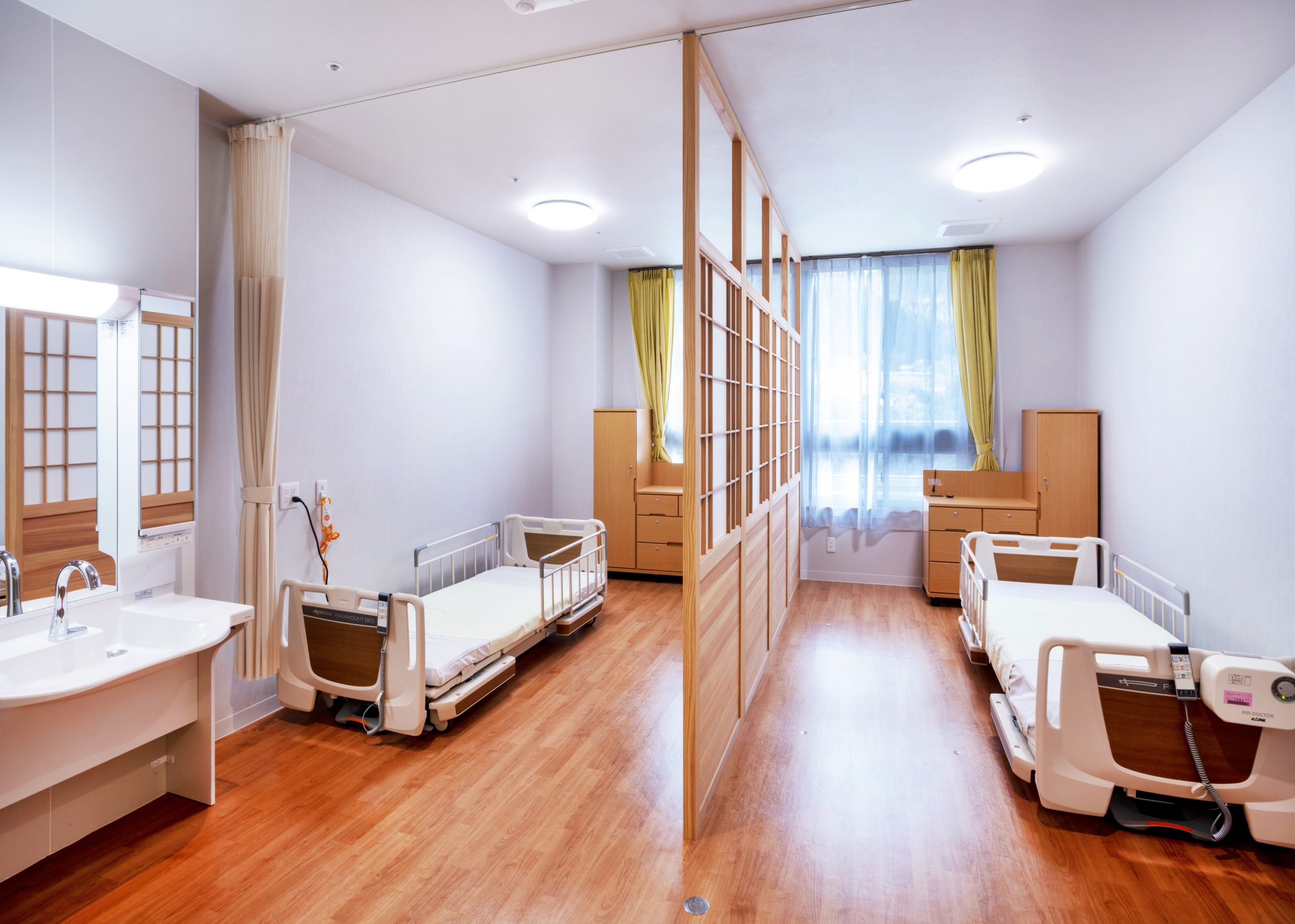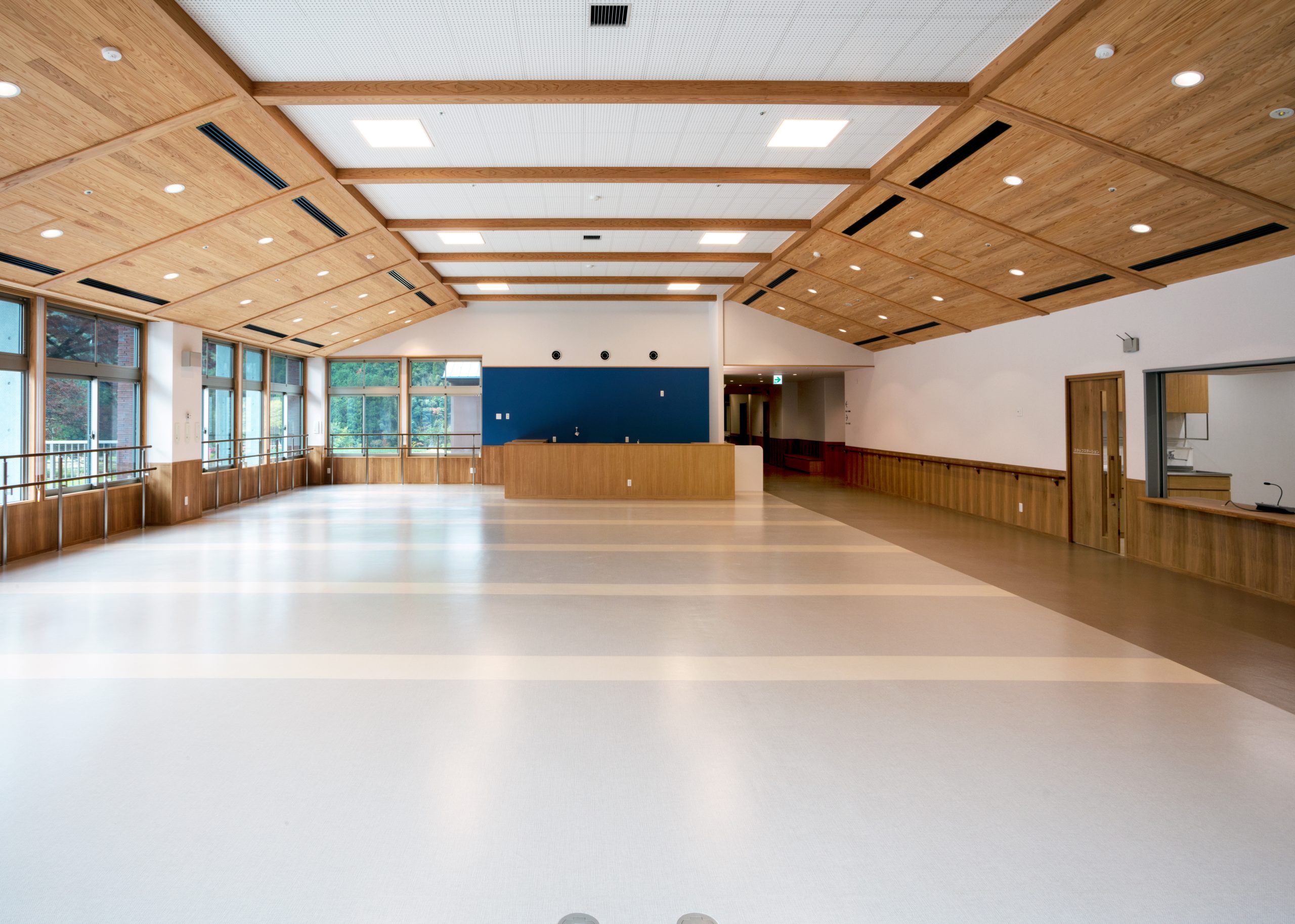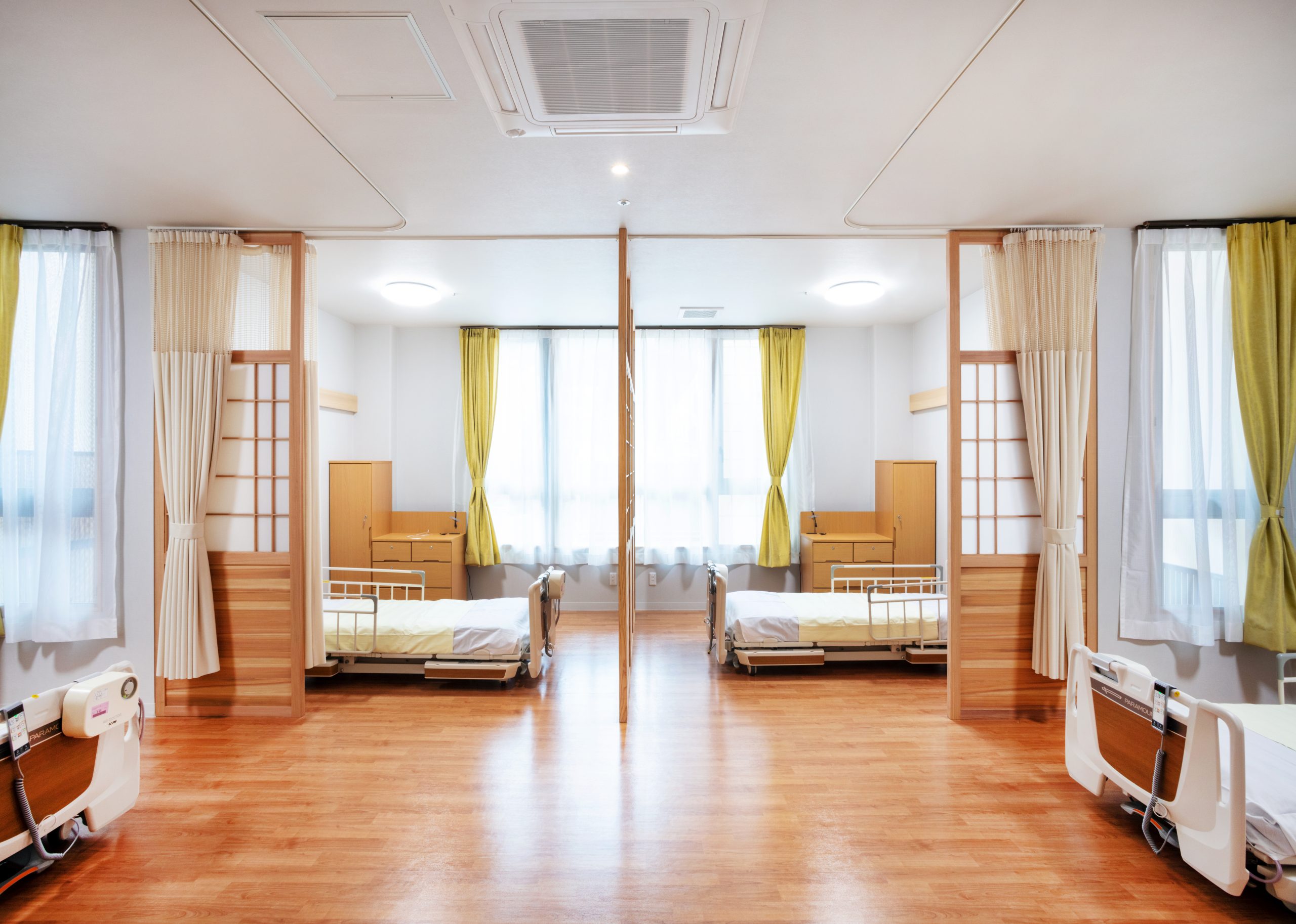 ”日本で最も美しい村”福岡県八女市星野村に、弊社が施工した『特別養護老人ホーム 星寿園』が移転開設しました。 「星野村の風景と地域に寄り添い、すまいと交流の拠点となる施設」がコンセプトで、外観は星野村の集落をイメージし、木をふんだんに使った切妻屋根の小さなお家が寄り集まったようなつくりです。 居住棟2階は、木造とし(その他の構造は鉄筋コンクリート造+一部鉄骨造)、内部空間もできるだけ木質化するなど、日常的に木の温もりを感じることができます。 個室の設置、多床室には木製のパーテーションを設けることで感染症対策、プライバシーの確保ができるように工夫され、ベッドサイドには窓があり明るい空間となっています。 (※八女市星野村は「日本で最も美しい村連合」に加盟)