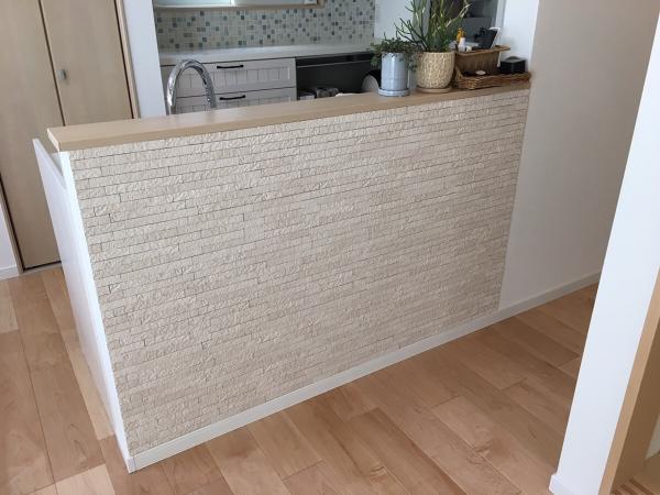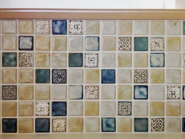 キッチン空間にタイルを施工しました。キッチンカウンター下にはLIXIL”エコカラットプラス・ブルックリンボーダー”を採用し、自然な風合いのデザインがナチュラルな空間におすすめです。収納側には名古屋モザイクタイルの”ルーメン”を採用。やわらかい色合いのタイルがキッチンの雰囲気とインテリアにも調和しています。タイルをよく見ると繊細な彫刻が施されており、素敵な雰囲気に優しい彩りが加わりました。