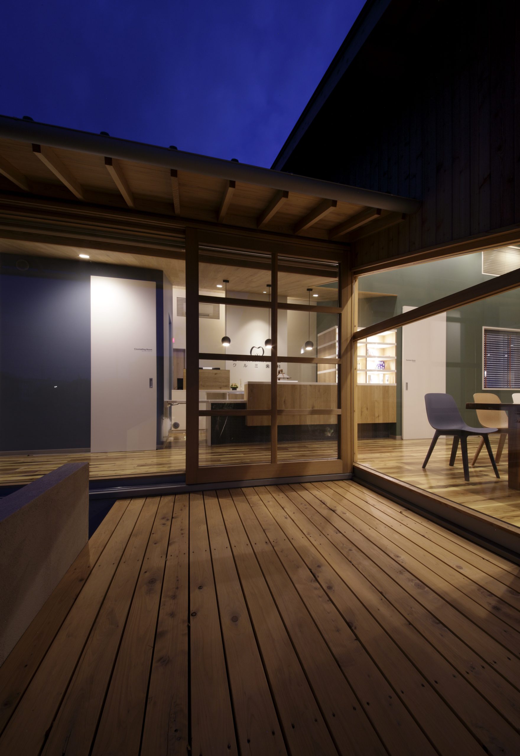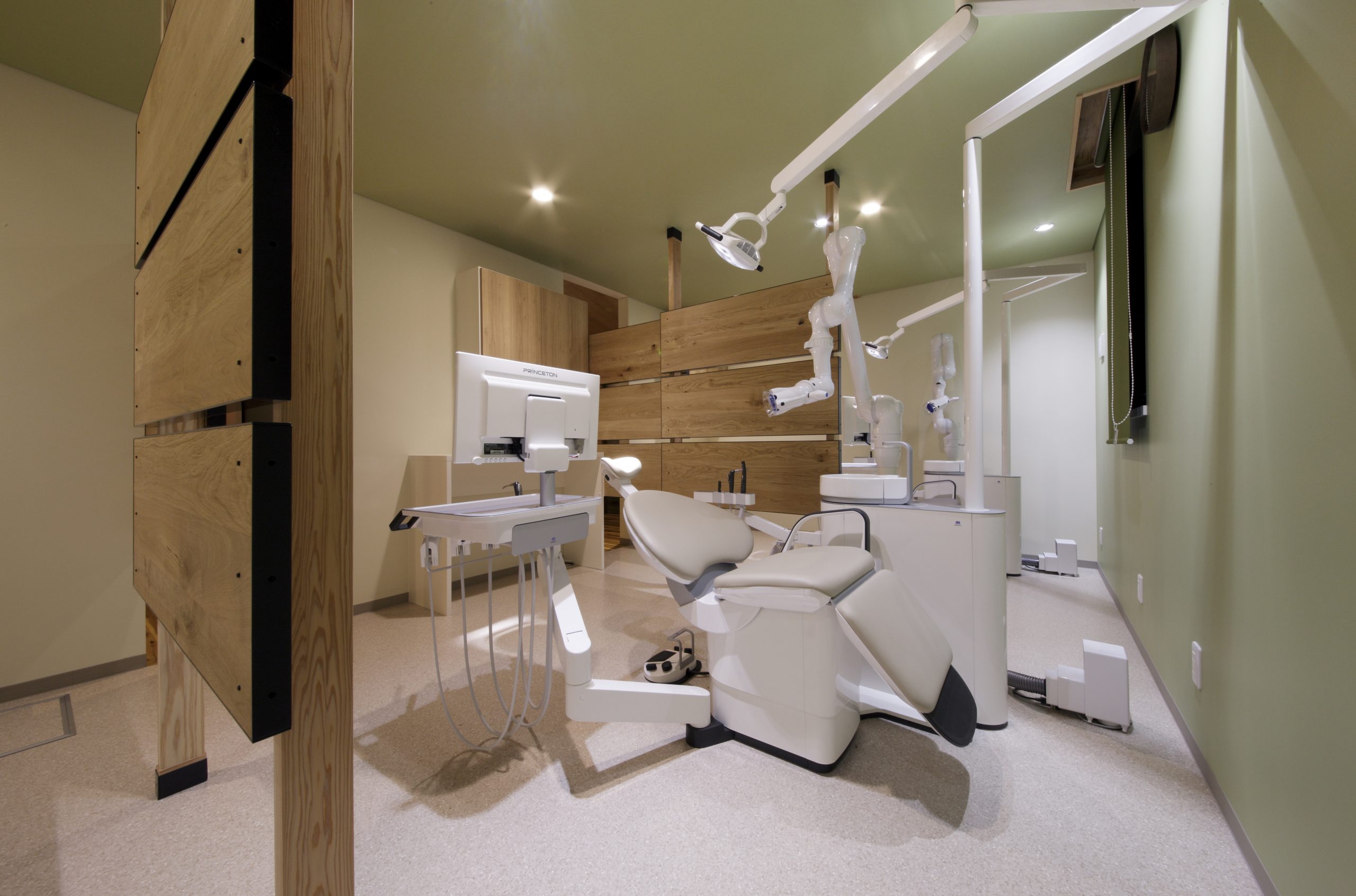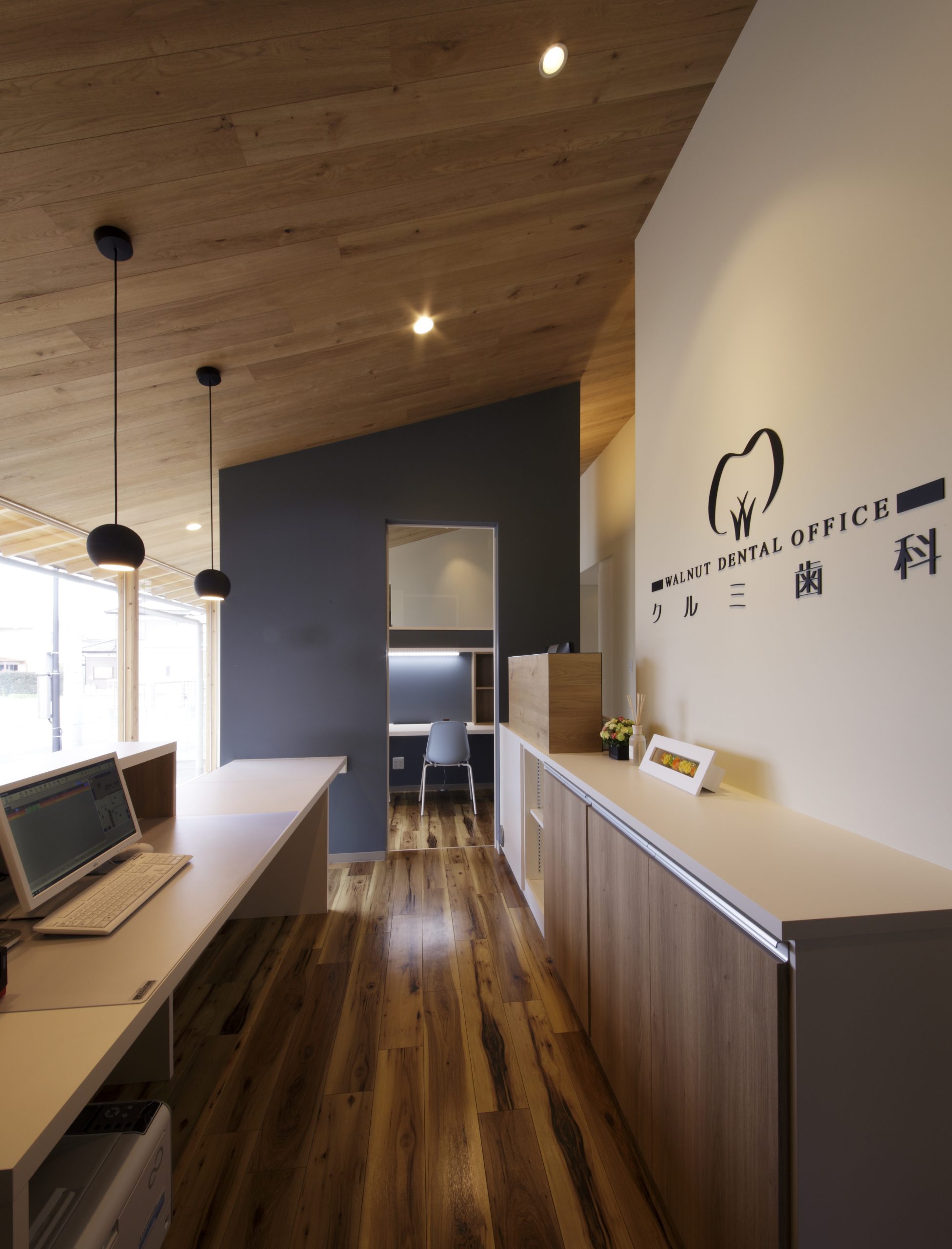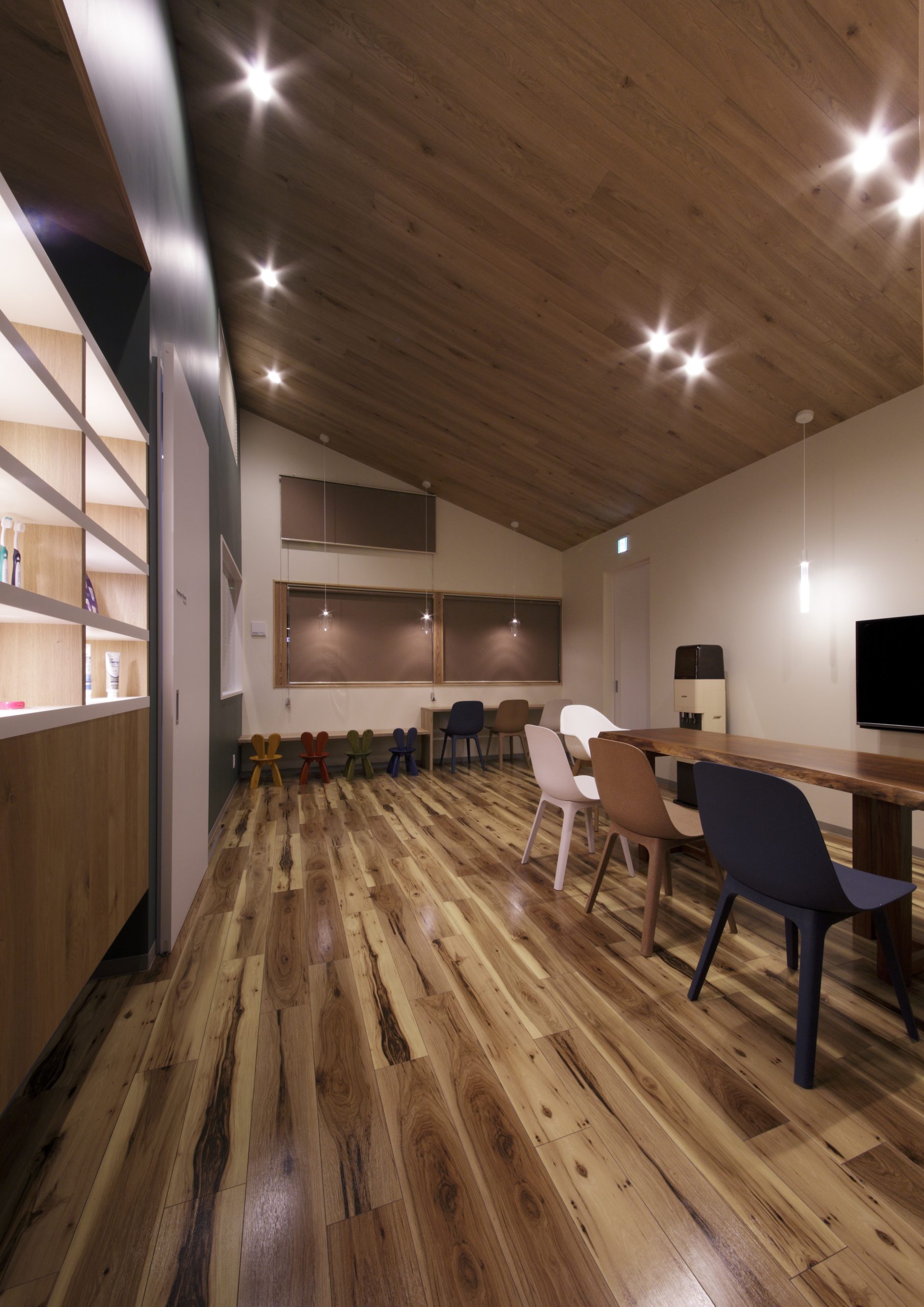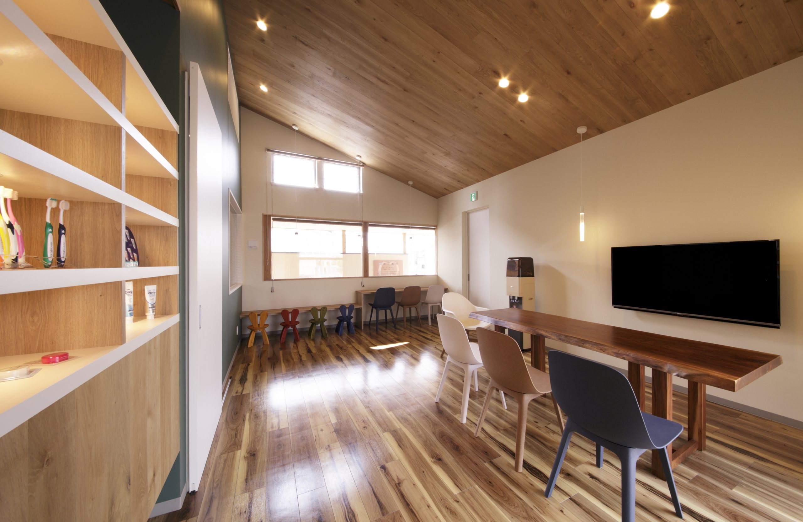 まるでカフェのようなかわいらしい外観。節のある素朴な木目と傾斜した天井は、患者様をリラックスさせます。