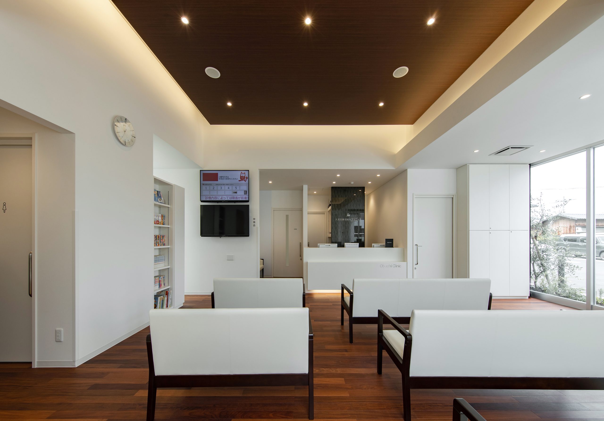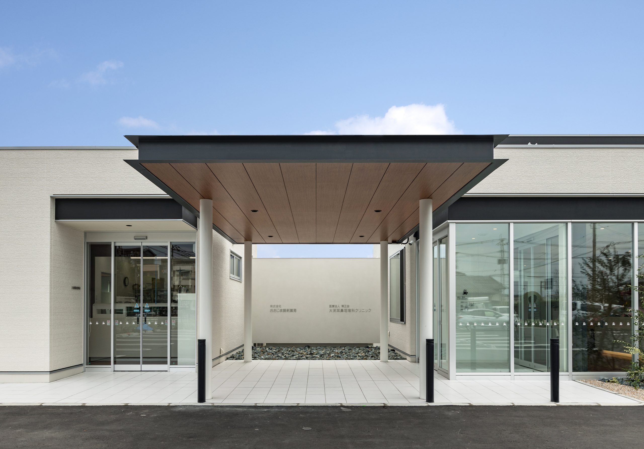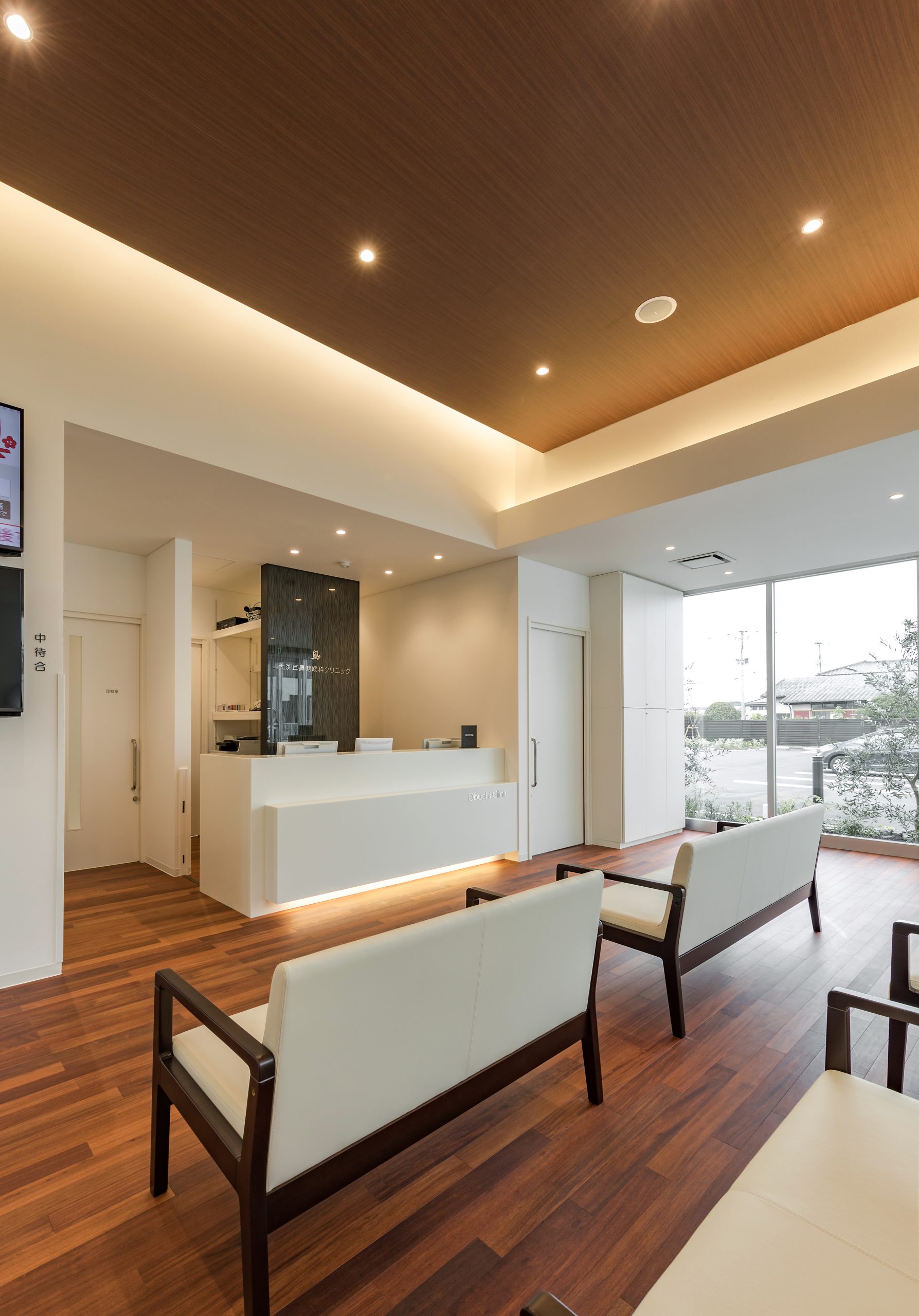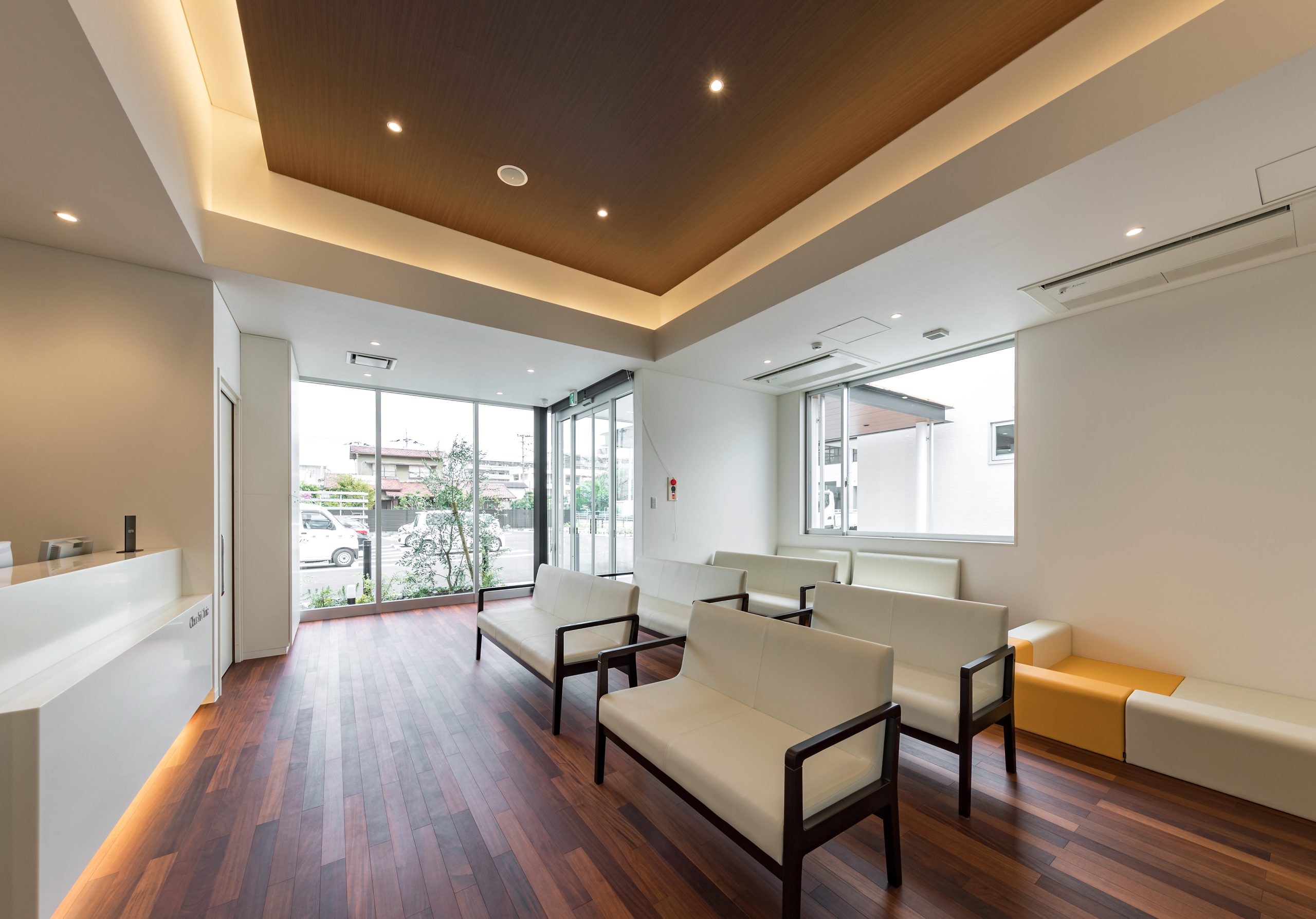 外観はアイボリーを基調に、随所へ黒のアクセントを取り入れることで、やわらかな印象の中にも上質な引き締めを感じるデザインです。 内装は白をベースに木目のブラウンを組み合わせ、患者様がリラックスできる落ち着いた空間を演出。 町並みに自然と溶け込み、地域の方々に親しみを持っていただけるクリニックとなっています。