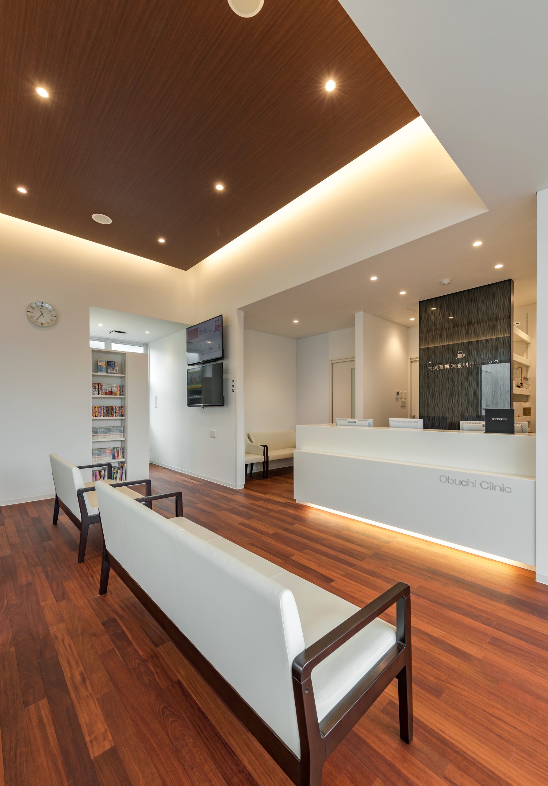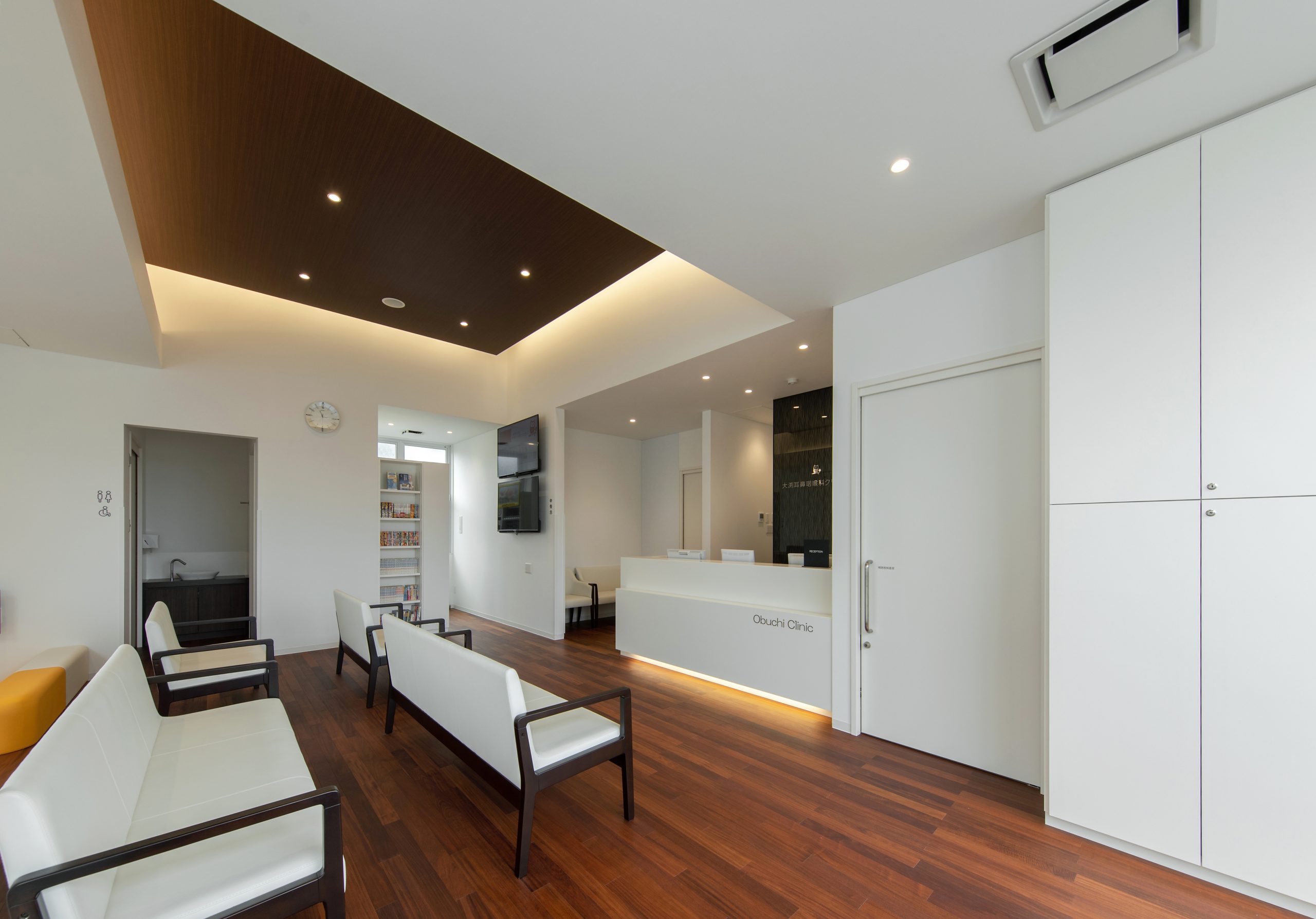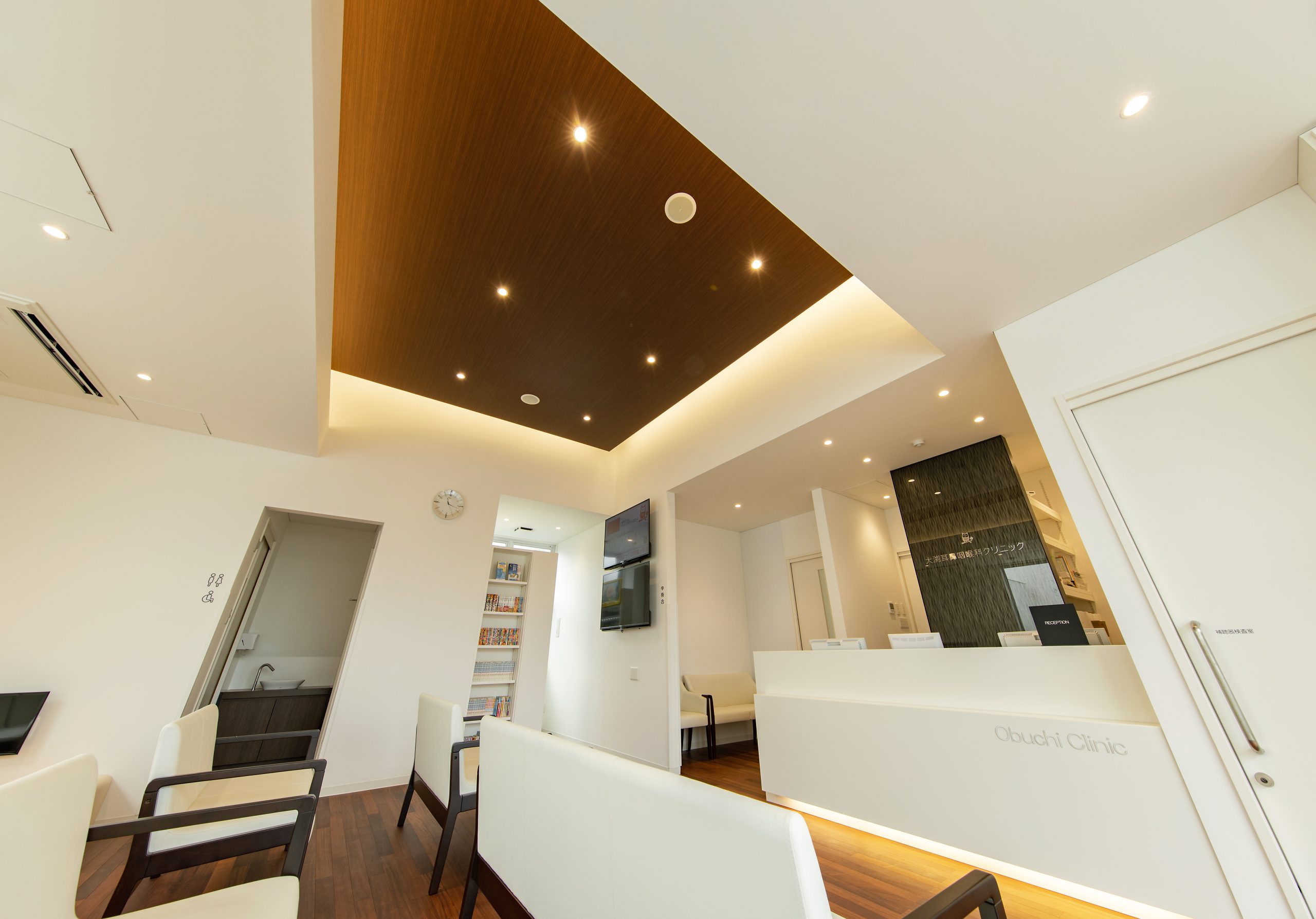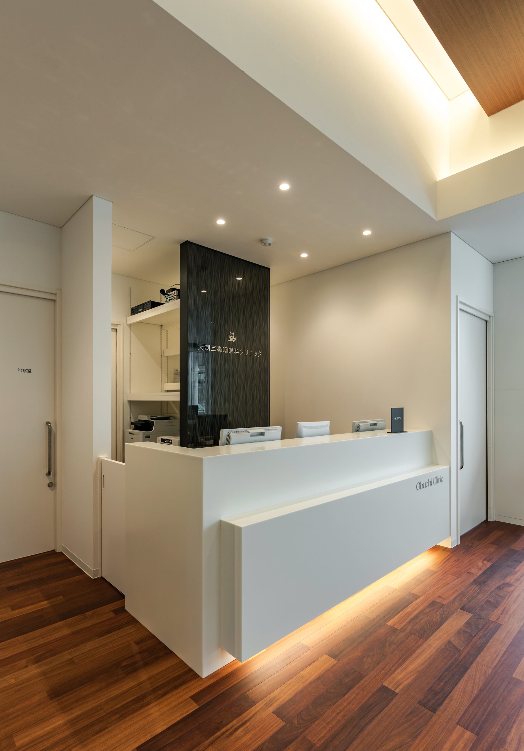 外観はアイボリーを基調に、随所へ黒のアクセントを取り入れることで、やわらかな印象の中にも上質な引き締めを感じるデザインです。 内装は白をベースに木目のブラウンを組み合わせ、患者様がリラックスできる落ち着いた空間を演出。 町並みに自然と溶け込み、地域の方々に親しみを持っていただけるクリニックとなっています。