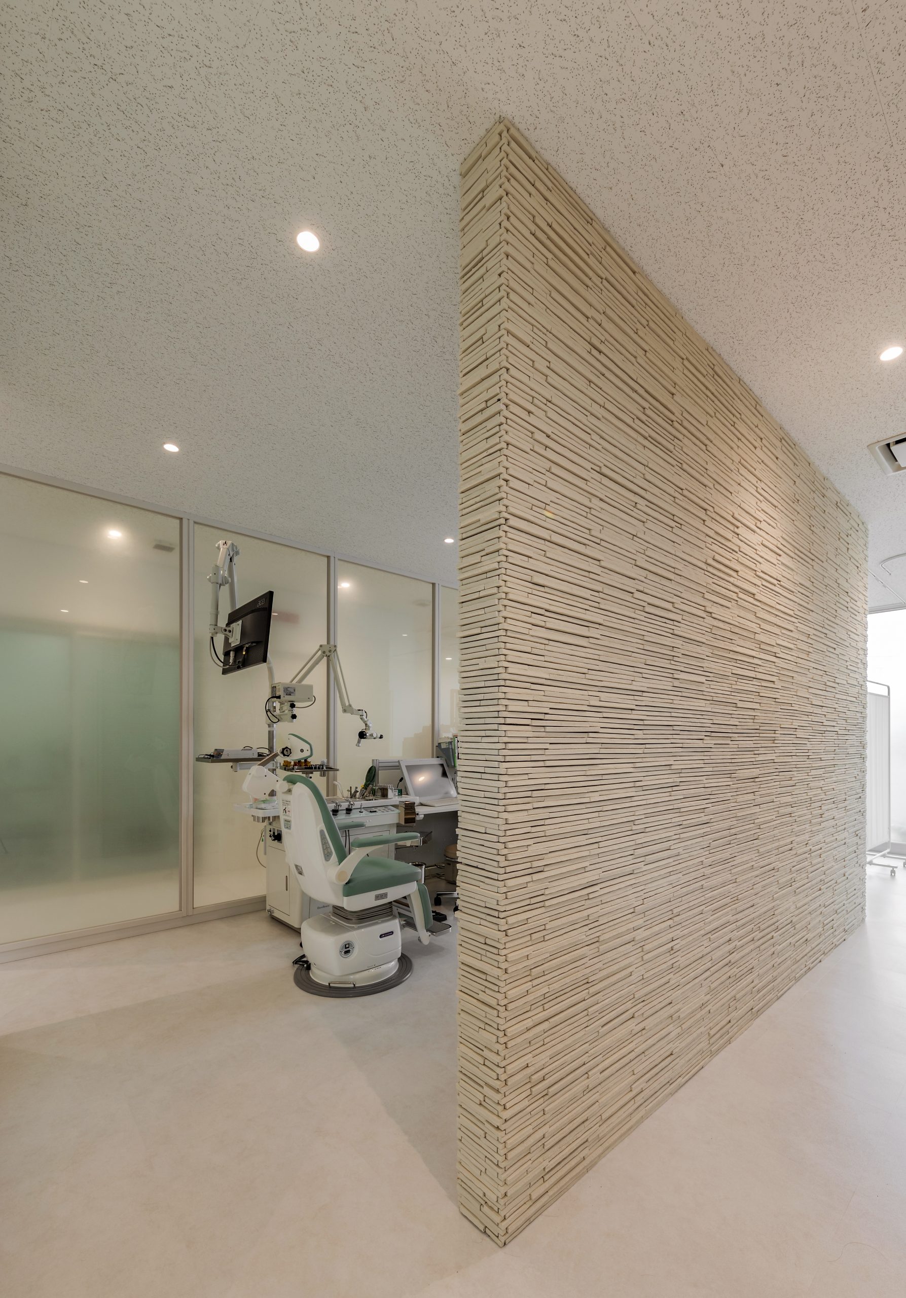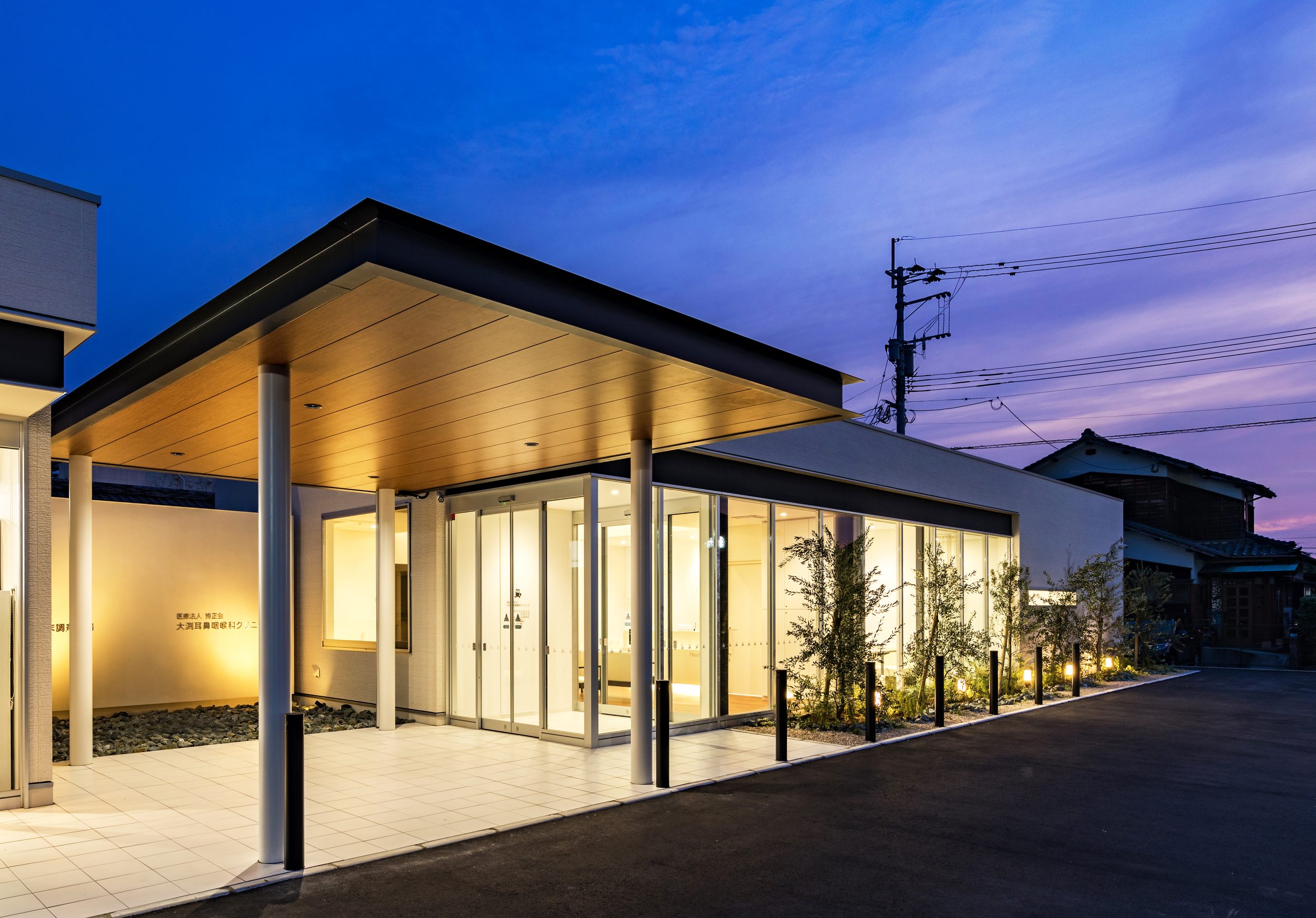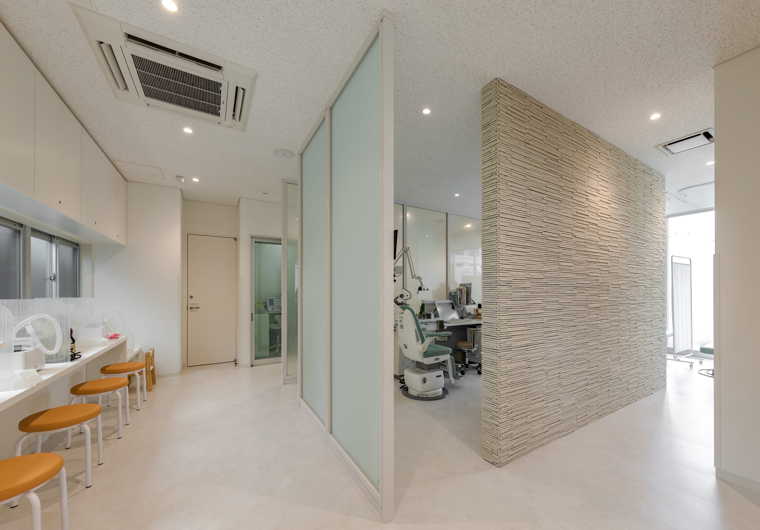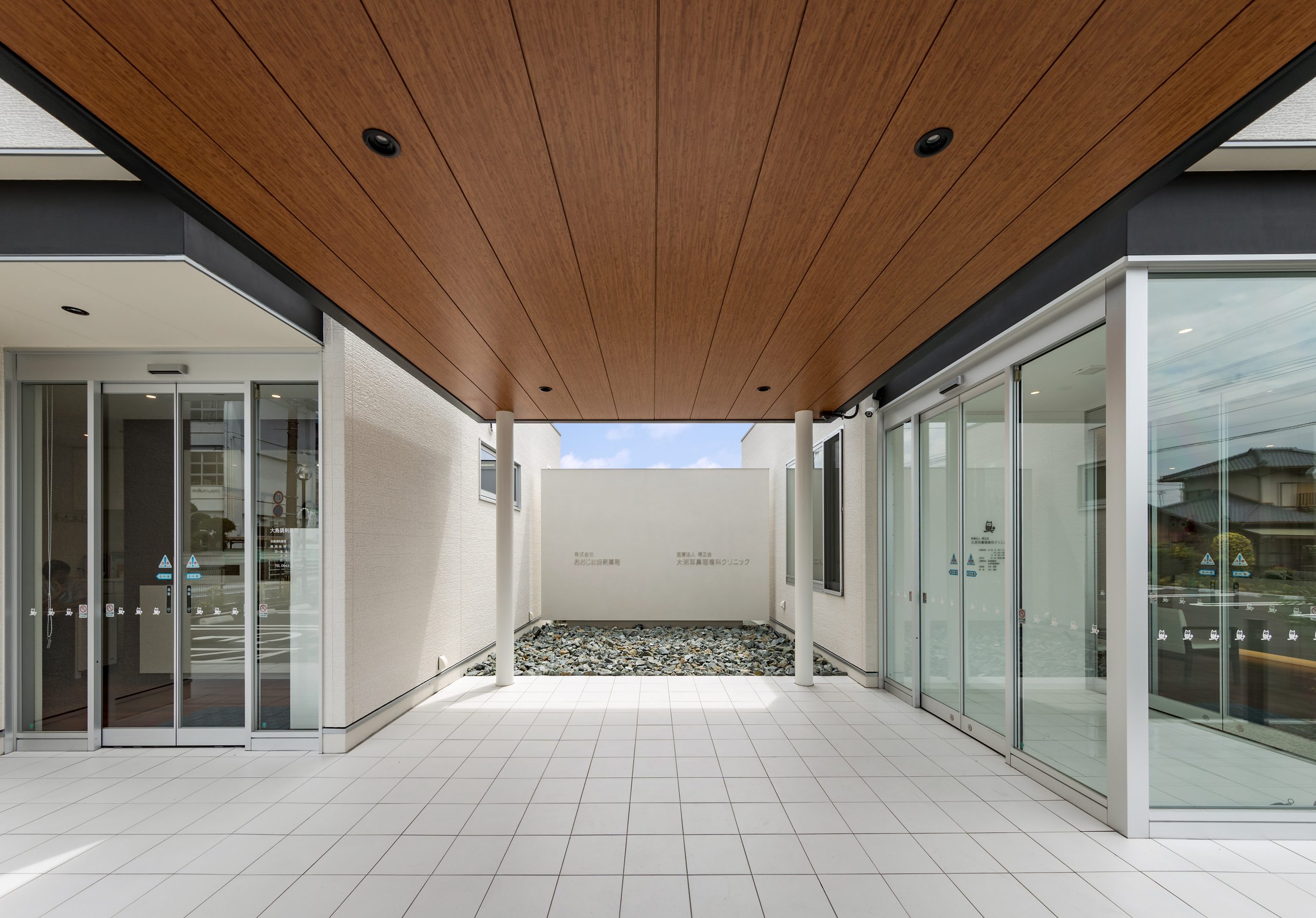 外観はアイボリーを基調に、随所へ黒のアクセントを取り入れることで、やわらかな印象の中にも上質な引き締めを感じるデザインです。 内装は白をベースに木目のブラウンを組み合わせ、患者様がリラックスできる落ち着いた空間を演出。 町並みに自然と溶け込み、地域の方々に親しみを持っていただけるクリニックとなっています。