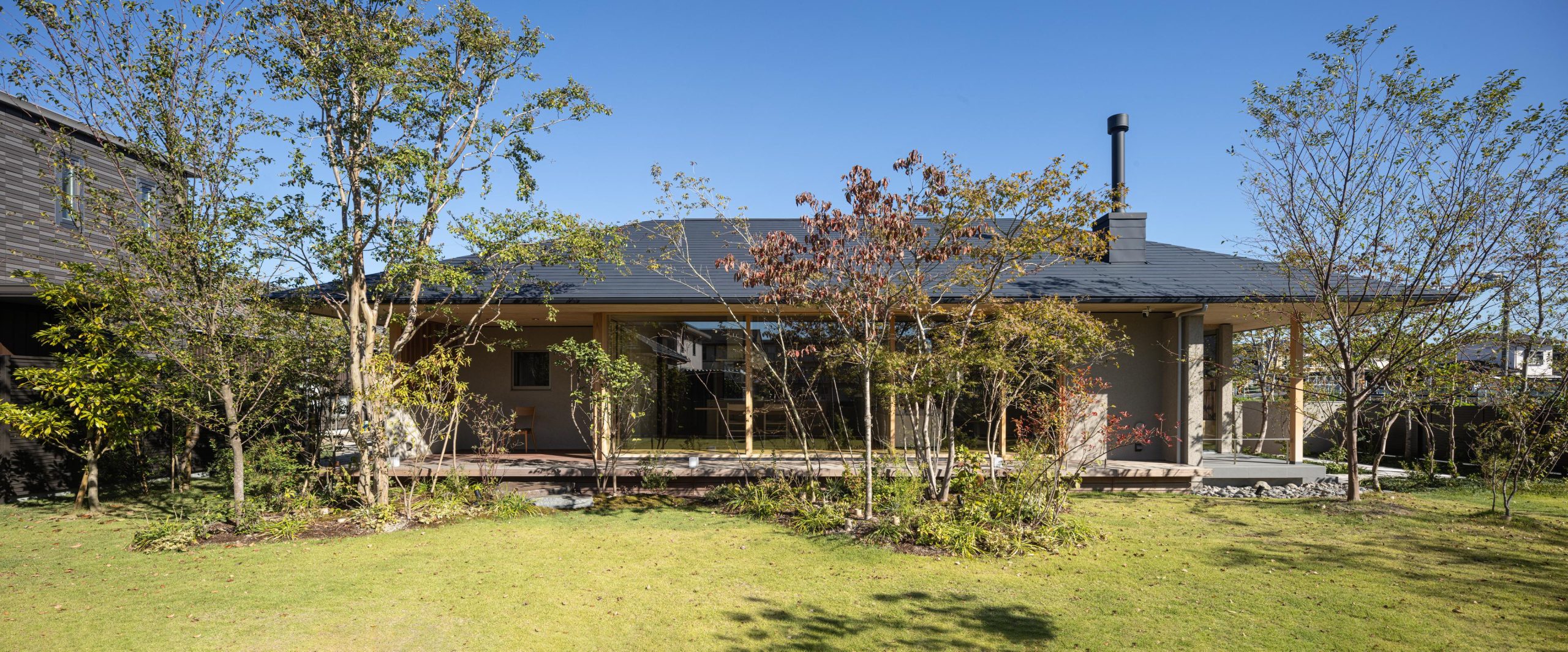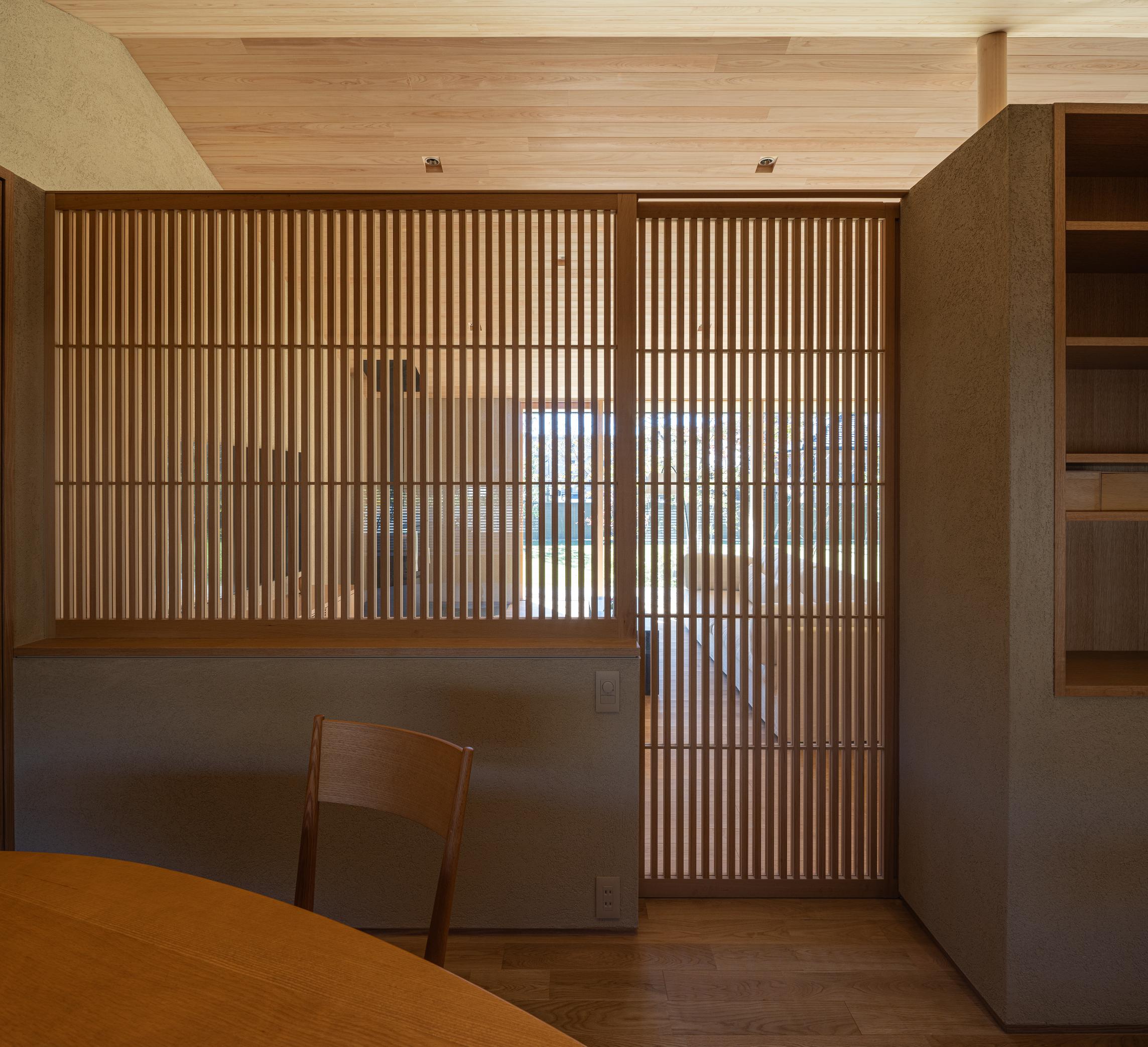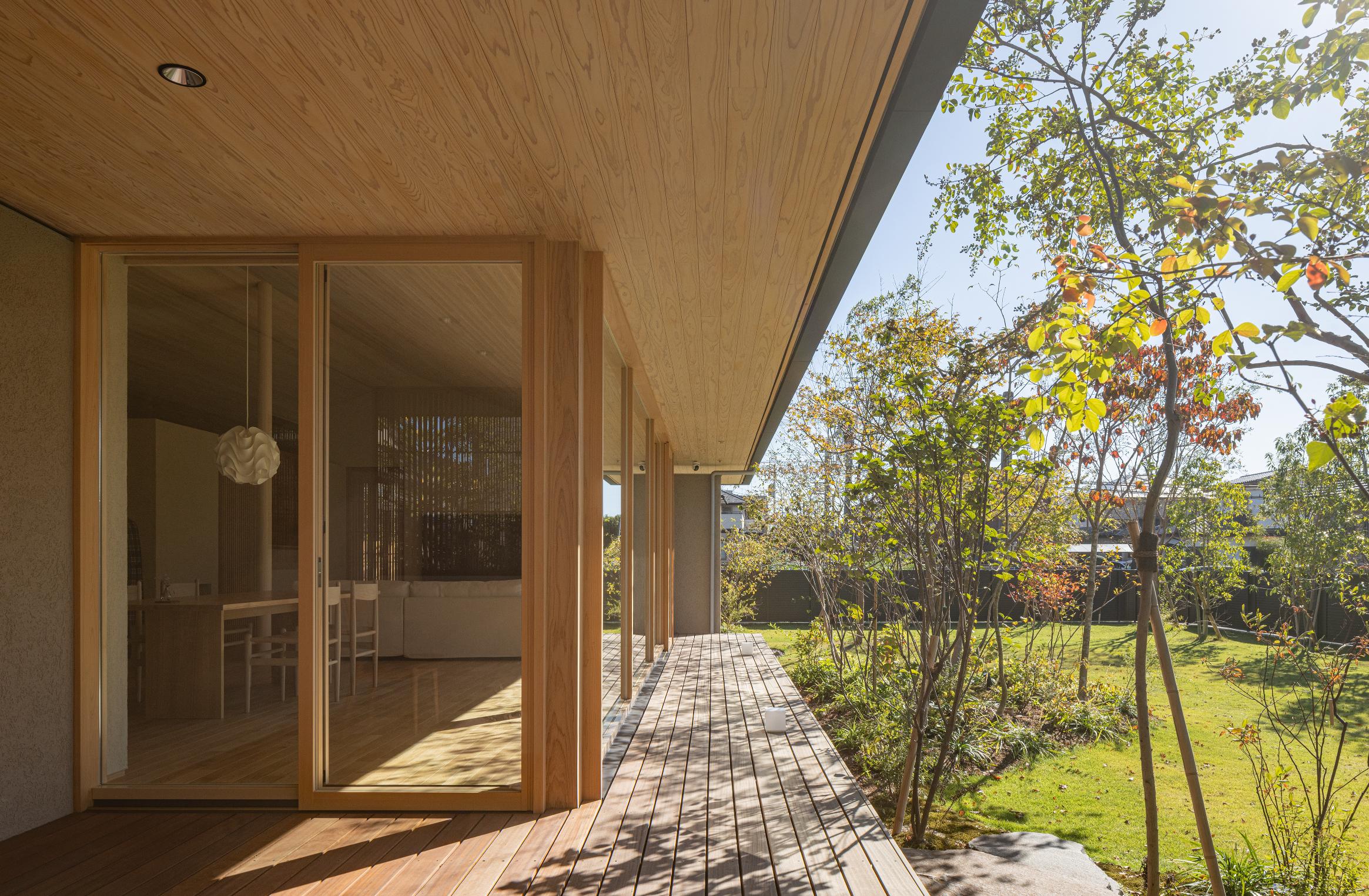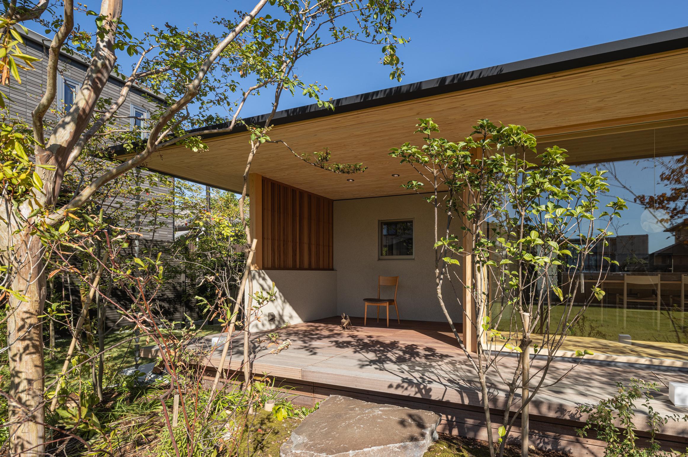 建物を北側に寄せたZ型プランとし、南側に主庭を配置。深い軒の寄棟屋根と木質を基調とした外観は、木立の中に佇む、どこか懐かしくおおらかな印象を与えます。 木々の間を抜けるアプローチの先に玄関を設け、LDKは屋根勾配を生かした伸びやかな空間に。南側いっぱいに開いた開口部と深い軒、デッキ、植栽が内外を緩やかにつなぎ、自然の移ろいを身近に感じられる、落ち着きのある住まいとなりました。