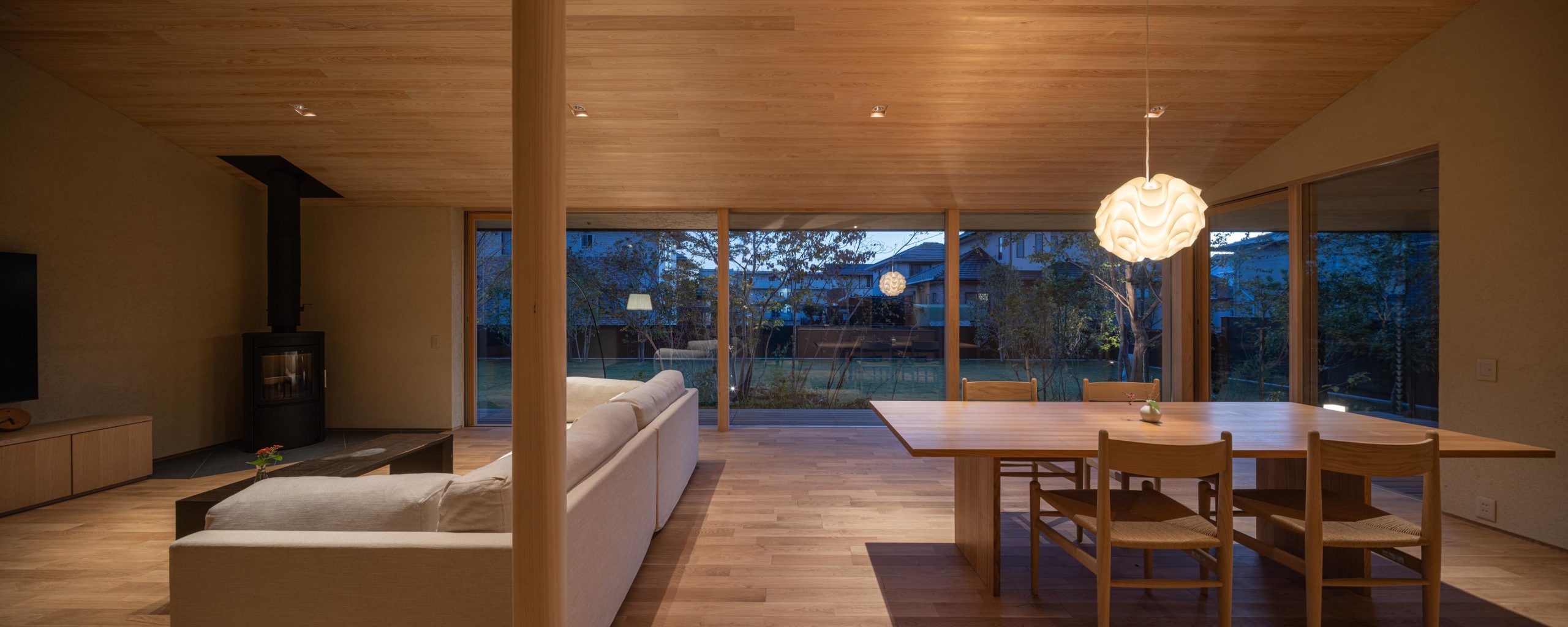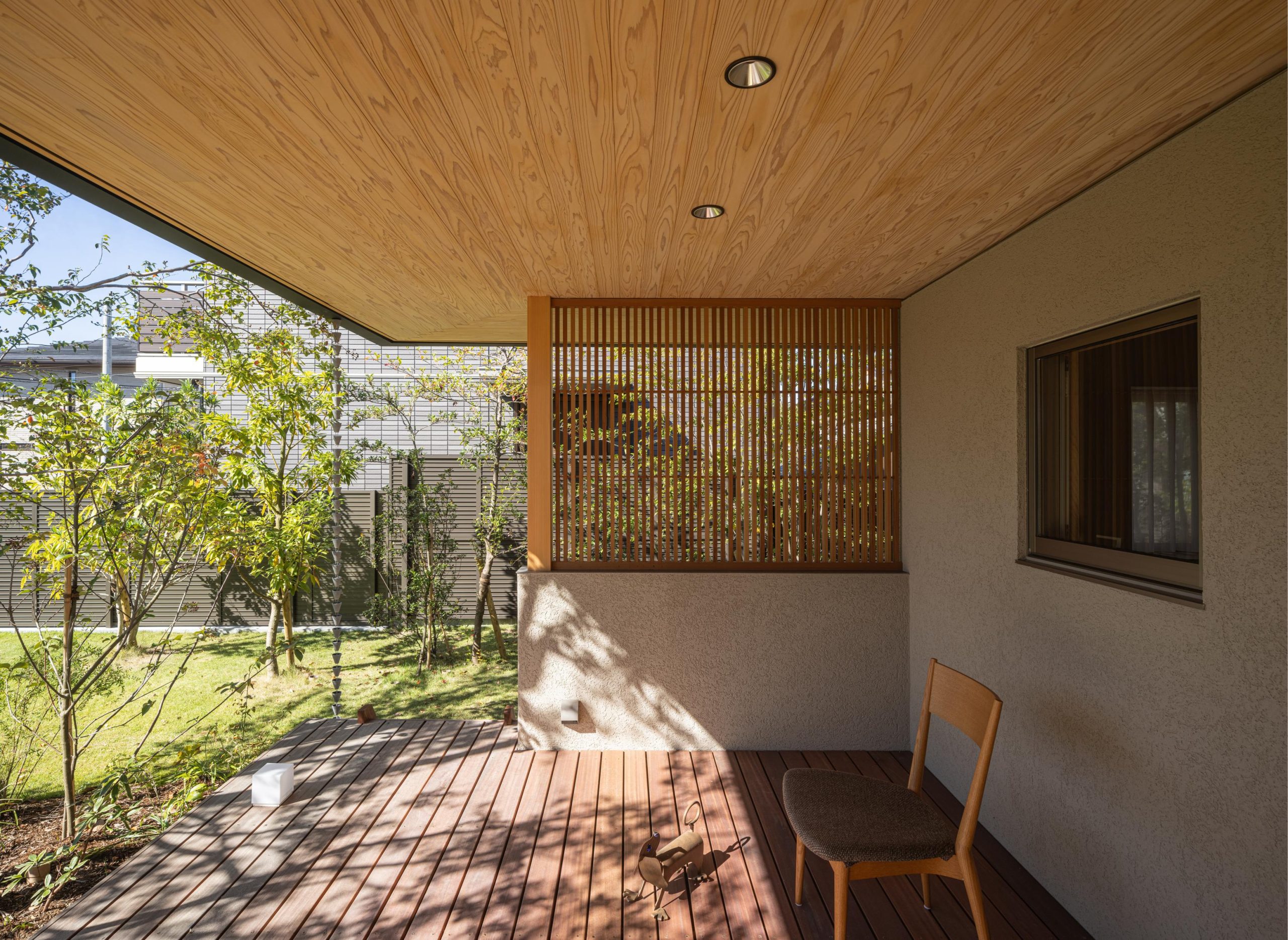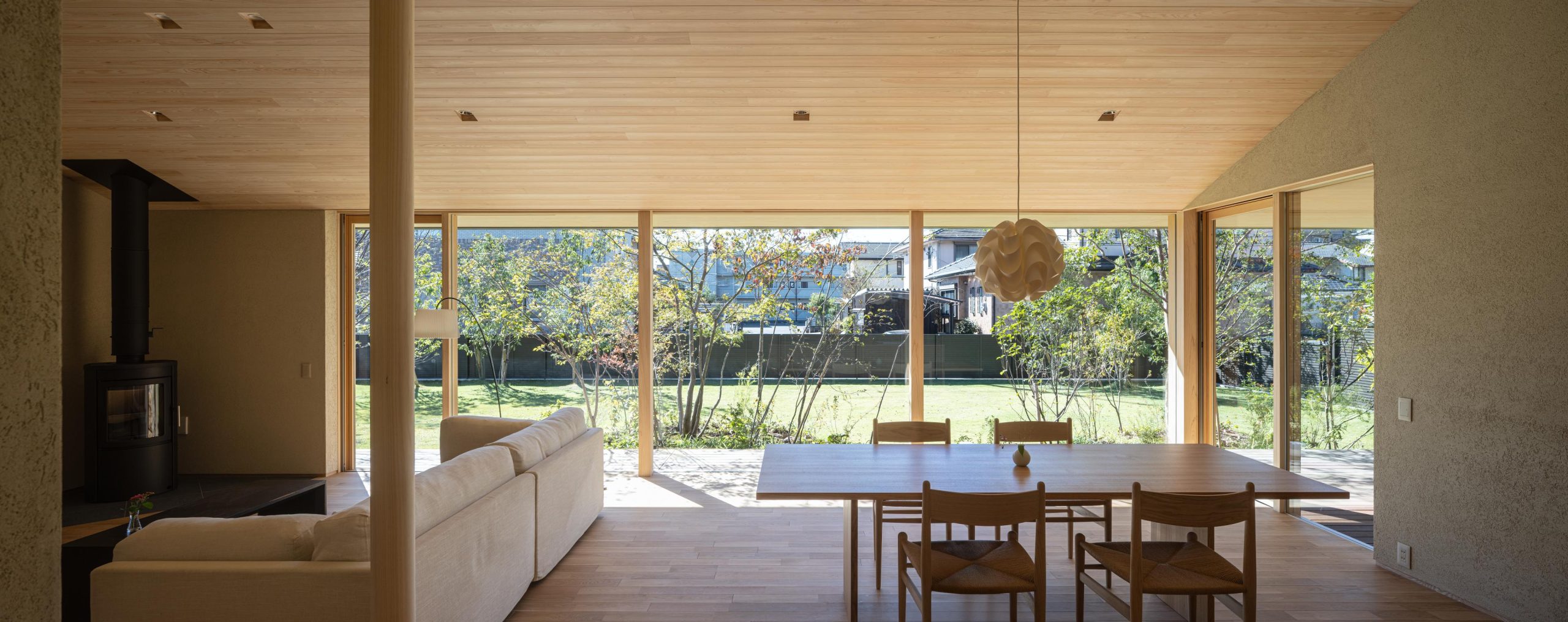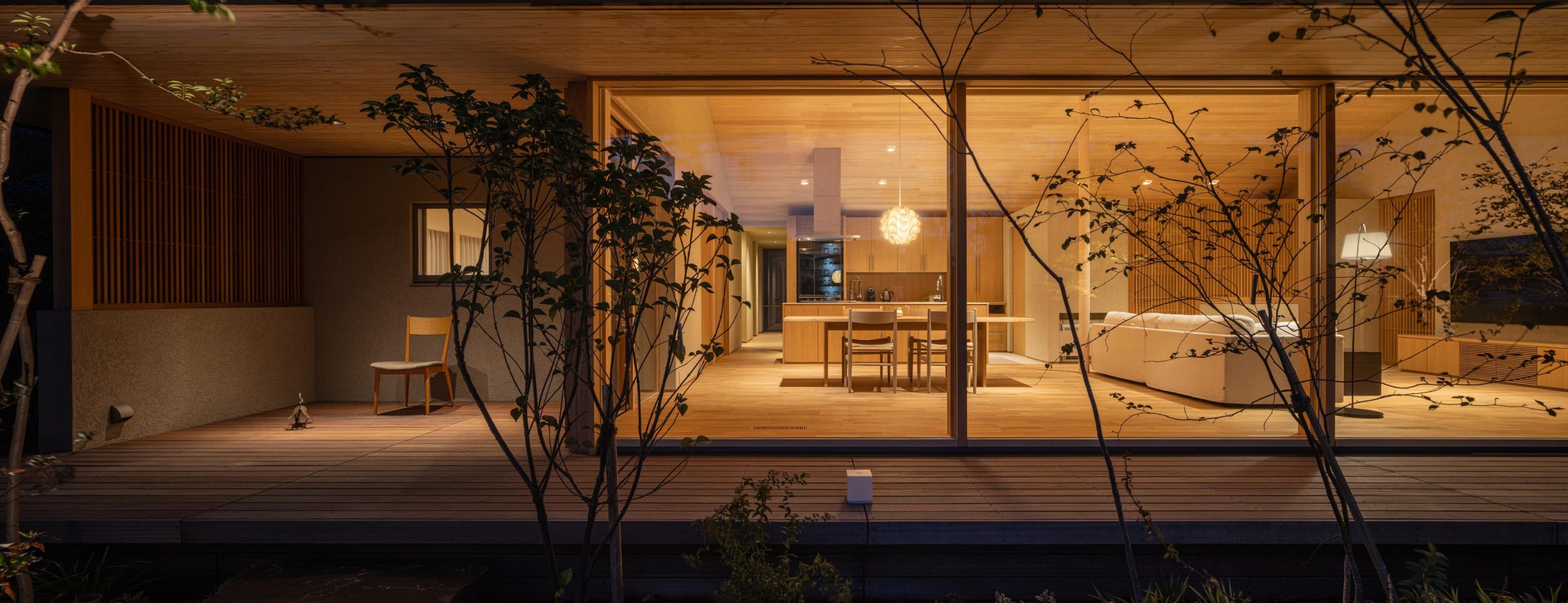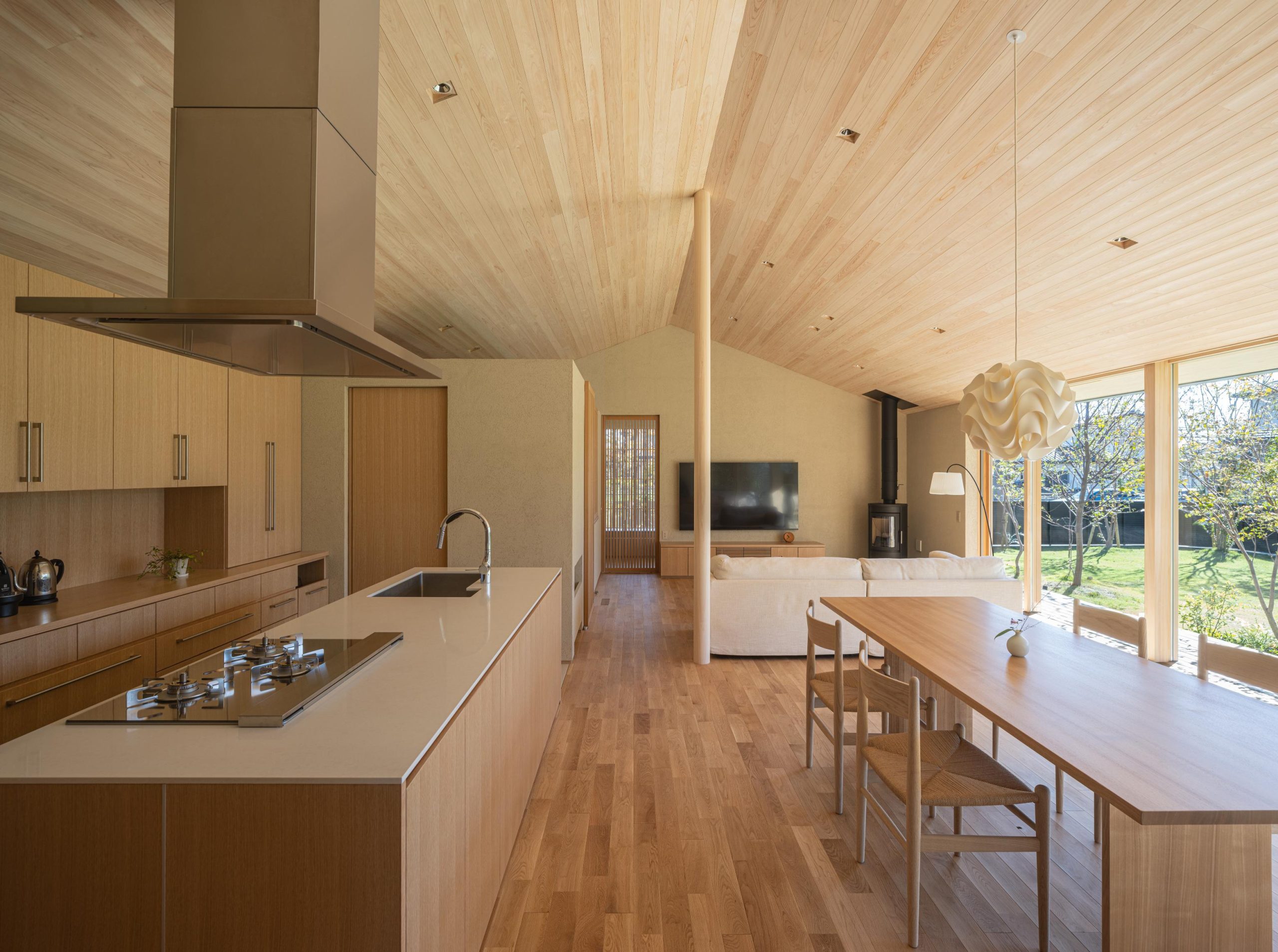 建物を北側に寄せたZ型プランとし、南側に主庭を配置。深い軒の寄棟屋根と木質を基調とした外観は、木立の中に佇む、どこか懐かしくおおらかな印象を与えます。 木々の間を抜けるアプローチの先に玄関を設け、LDKは屋根勾配を生かした伸びやかな空間に。南側いっぱいに開いた開口部と深い軒、デッキ、植栽が内外を緩やかにつなぎ、自然の移ろいを身近に感じられる、落ち着きのある住まいとなりました。