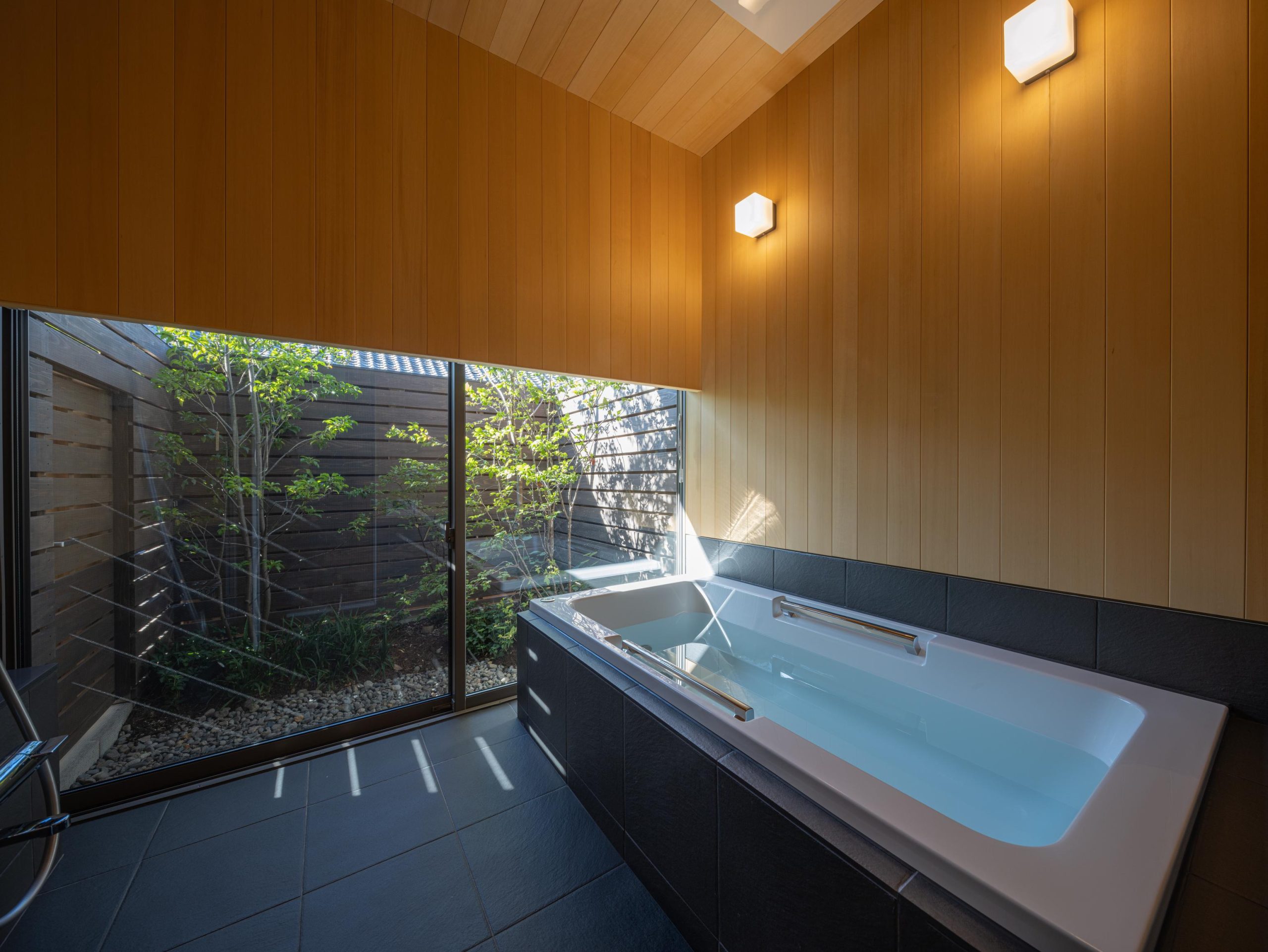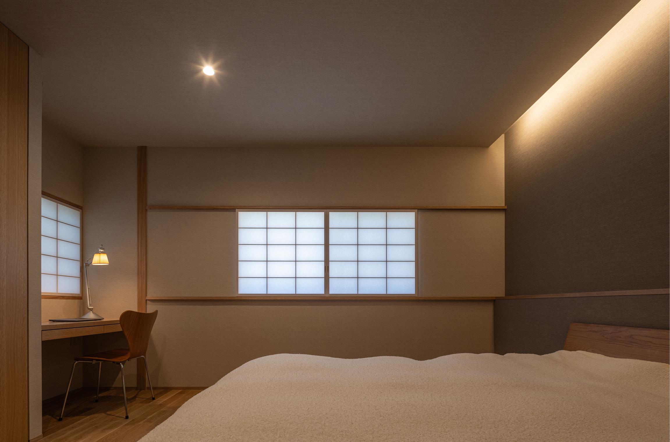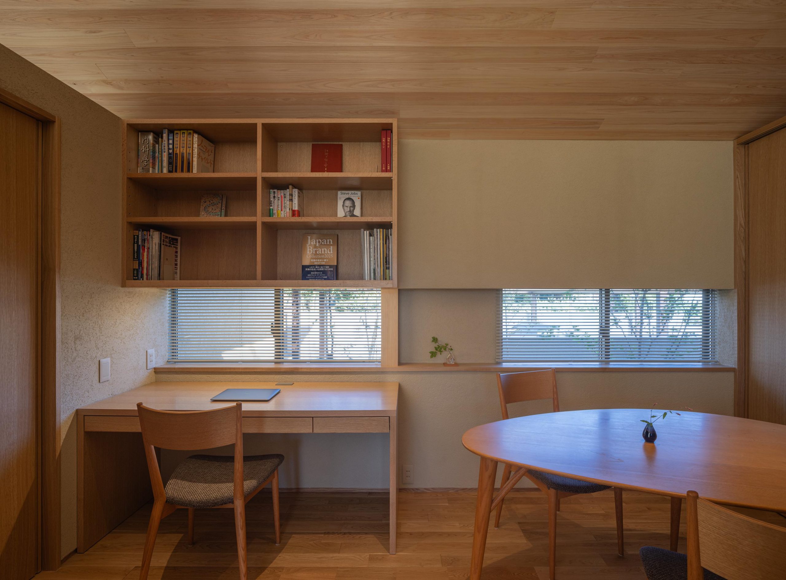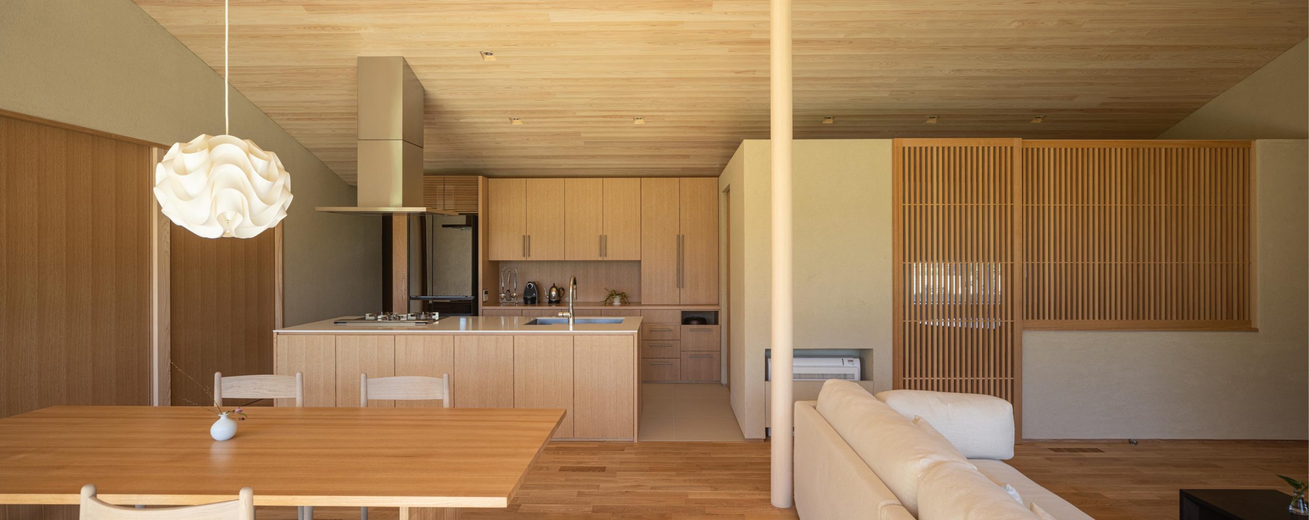 建物を北側に寄せたZ型プランとし、南側に主庭を配置。深い軒の寄棟屋根と木質を基調とした外観は、木立の中に佇む、どこか懐かしくおおらかな印象を与えます。 木々の間を抜けるアプローチの先に玄関を設け、LDKは屋根勾配を生かした伸びやかな空間に。南側いっぱいに開いた開口部と深い軒、デッキ、植栽が内外を緩やかにつなぎ、自然の移ろいを身近に感じられる、落ち着きのある住まいとなりました。