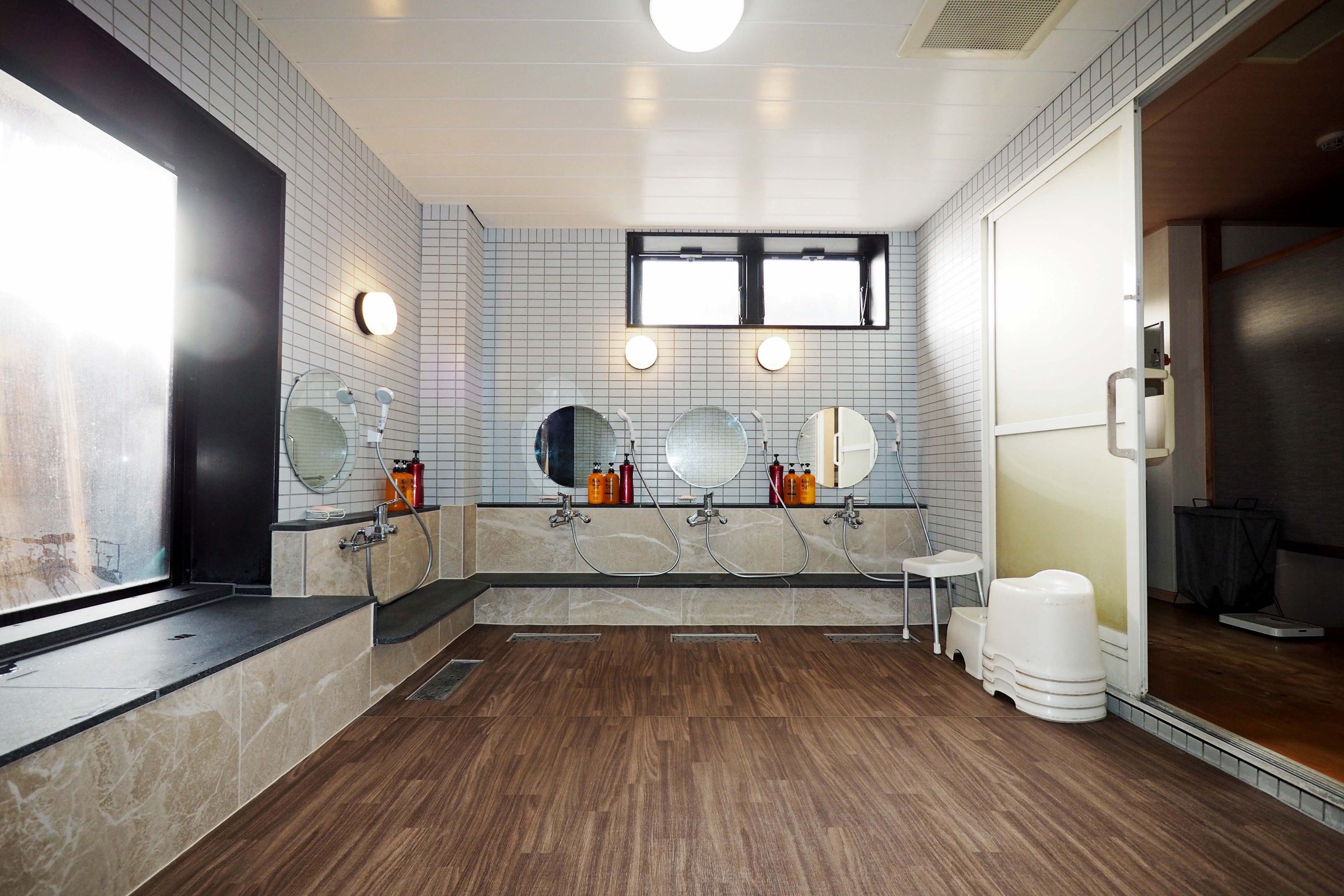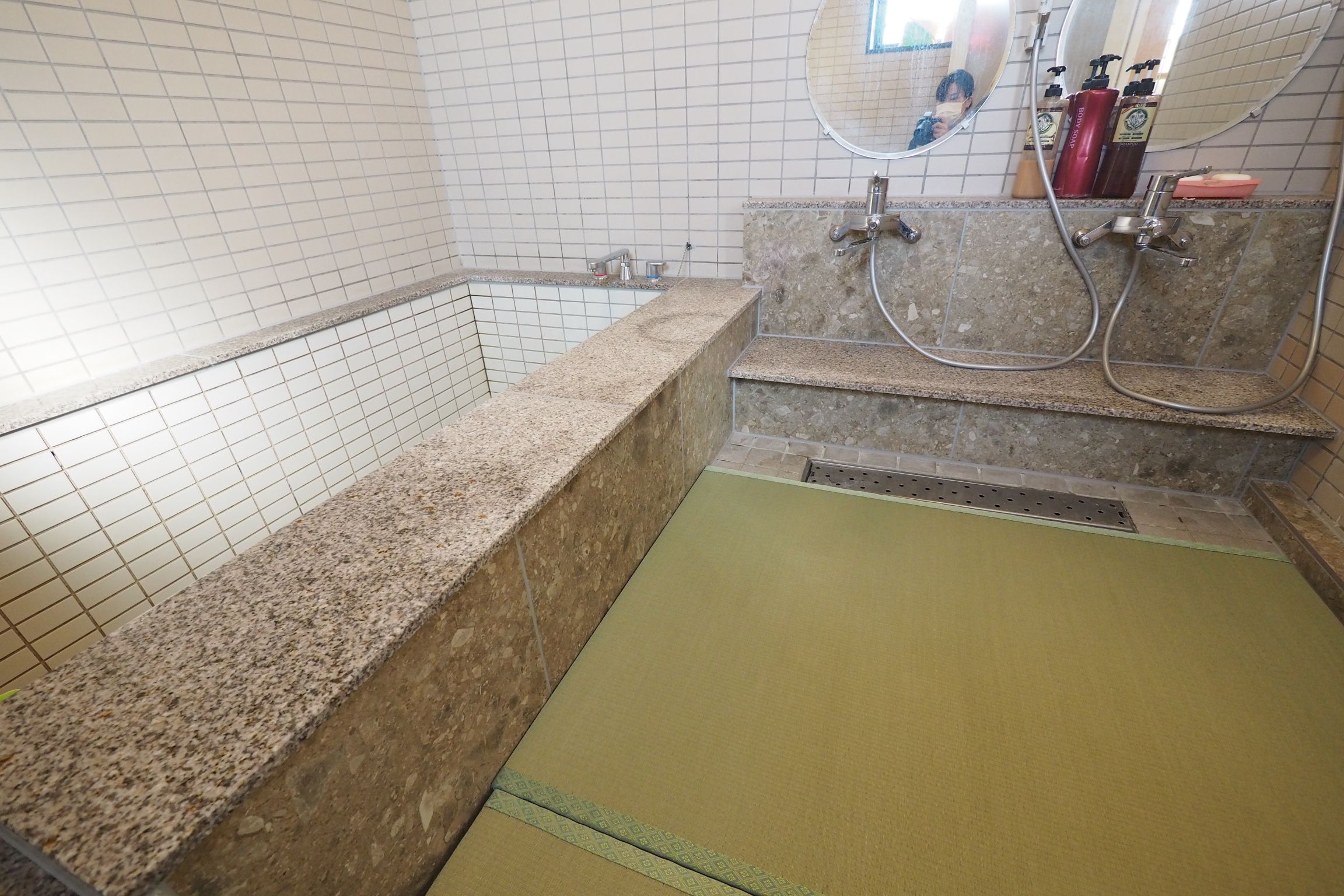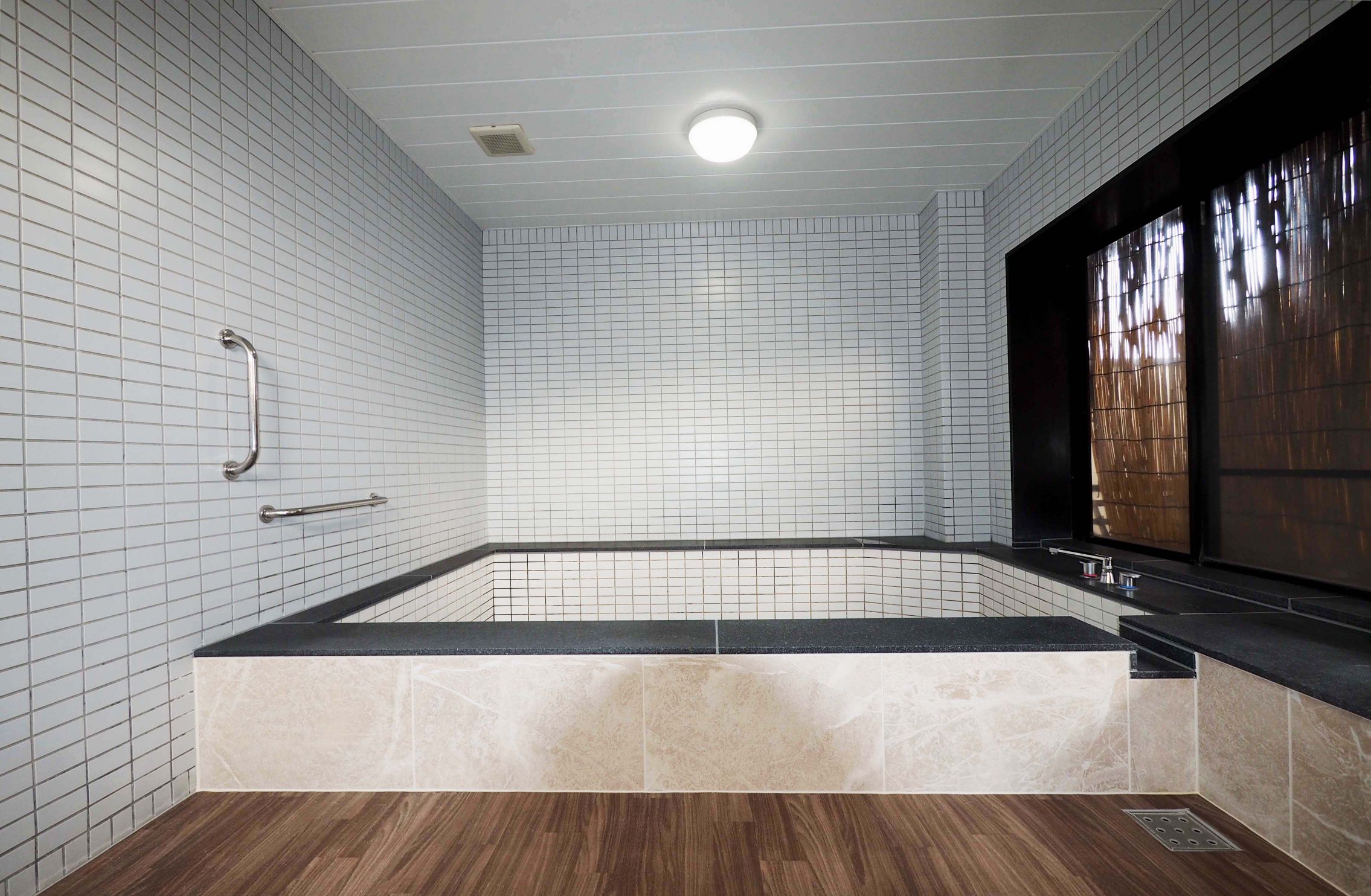 久留米市にある『旅館 錦水』の改修工事。男湯・女湯共にタイル、床の貼替、シャワー水栓の取替等を行いました。タイルと床のコントラストですっきりとした印象に、明るい浴場へと変わりました。