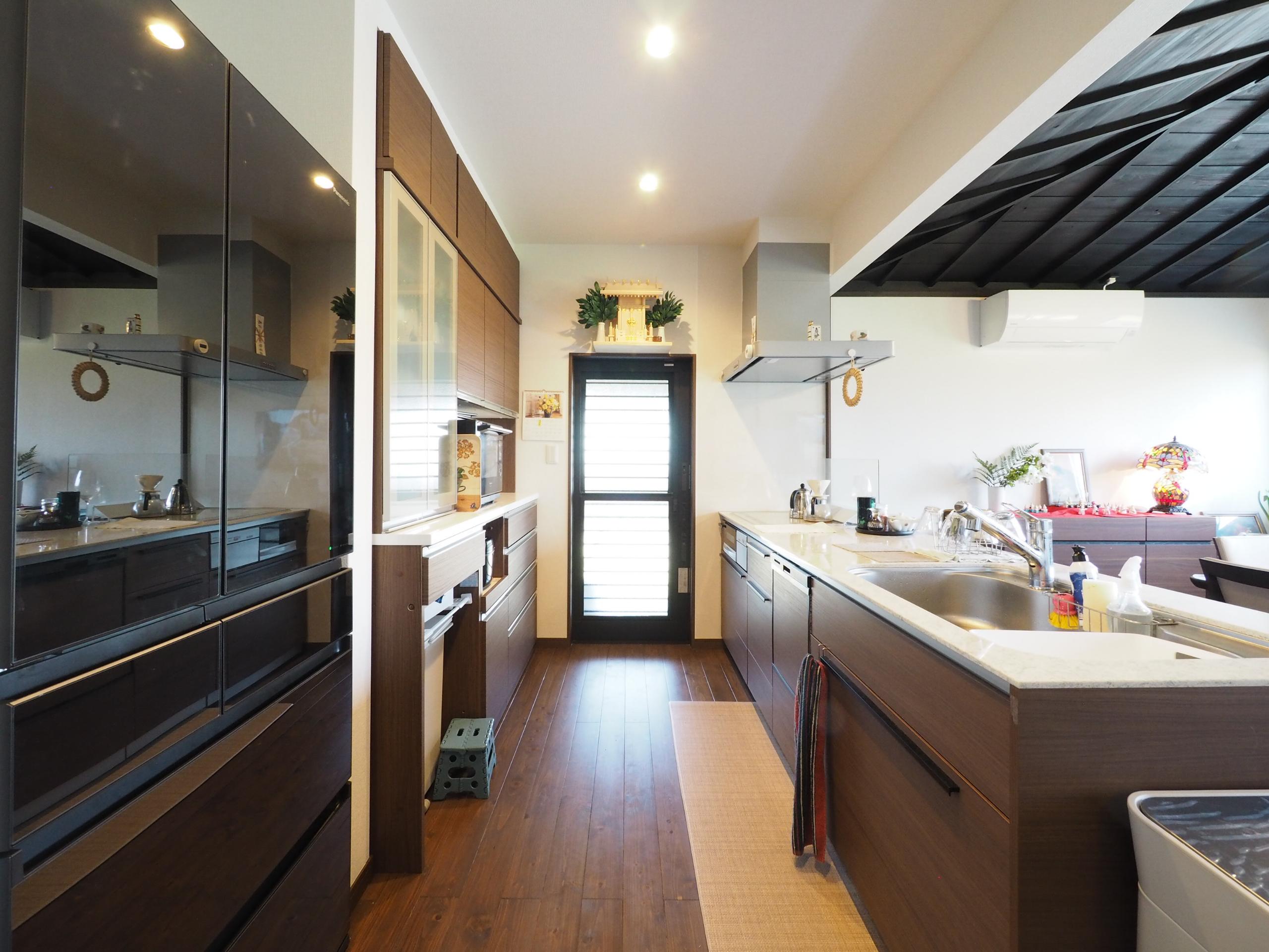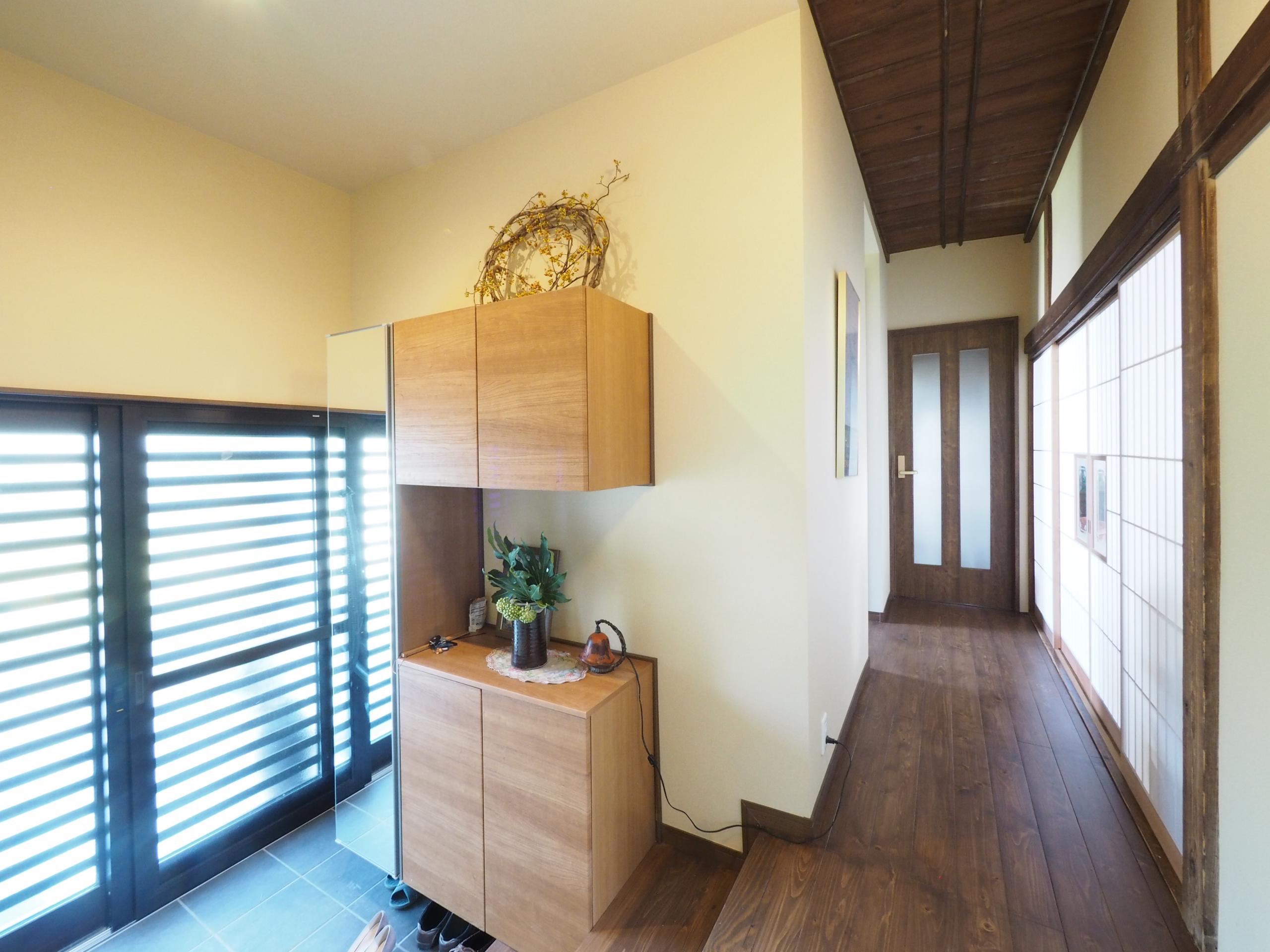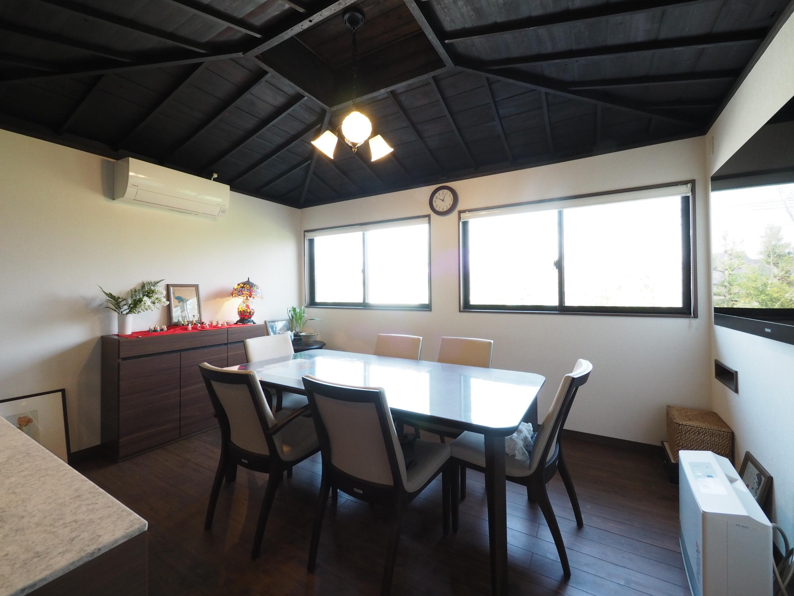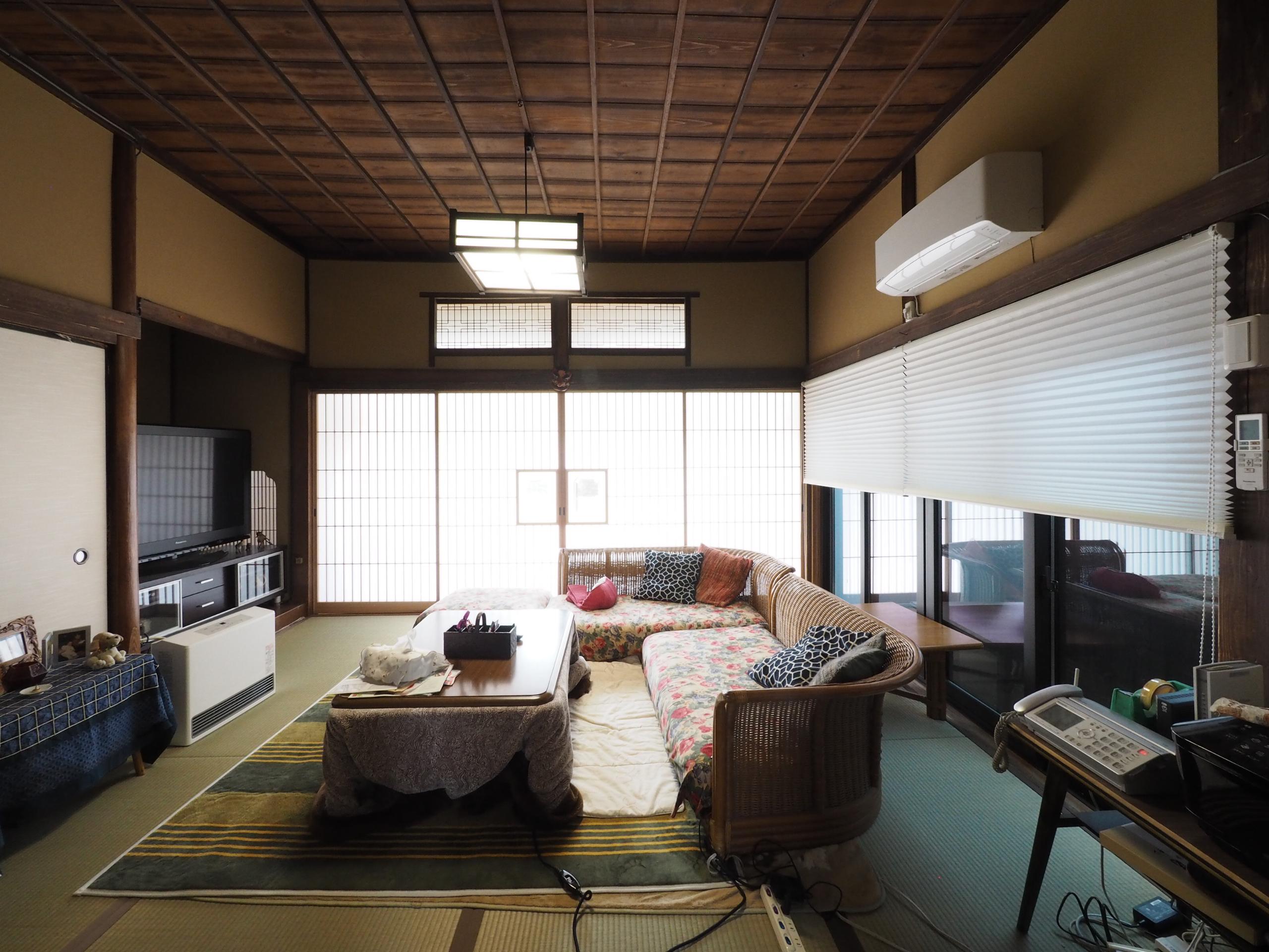 築約90年、御祖父様が長年お住まいになられた家をリノベーション。 古き良きモノを受け継ぎ、遺したいという想いをカタチに…LDKの唐傘天井も既存のまま形を変えず、塗装しました。 外観は和と洋が融合した建物でお庭を散歩すれば、木々や草花に囲まれ空気が澄んでいて気持ちが安らぐようです。お手製の表情豊かなお雛様も居心地が良さそうです。