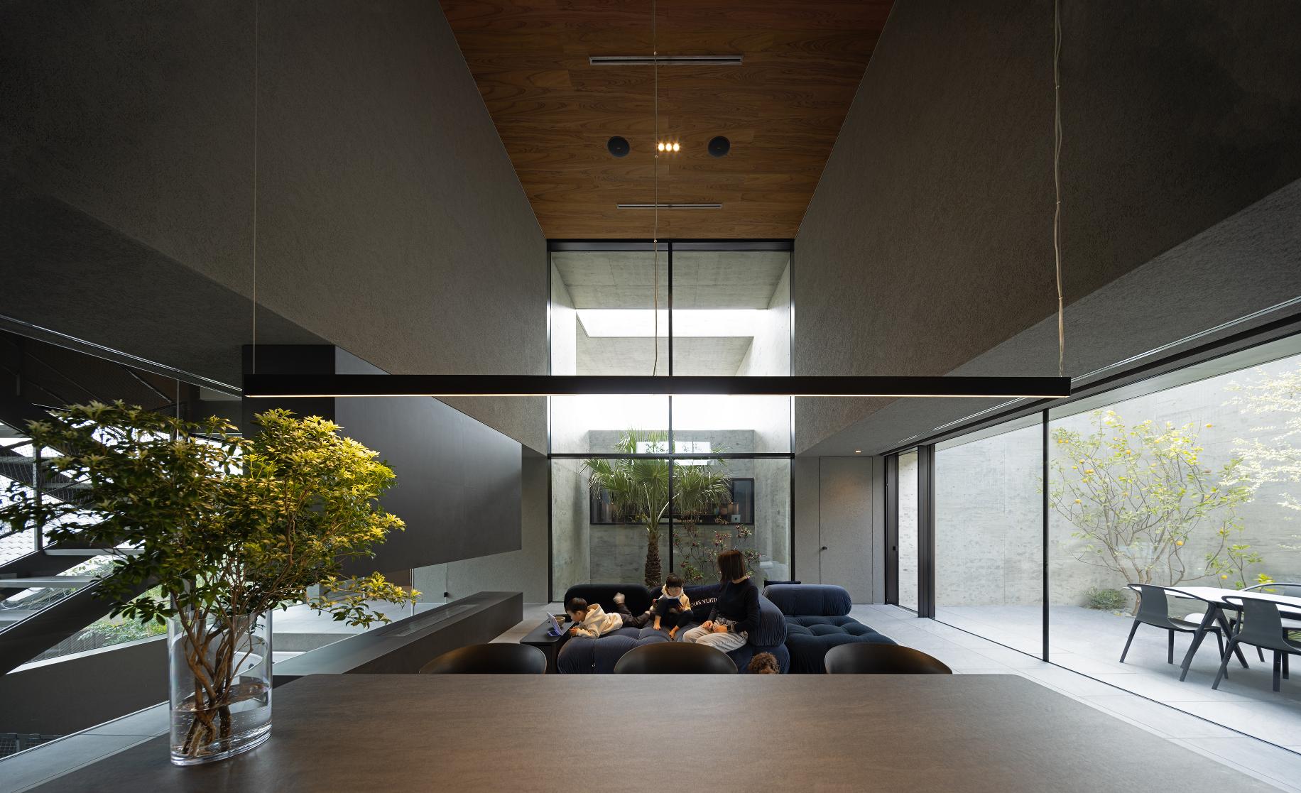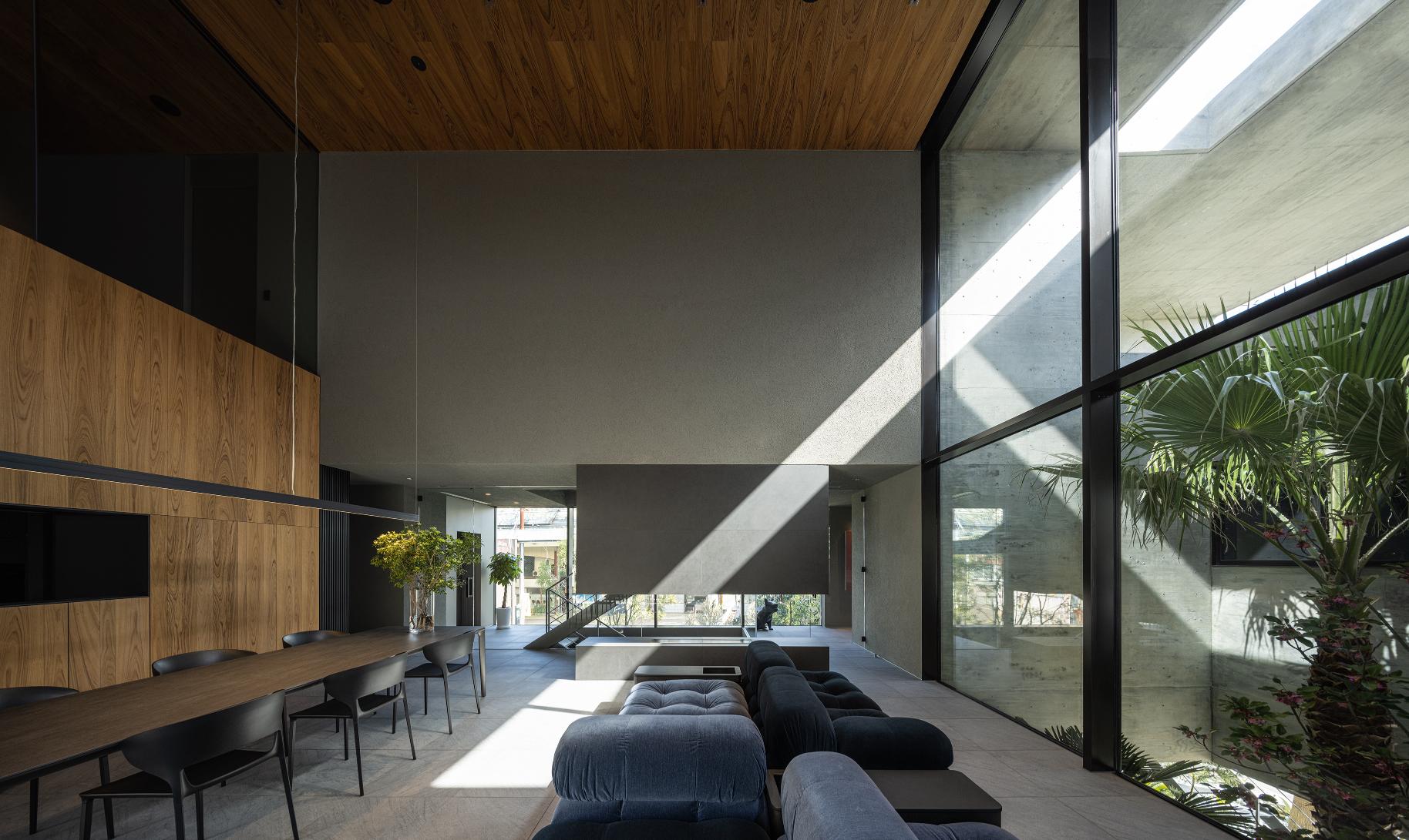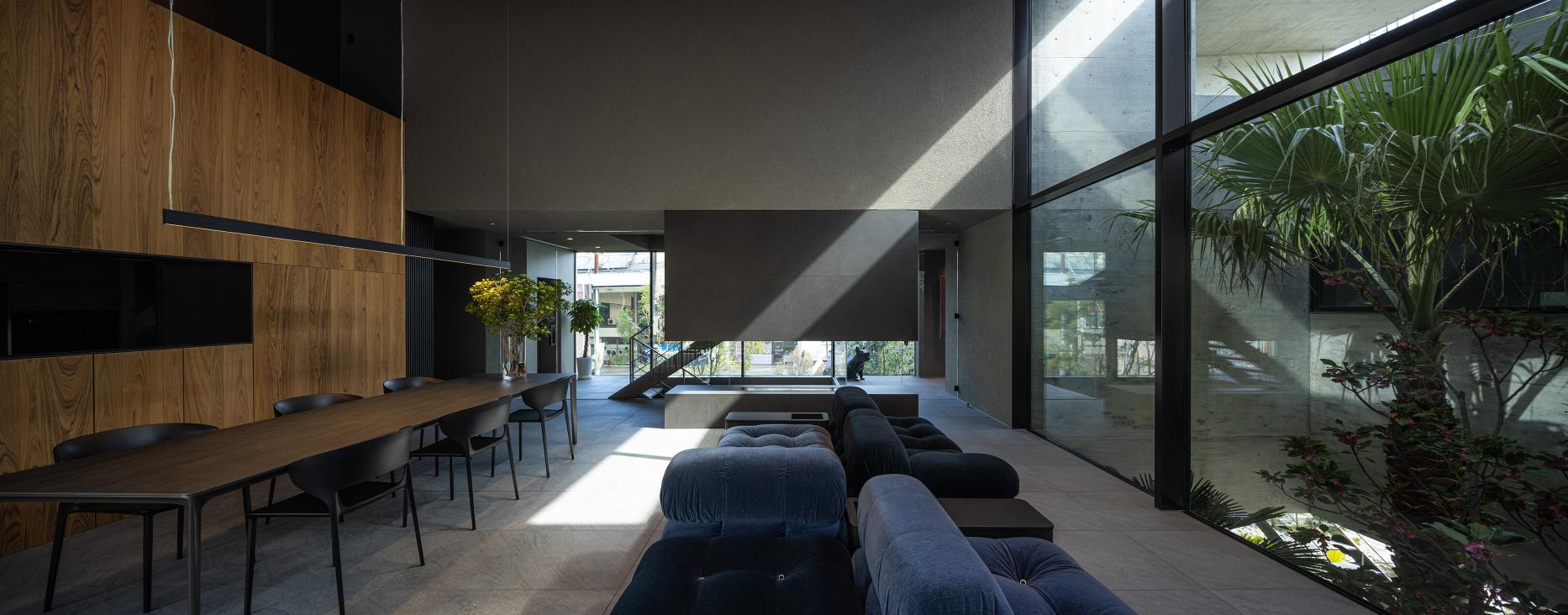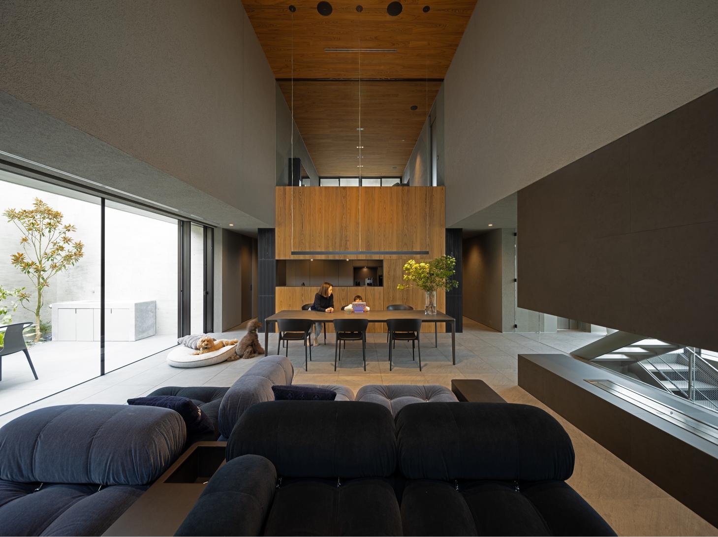 線路沿いに建つRC造3階建ての住宅。 周辺からの視線、騒音、振動、自然災害などの課題を解決しながら、開放的な室内空間を生み出すために、2階を主な居住空間としました。水平方向・垂直方向に光や風、視線が抜ける伸びやかな邸宅を実現しました。