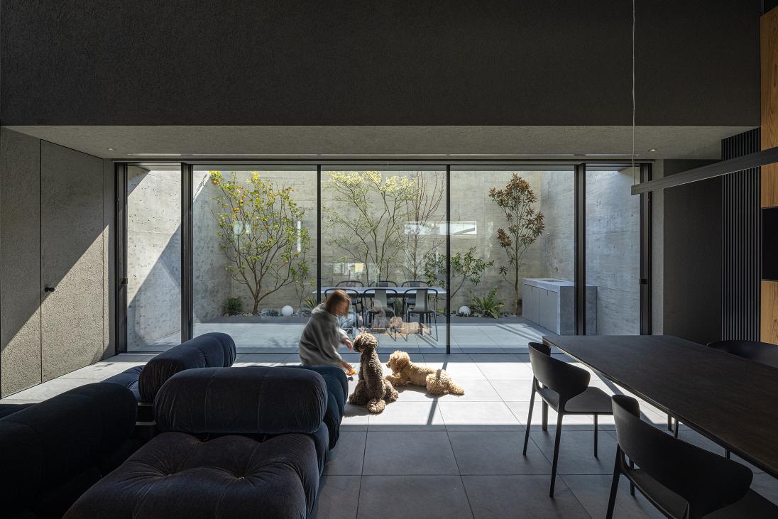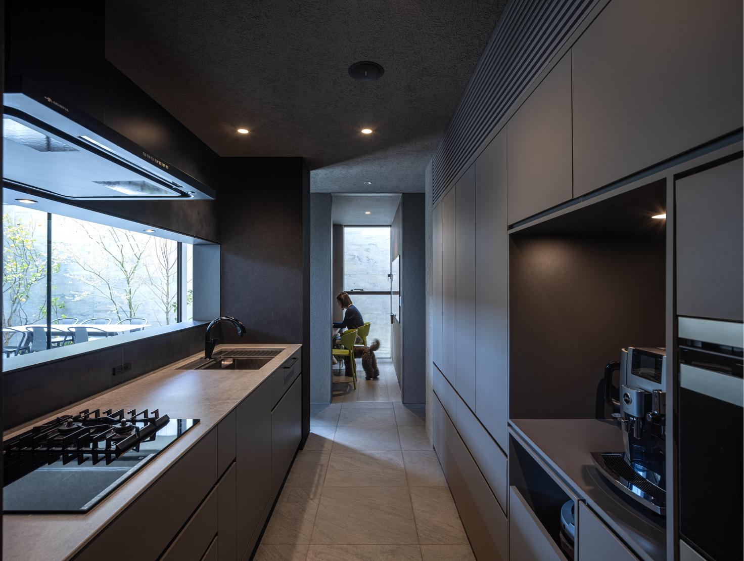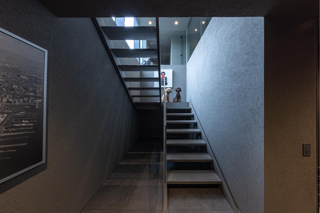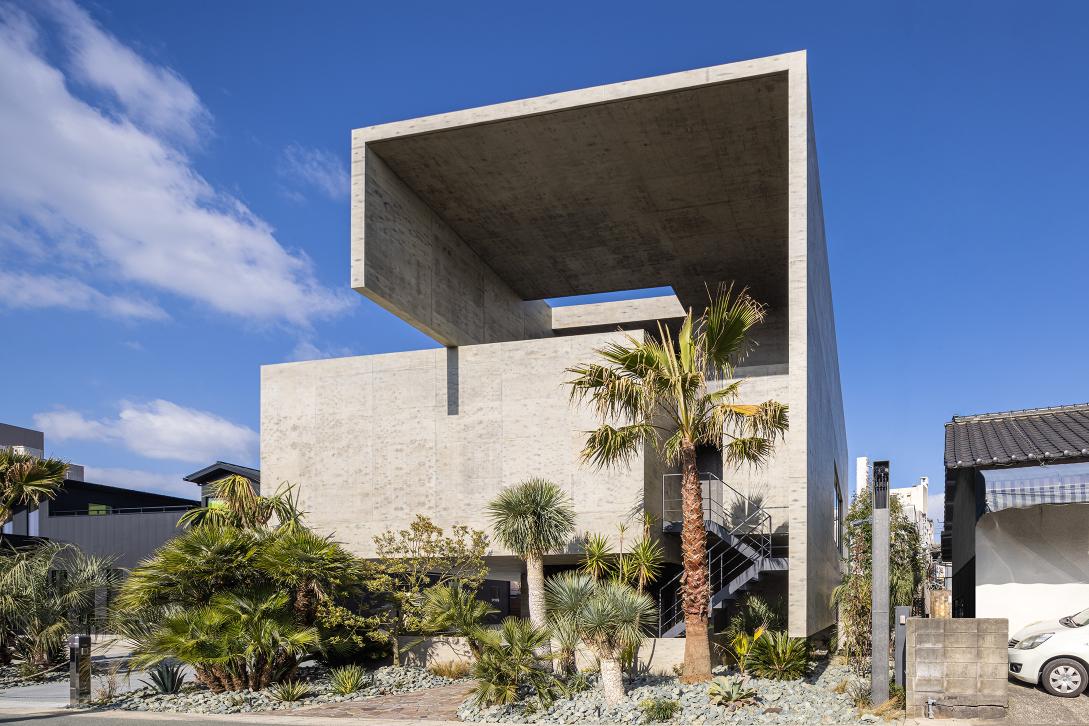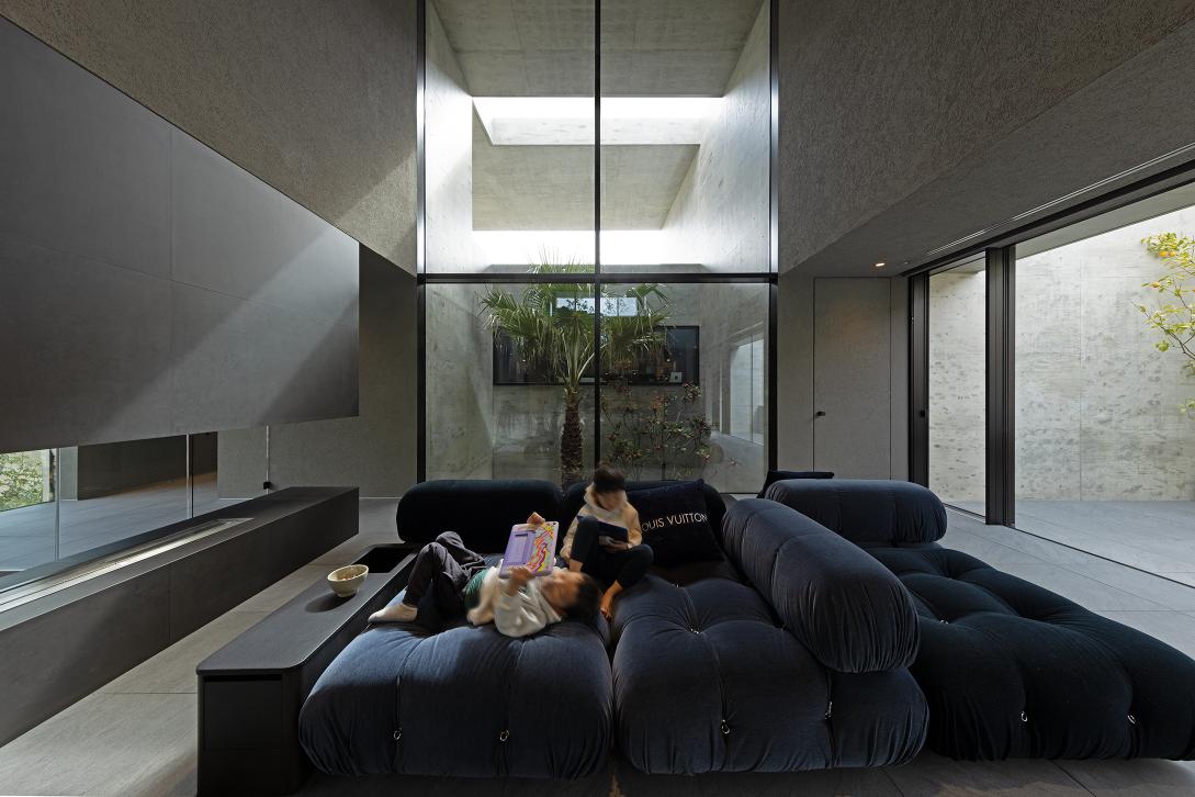 線路沿いに建つRC造3階建ての住宅。 周辺からの視線、騒音、振動、自然災害などの課題を解決しながら、開放的な室内空間を生み出すために、2階を主な居住空間としました。水平方向・垂直方向に光や風、視線が抜ける伸びやかな邸宅を実現しました。