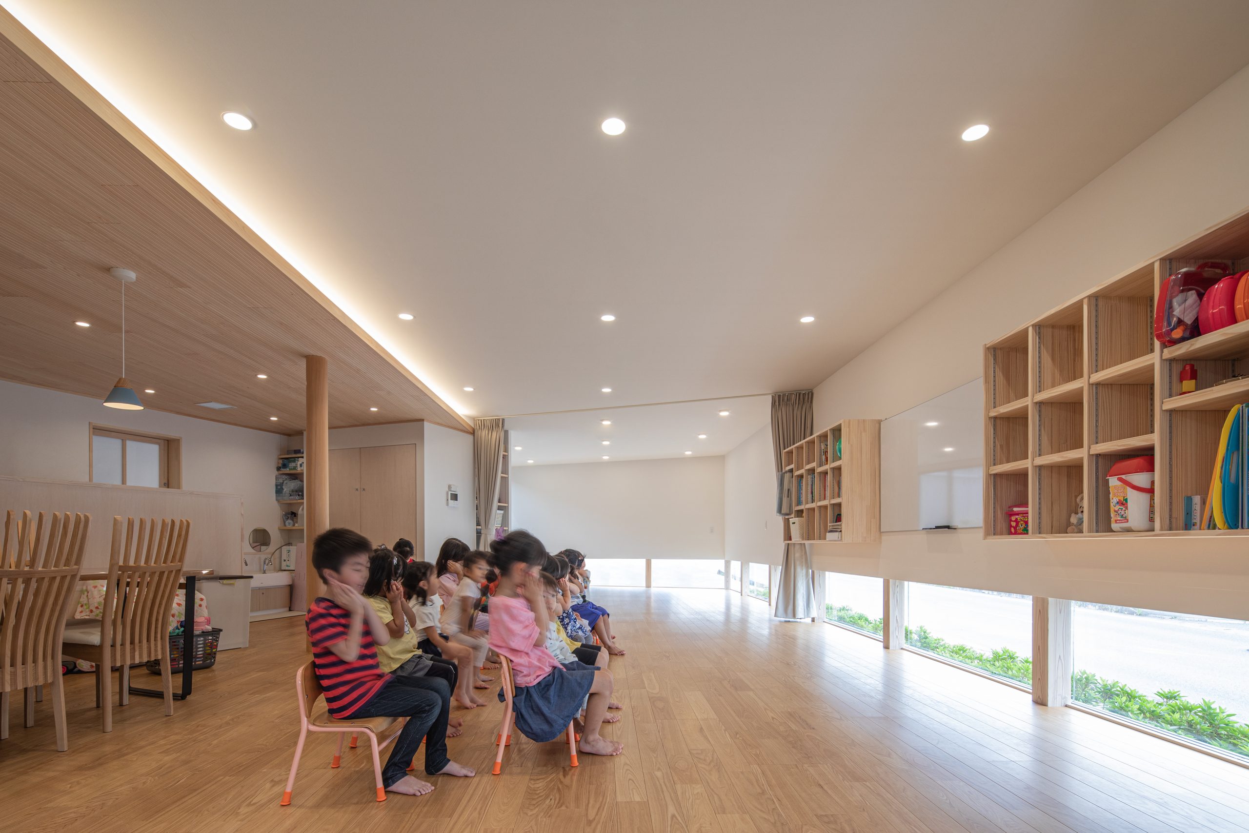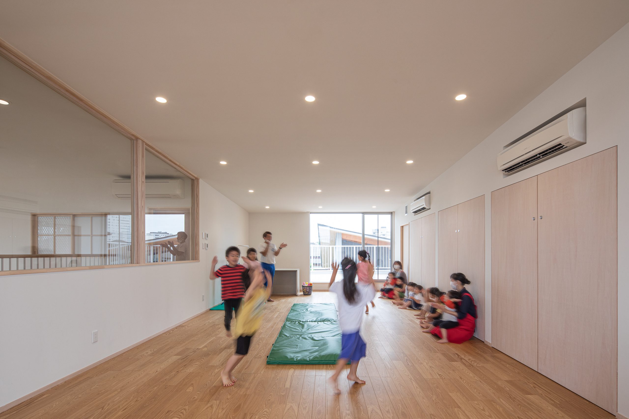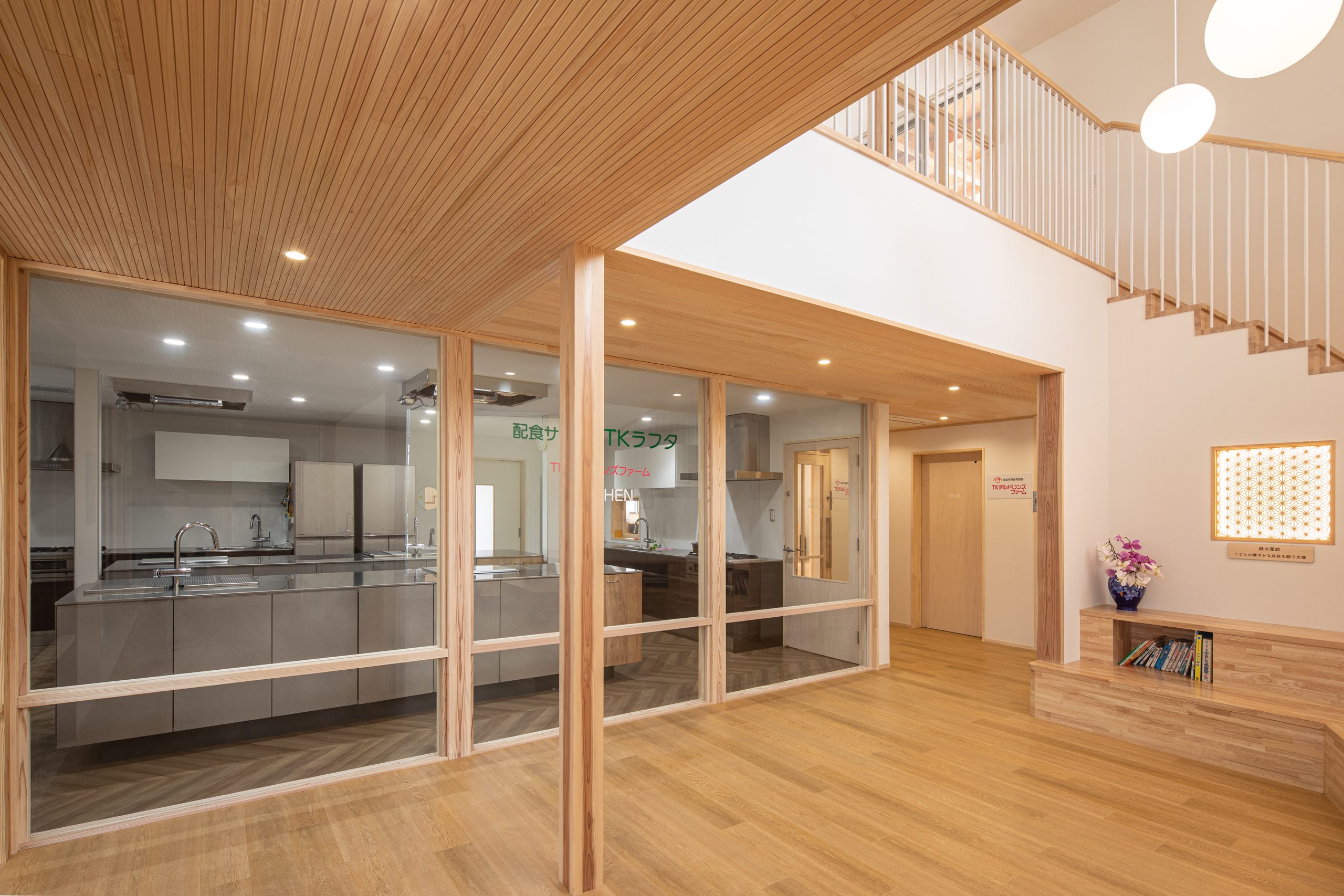 TKオフィス様の複合施設です。高度保育教育施設のTKチルドレンズファームでは、明るく柔らかな光が満ちる吹抜けと、壁の下部に設けた窓など、空間に子どもたちの好奇心をそっと育むための工夫をちりばめました。