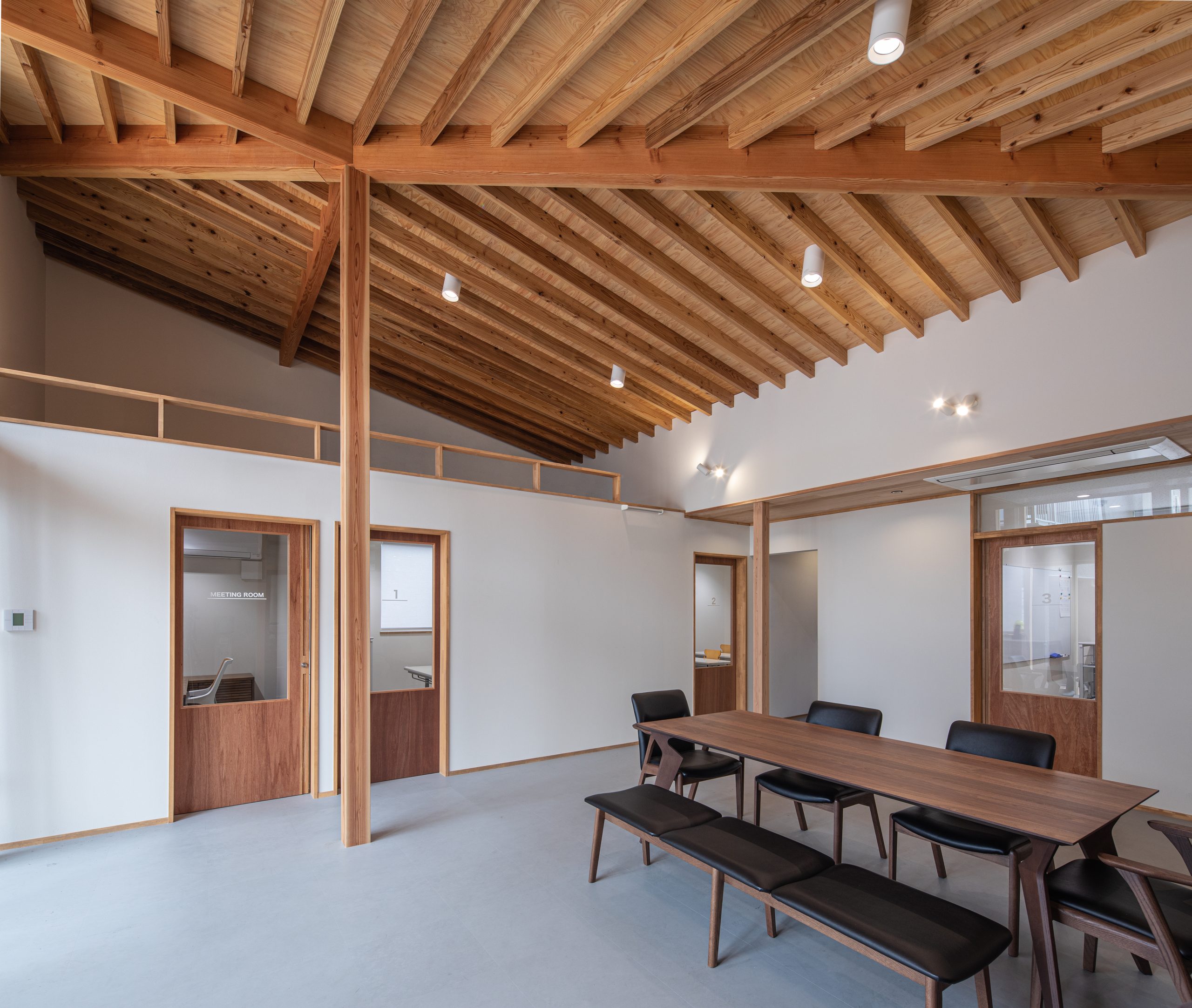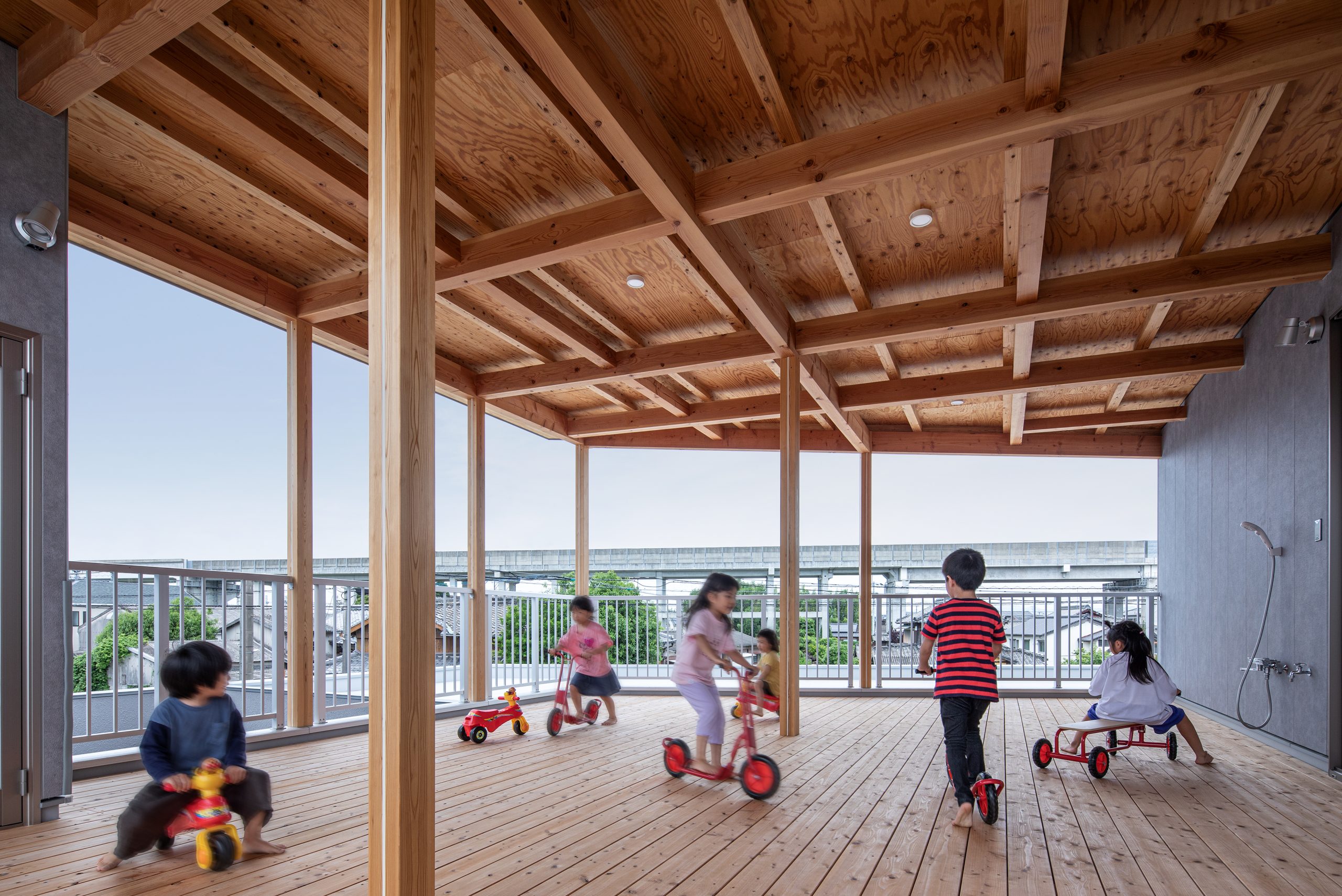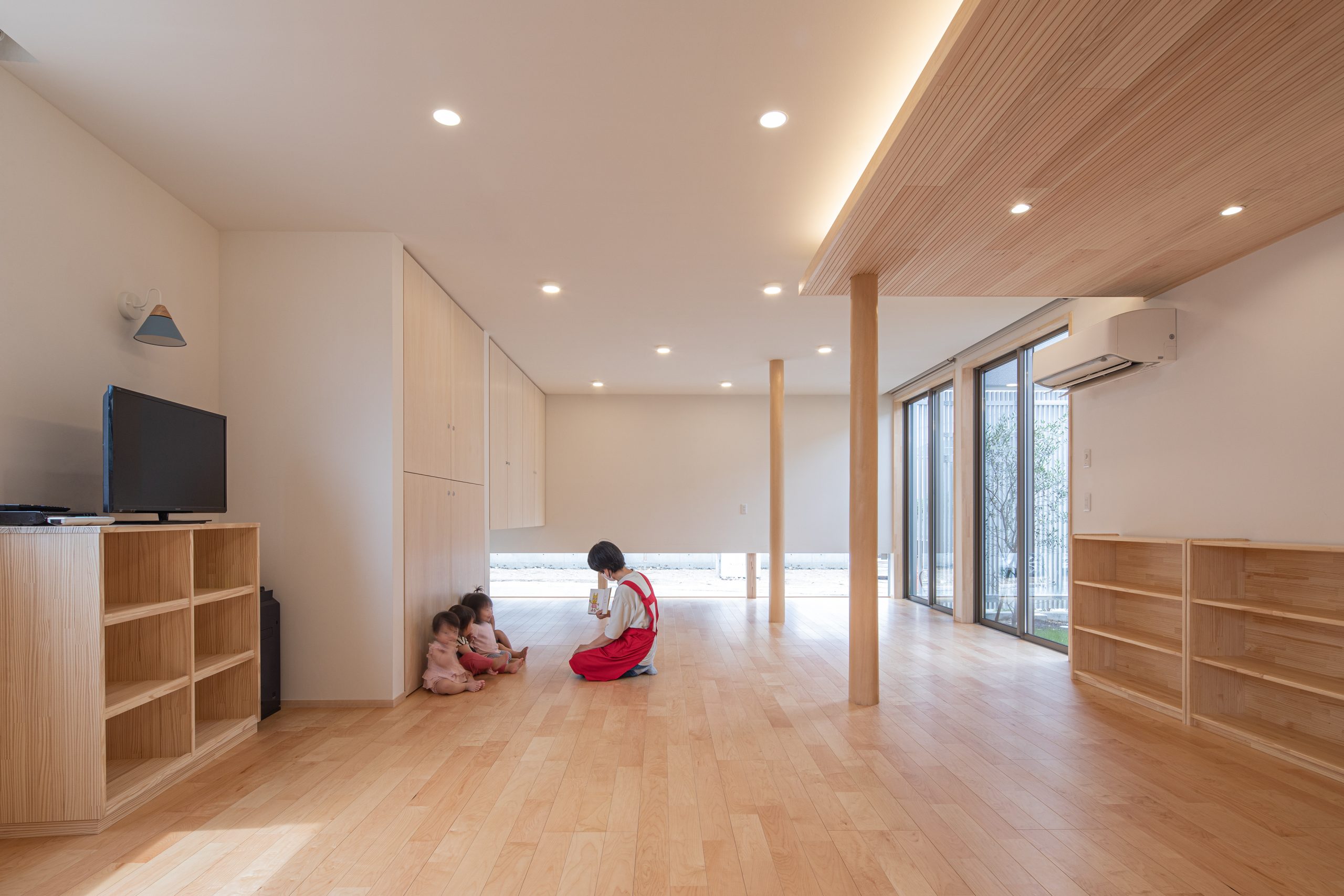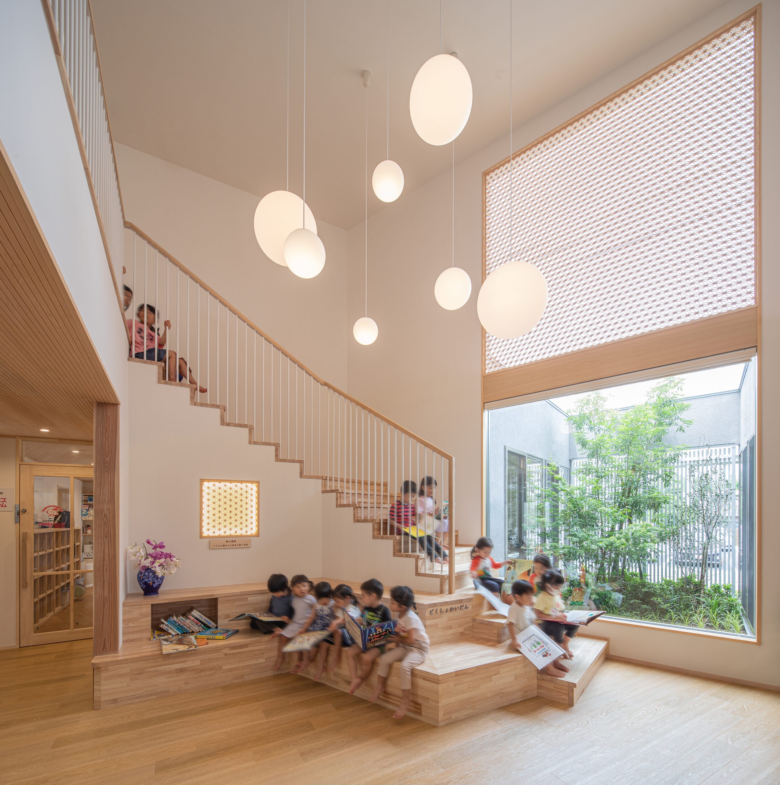 TKオフィス様の複合施設です。高度保育教育施設のTKチルドレンズファームでは、明るく柔らかな光が満ちる吹抜けと、壁の下部に設けた窓など、空間に子どもたちの好奇心をそっと育むための工夫をちりばめました。