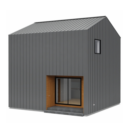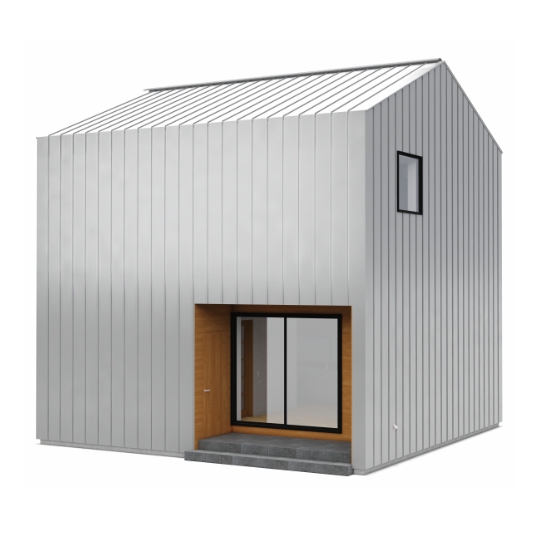 屋根と壁にガルバリウム鋼板、アクセントで玄関周りを木にすることで、
