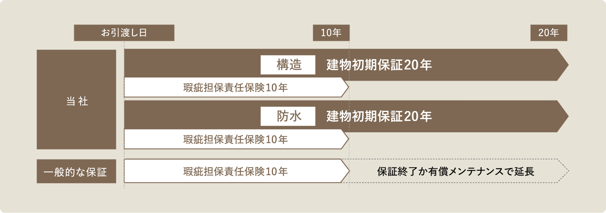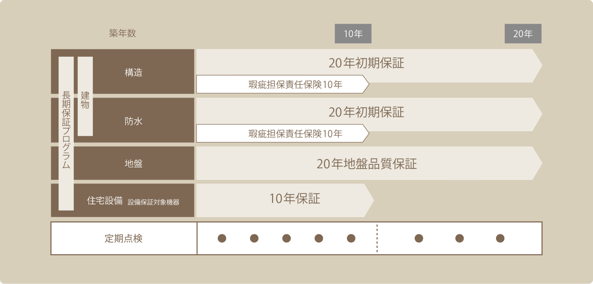 確かな住宅性能と定期的な点検・メンテナンスにより初期保証20年をご提供します。建物品質保証では構造耐力上主要な部分や雨水の浸入を防止する部分の品質を保証します。 万が一構造的な欠陥があった際には、原状回復工事を実施いたします。