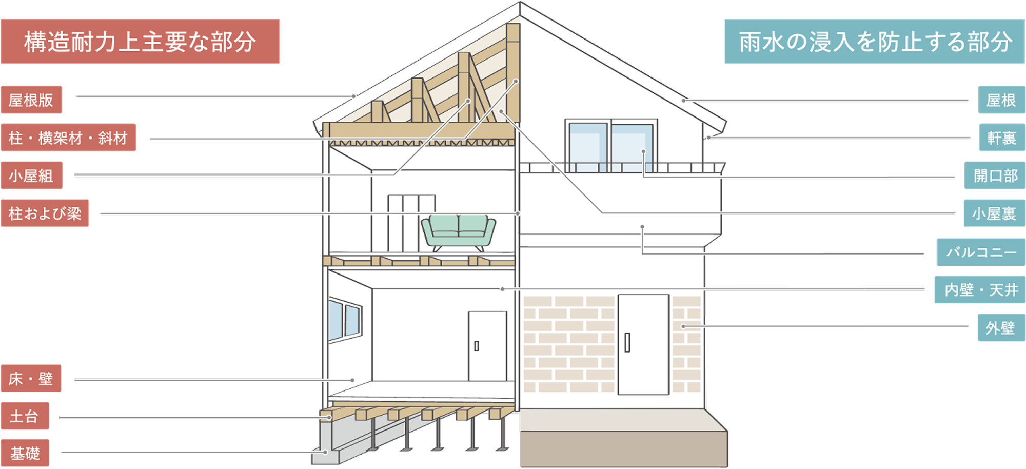対象となるものは、構造耐力上主要な部分と雨水の侵入を防止する部分です。